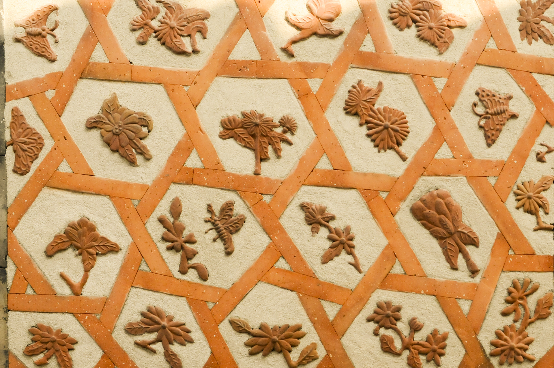 평면보다 도드라지게 새긴 양각 형태로 각종 꽃문양과 나비를 넣어 단조로울수 있는 담장을 아름답게 꾸몄다. 석쇠무늬 속의 꽃은 행복을 상징한다.