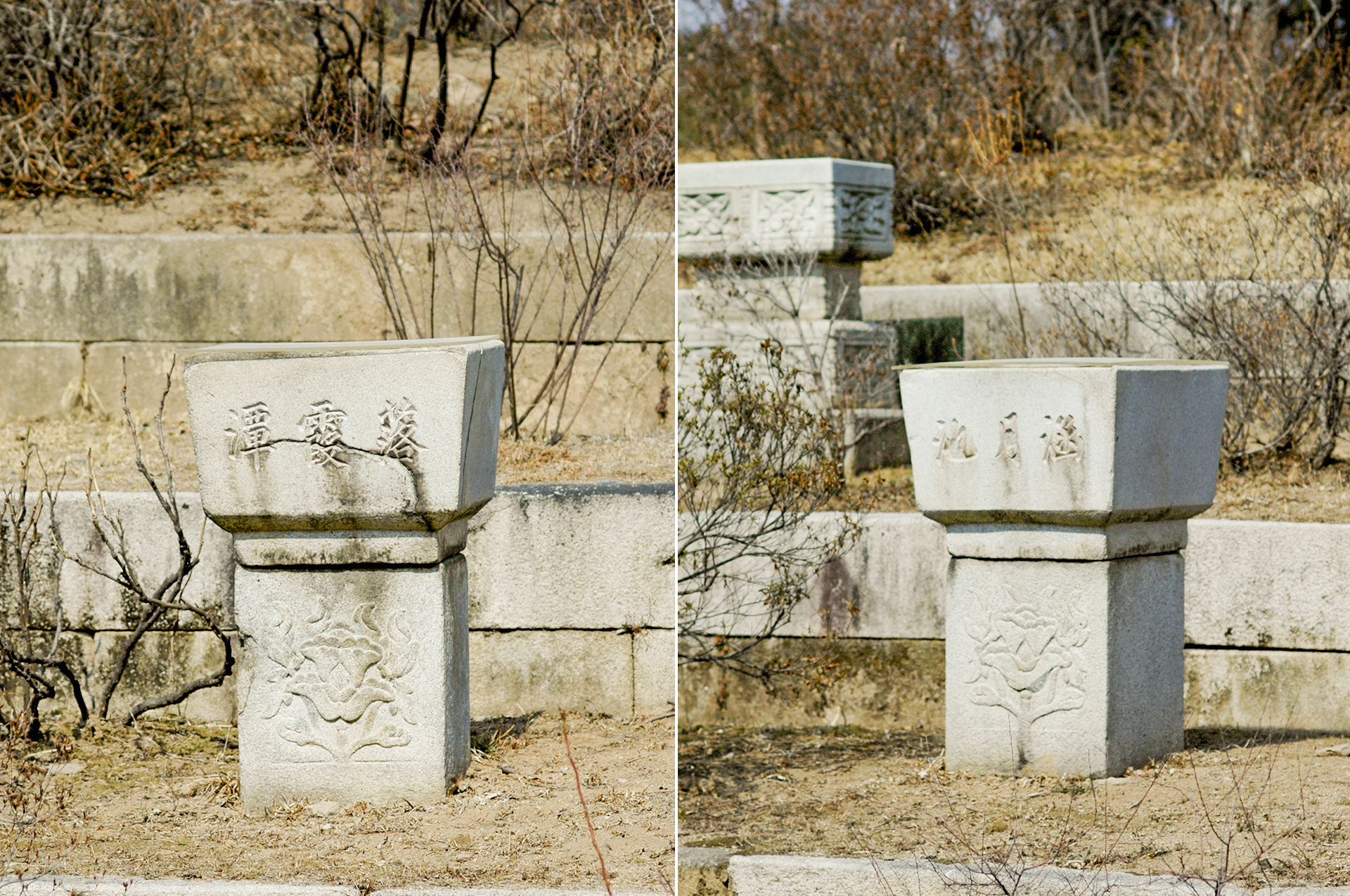 연꽃 받침의 연지 두 개를 가장 아랫단에 놓았다. 이 안에 물을 담아놓고 교태전 지붕위로 달이 떠올라 연지 안에 비치는 모습을 기다리는 마음을 누가 알 수 있을까...
