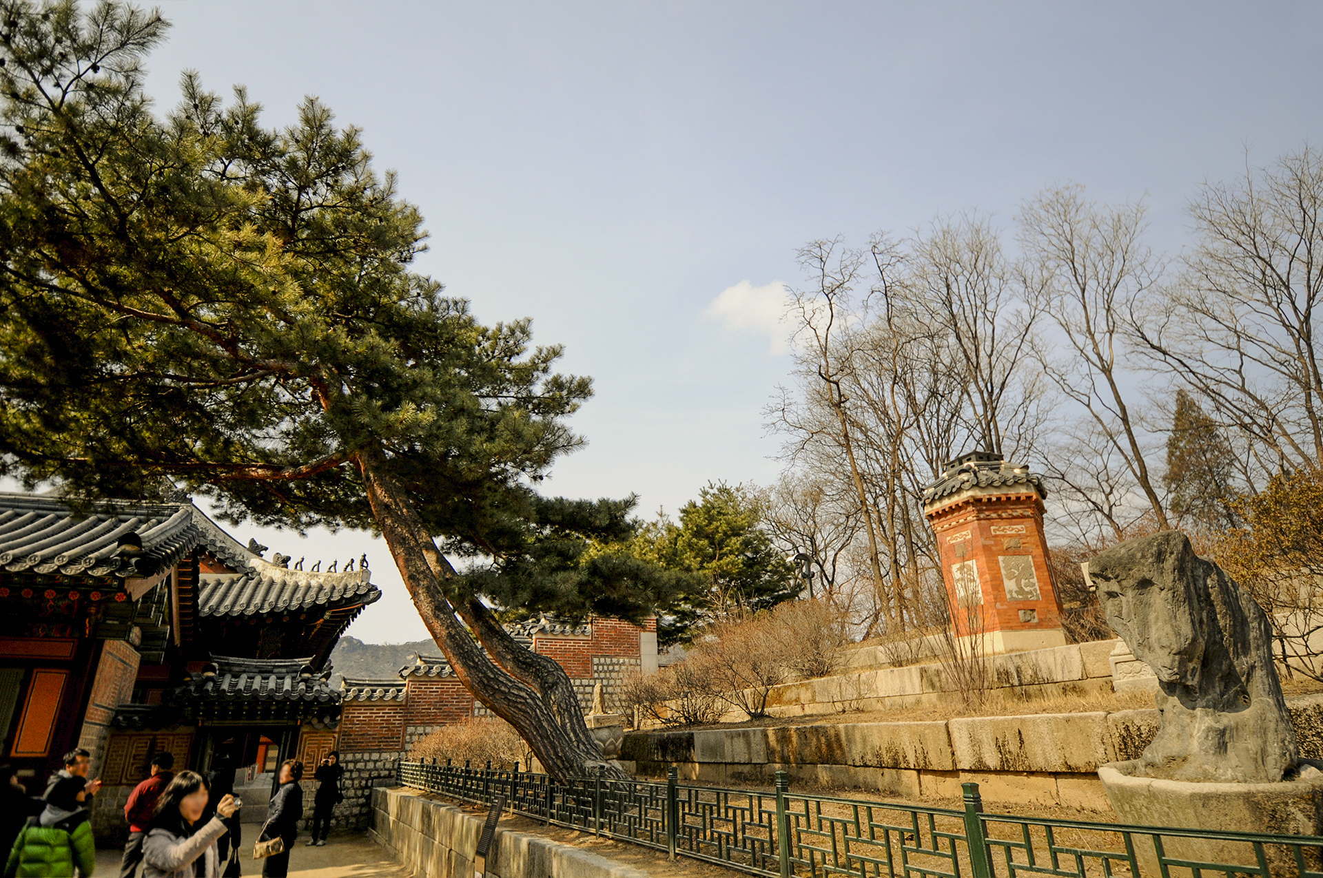 시대가 변해서 이제는 오지 않을 왕비를 기다리기라도 하는듯 키 큰 소나무 2그루가 밖으로 크게 휘어져 있다.