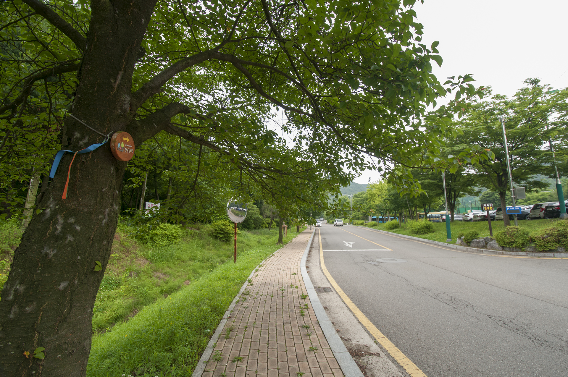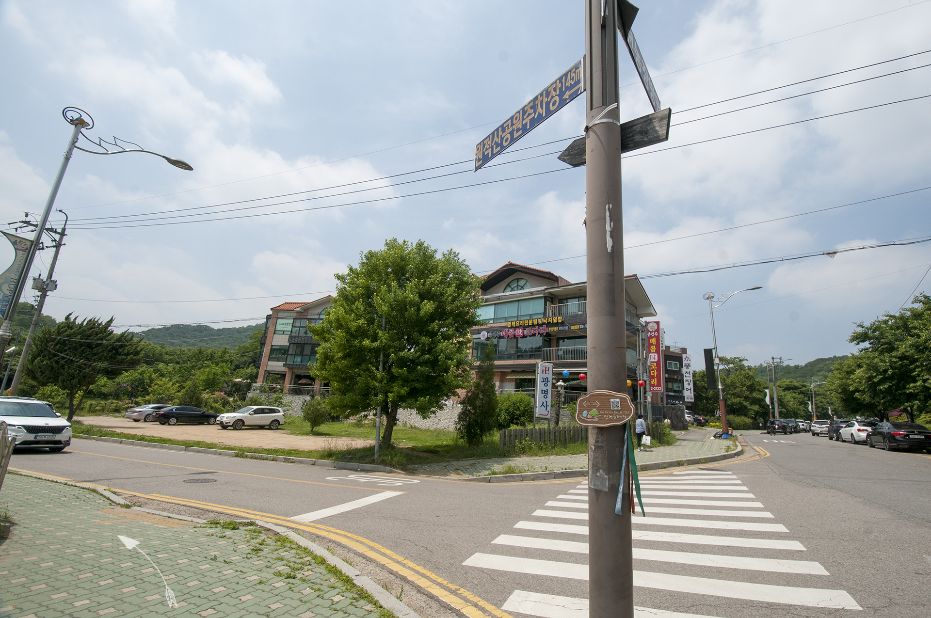 아침에 내비를 찍고 갔던터라 눈여겨보지 않았던 길, 횡단보도 앞에 둘레길 로고가 걸려있고, 주차장까지 이제 145m 남았다.