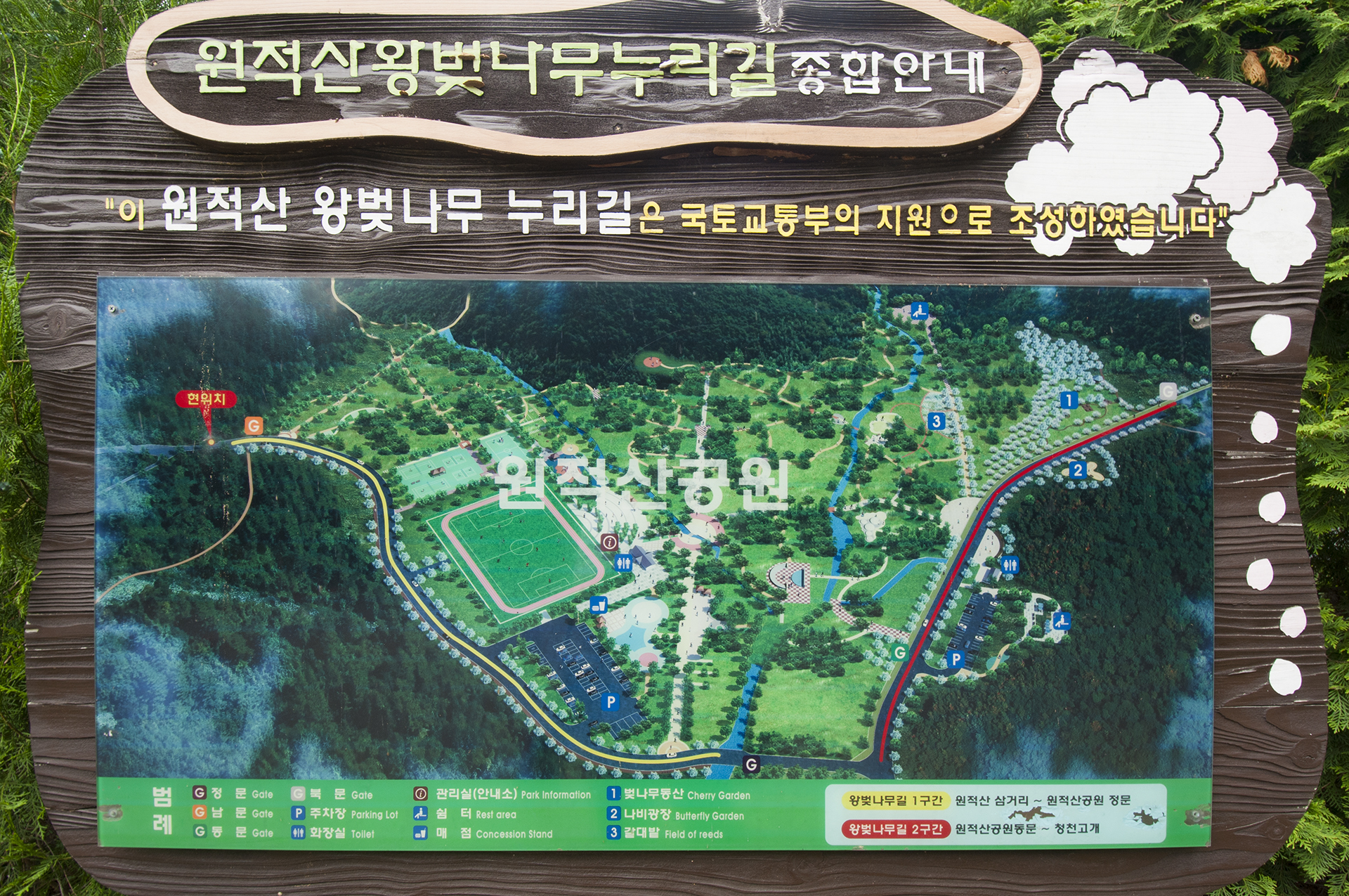 이 길은 원적산 왕벚나무누리길로 정문에서 원적산 삼거리까지가 1구간, 동문쪽이 2구간으로 나뉘어져 있다.