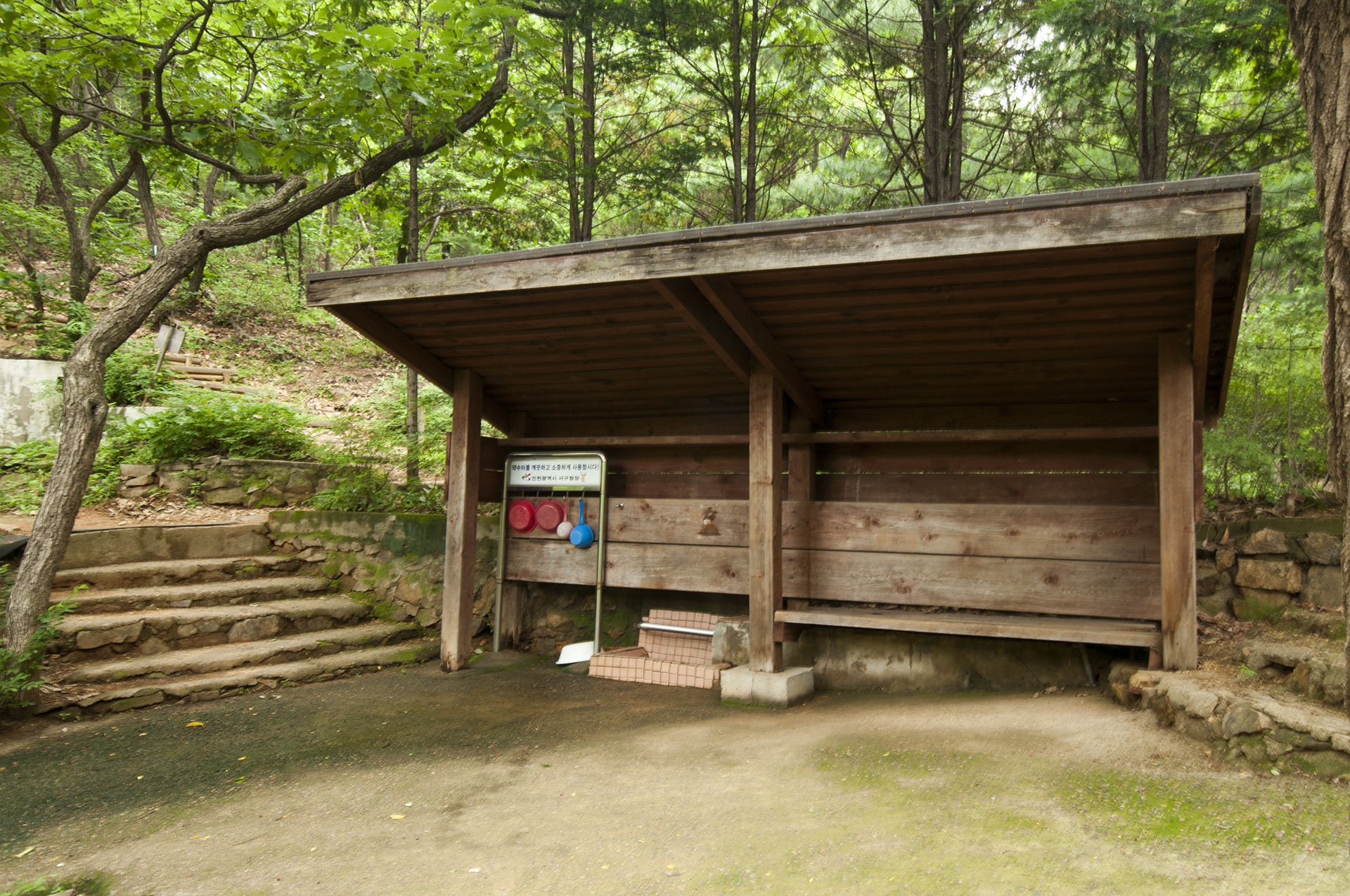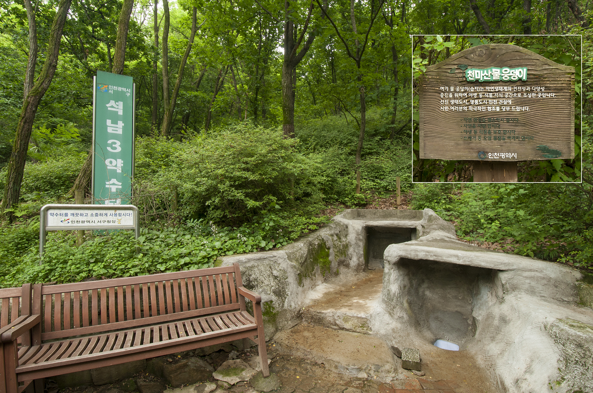 깨끗하게 정비된 약수터, 물이 졸졸졸 흘러 나오고, 야생 동식물을 위한 물웅덩이도 있다.