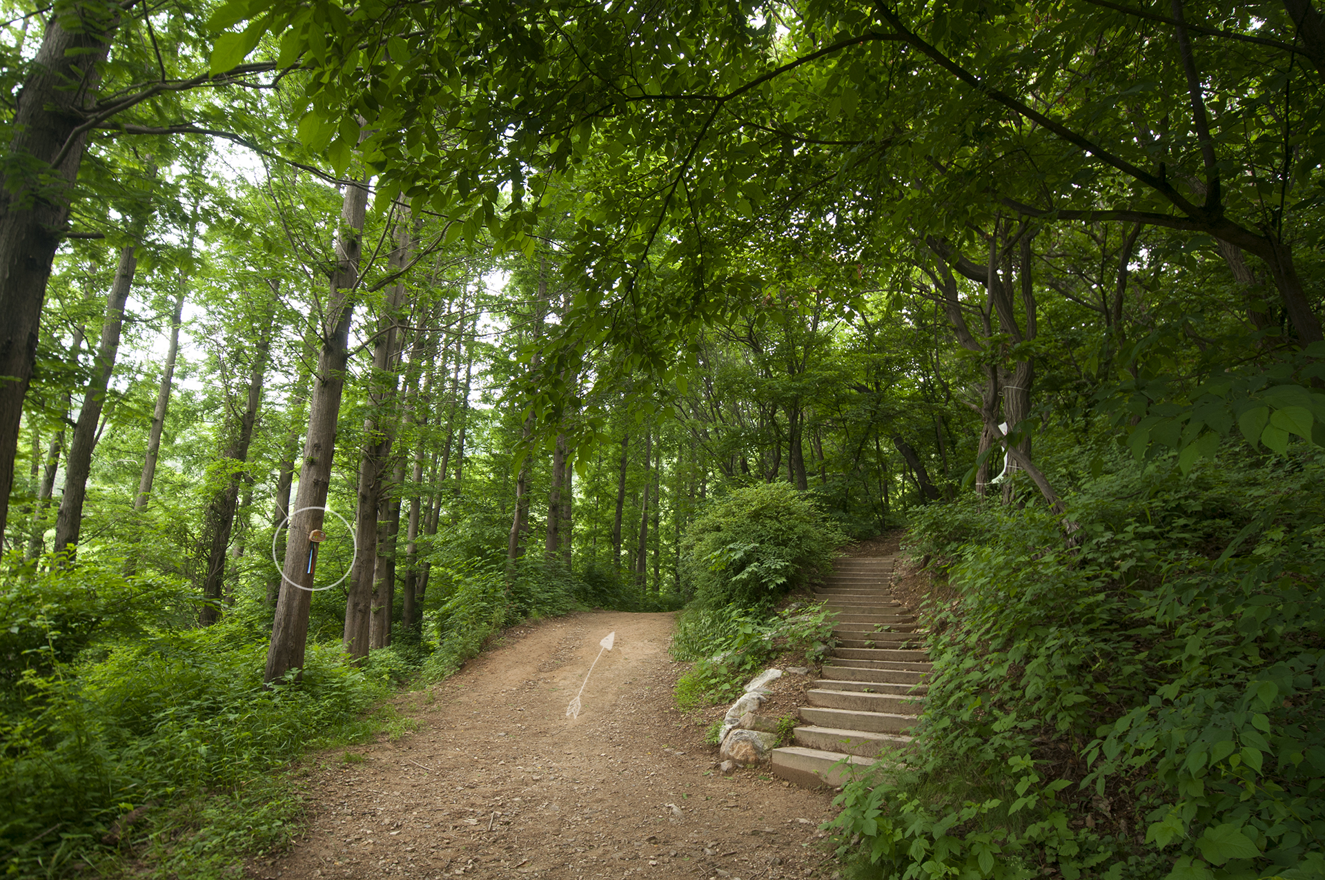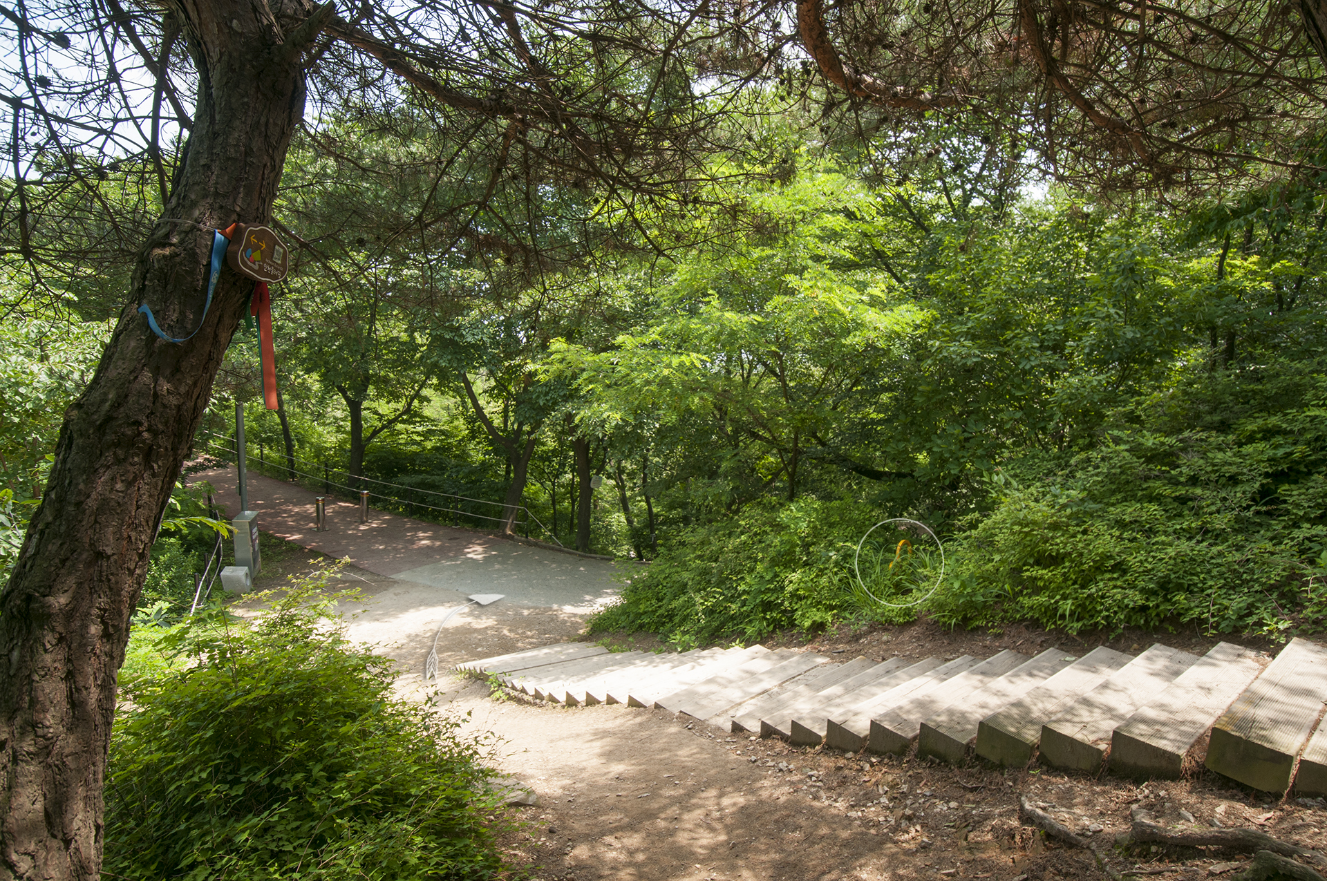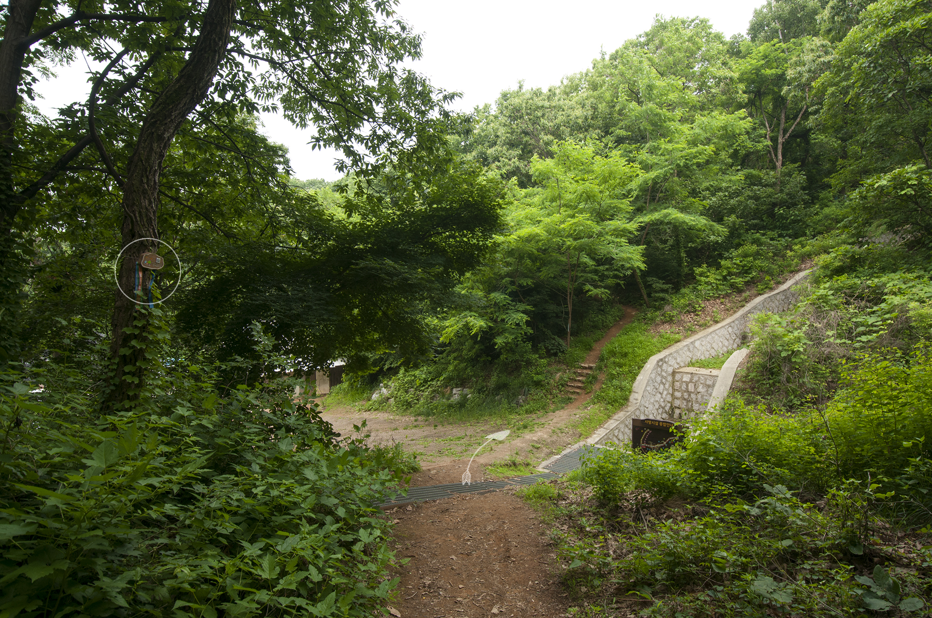 여기서 우측 숲길 둘레길로 들어선다. 입구에 둘레길 마스코트와 로고, 리본이 걸려 있지만 눈여겨 보지않으면 못찾을수도 있다.