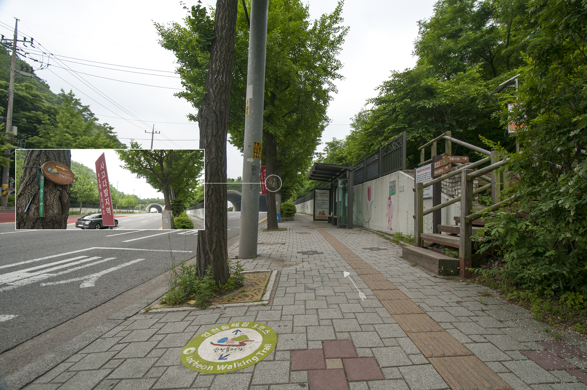 09:21분 도착, 인도에 표시되어 있는 인천둘레길 3코스, 앞에 생태통로가 보이고 이곳이 3코스의 공식 시작점이 된다.