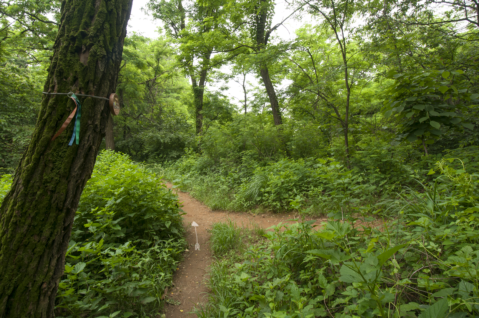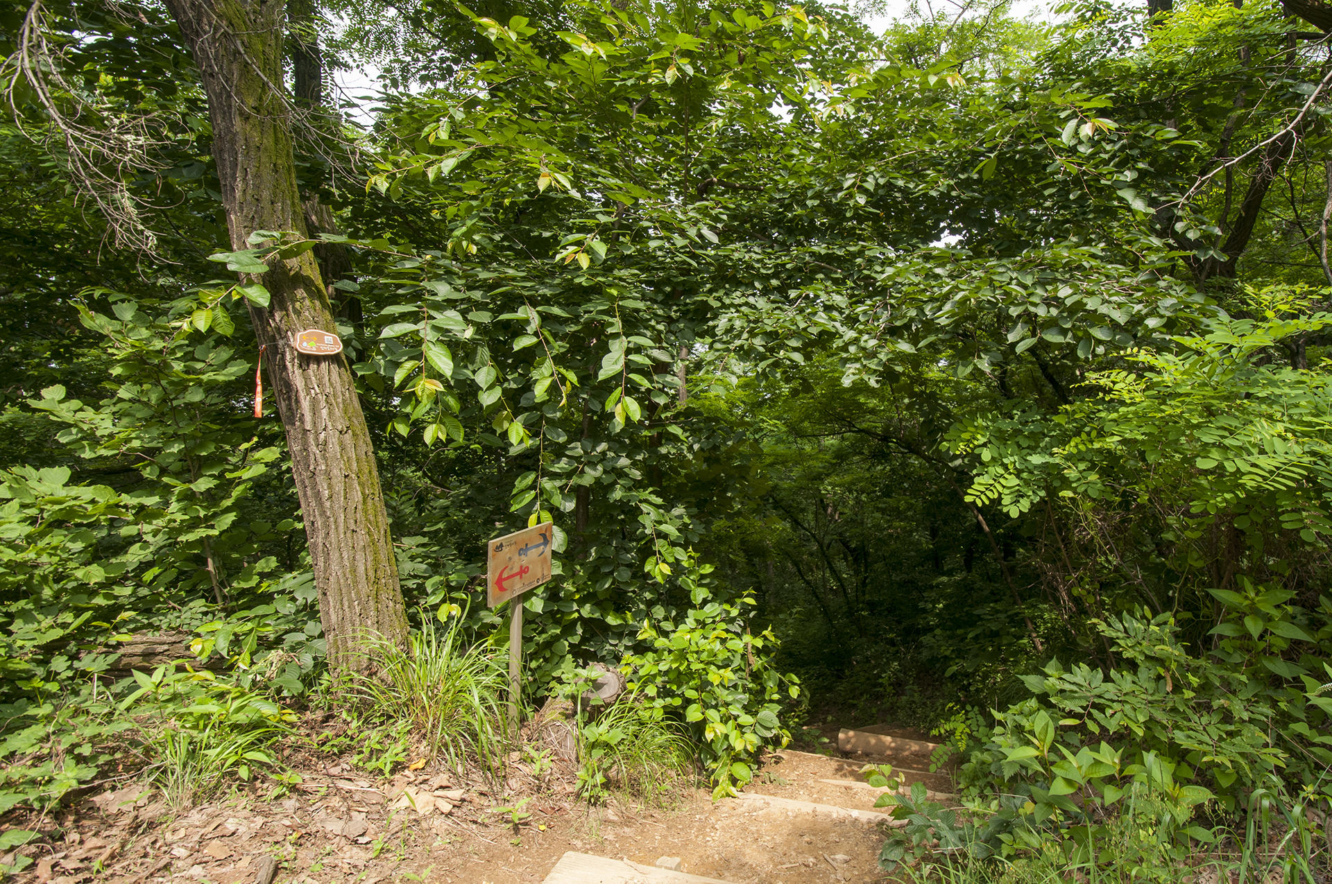 숲길로 들어서자 나뭇가지에 파묻힌 닻이정표가 보일락말락 설치되어 있고, 나무에 리본이 매달려 있다.