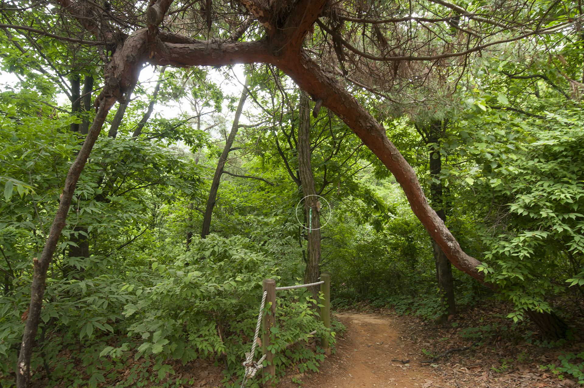 지팡이를 짚은 채 크게 휘어진 소나무 아래로 들어서면 로고와 리본이 걸려 있다.