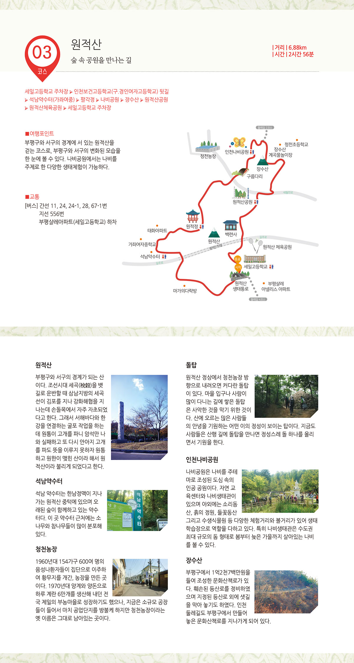 원적산공원 정문주차장 - 원적산체육공원 - 생태통로(세일고) - 철마약수터 - 마가의다락방 - 석남3약수터 - 석남배수지입구 - 원적정 - 장수산 연결다리 - 인천나비공원 - 장수산 하늘다리 - 정문주차장