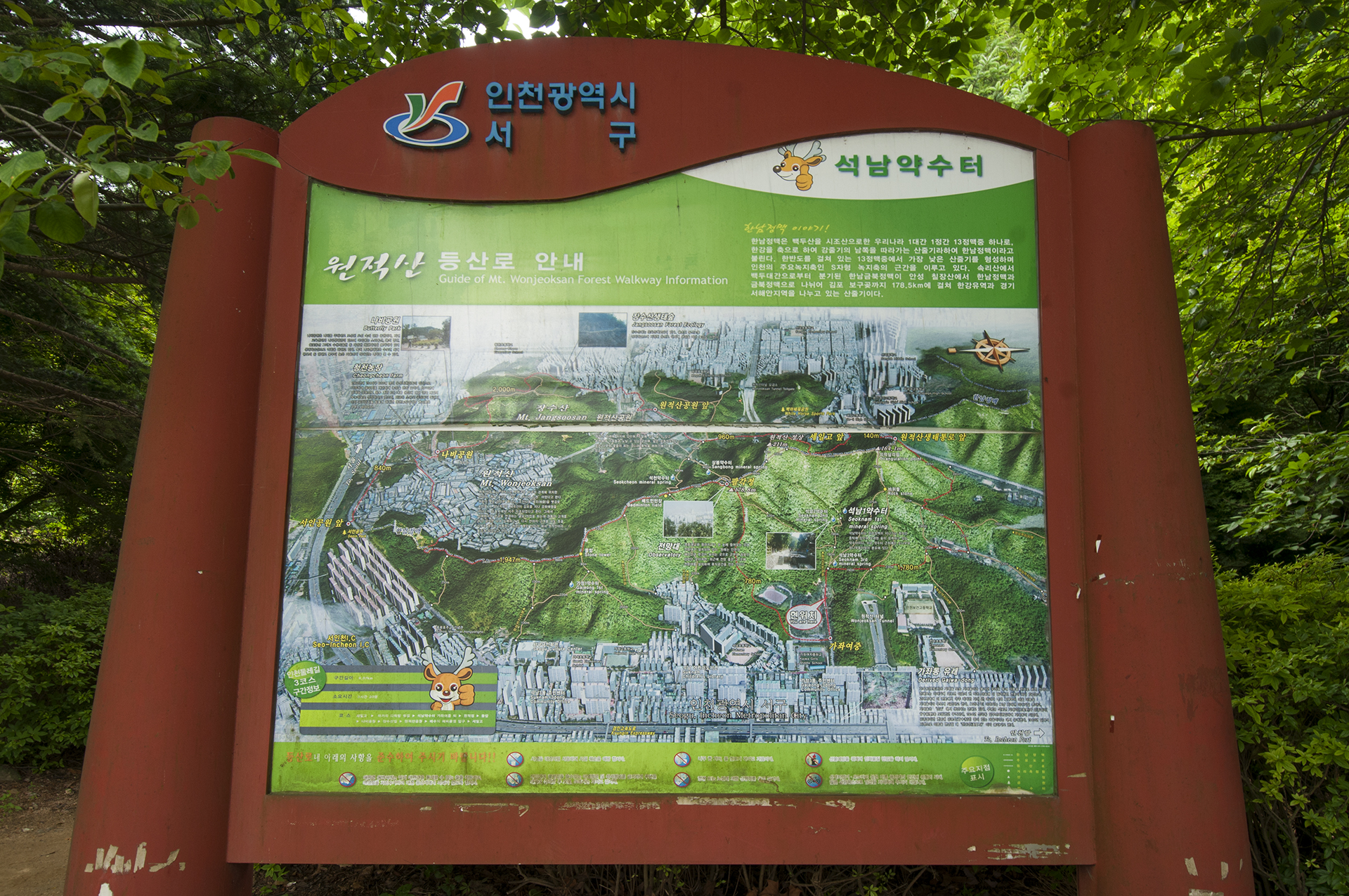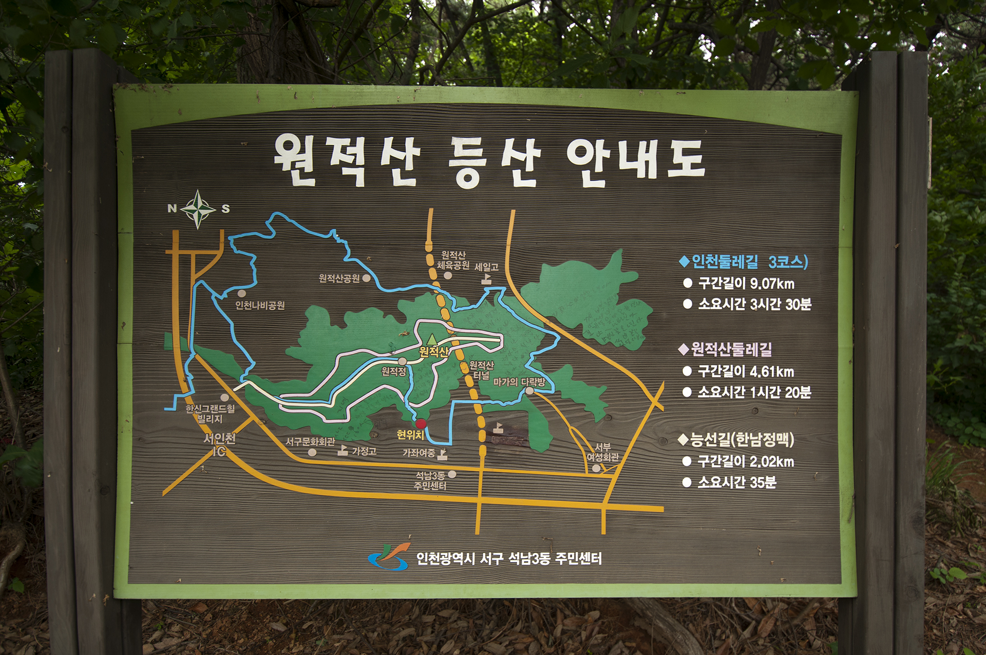 그 옆에 설치된 등산 안내도에는 원적산 둘레길과 인천둘레길 3코스, 인천종주길(능선길)이 함께 표시되어 있다.
