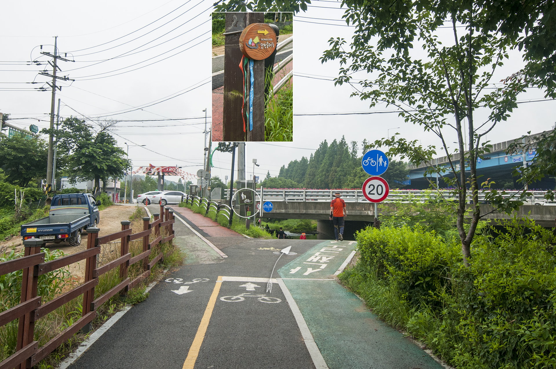 삼거리에서 둘레길 로고를 따라 좌측으로 다리를 건너간다.