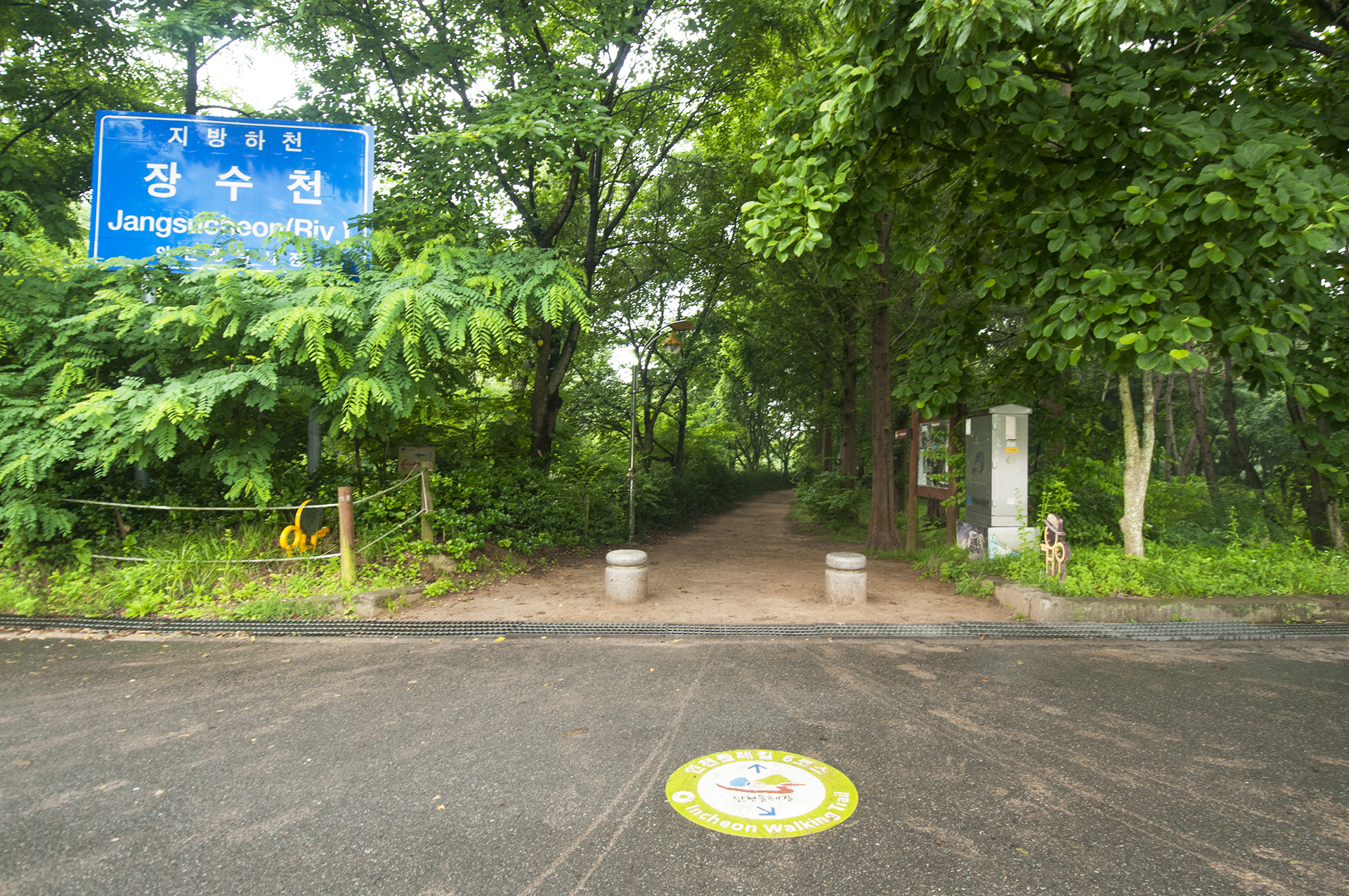 자전거대여소 앞에서 광장을 걸어 좌측으로 가면 인천둘레길안내소가 있고, 그 옆에 장수천 입구가 있다.