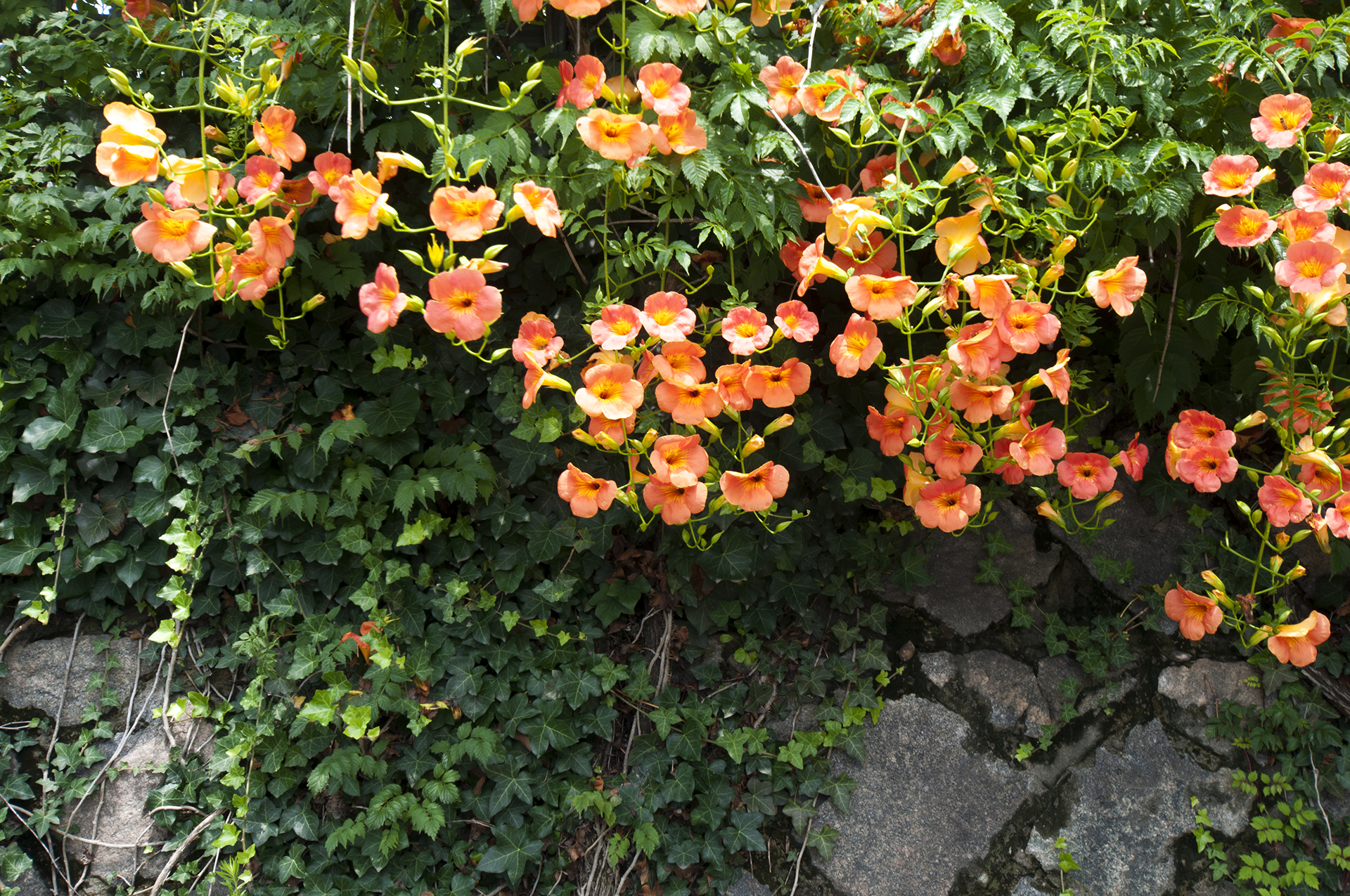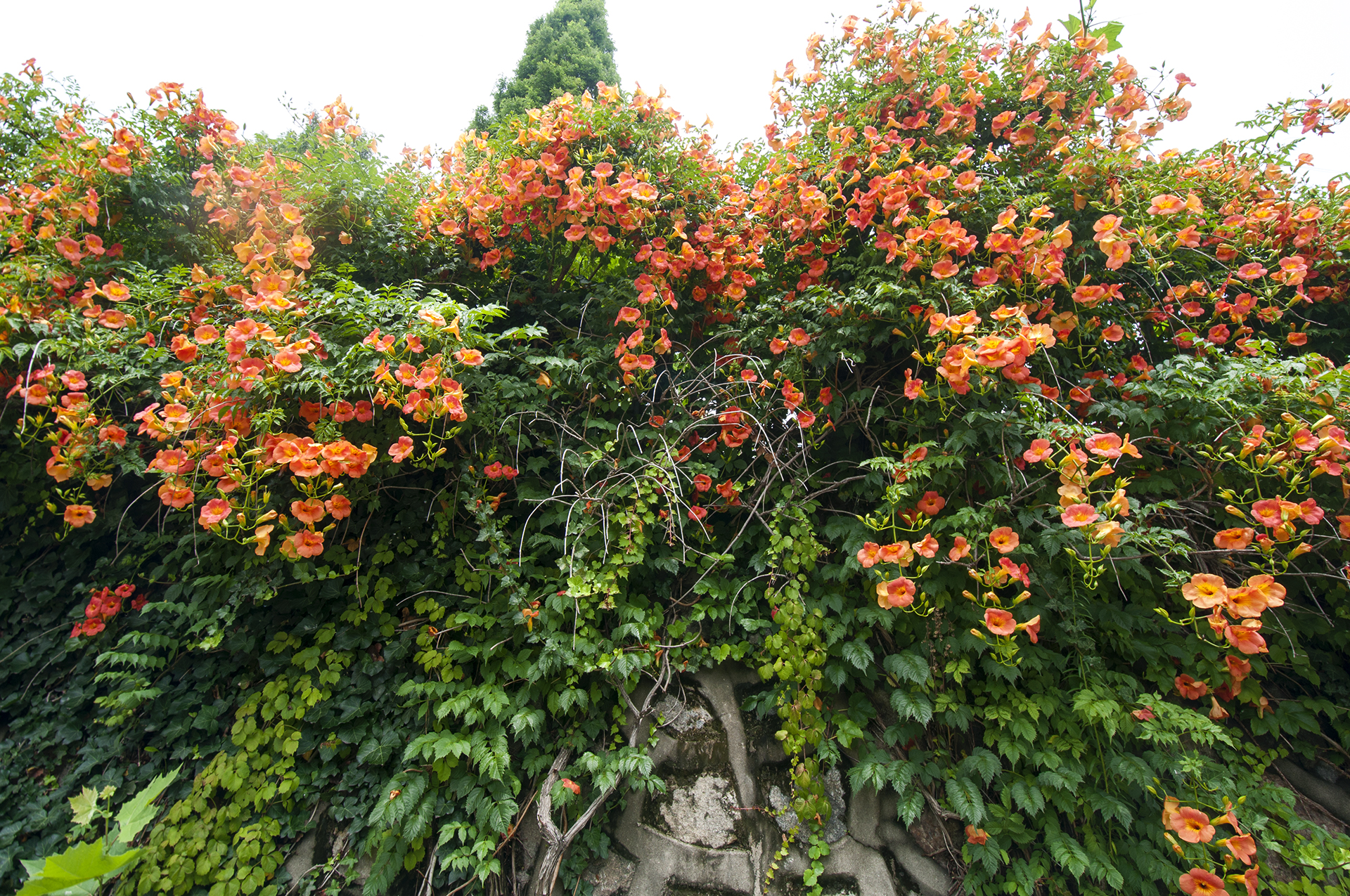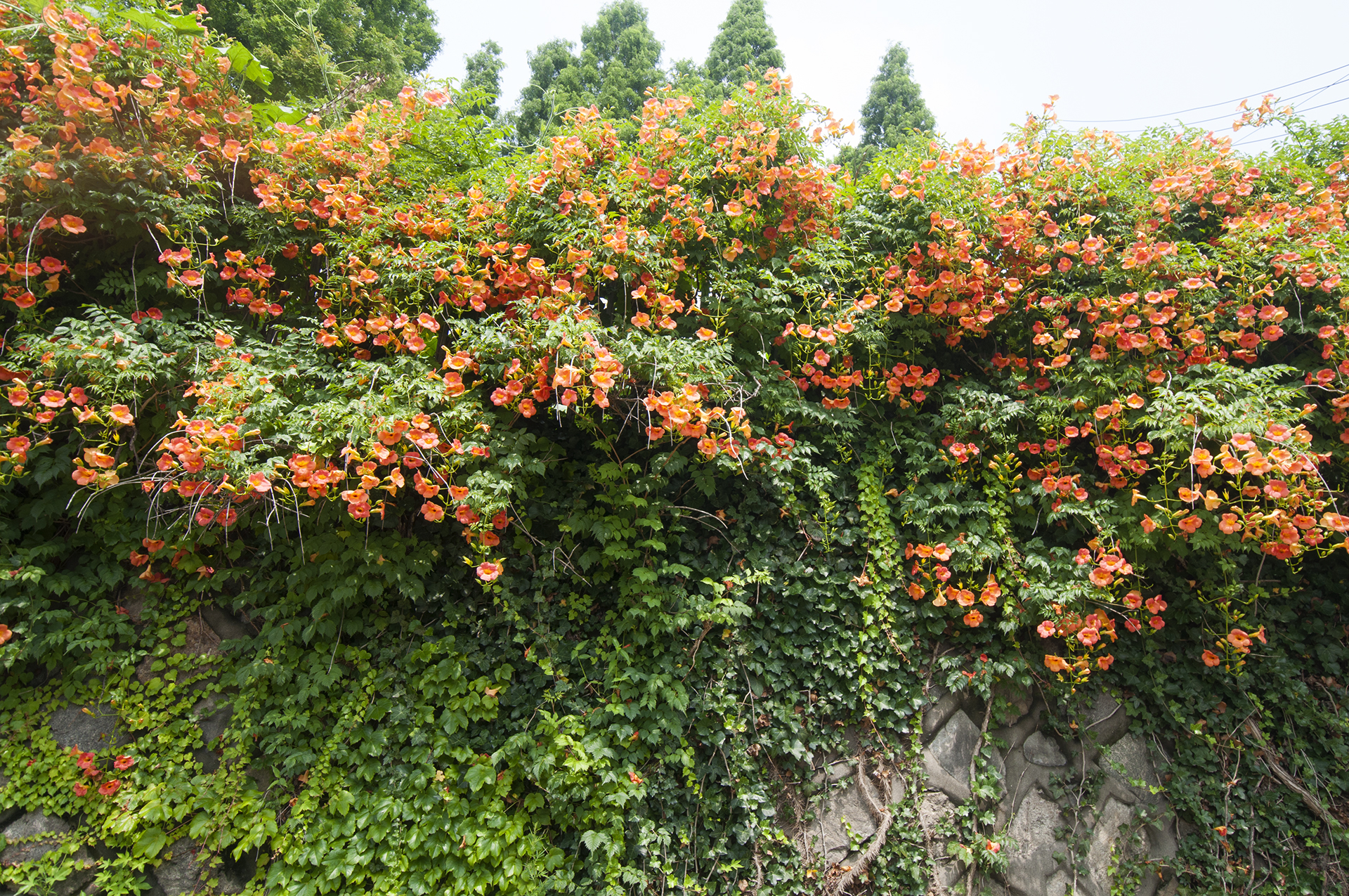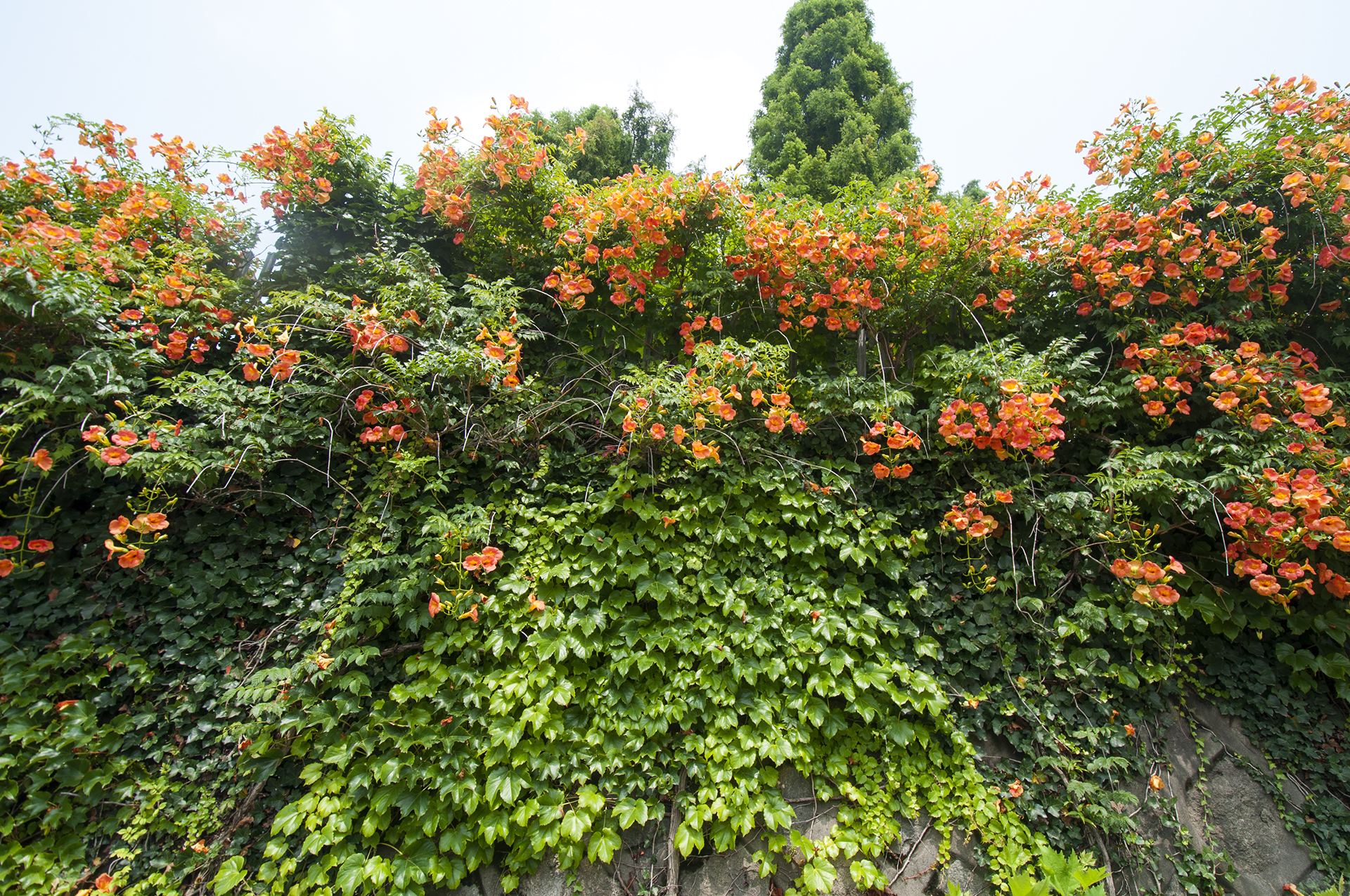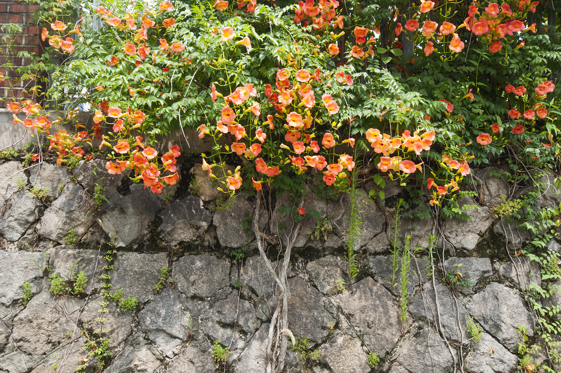 능소화는 벽을 타고 올라가는 덩굴식물이다.