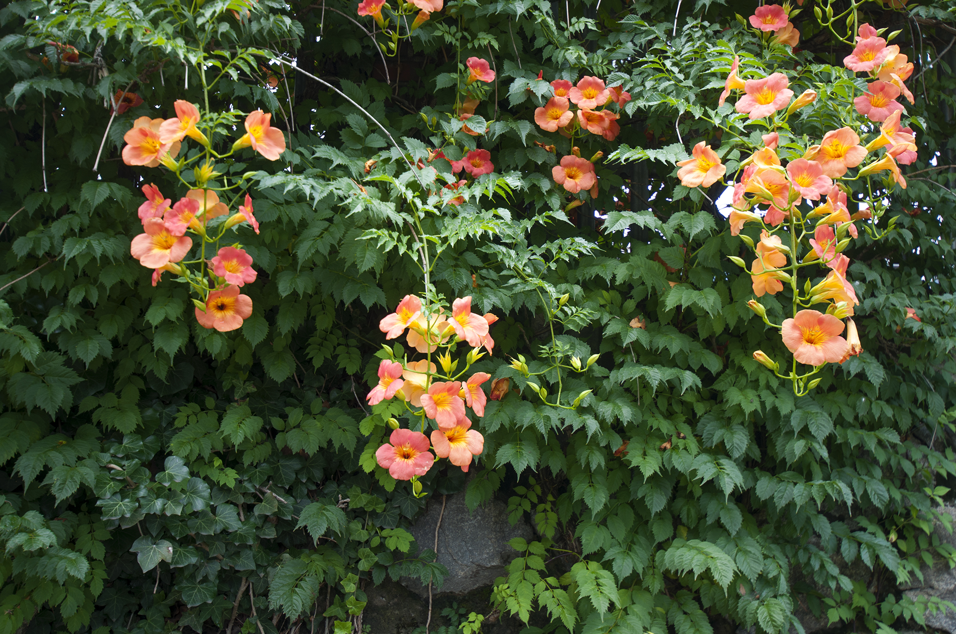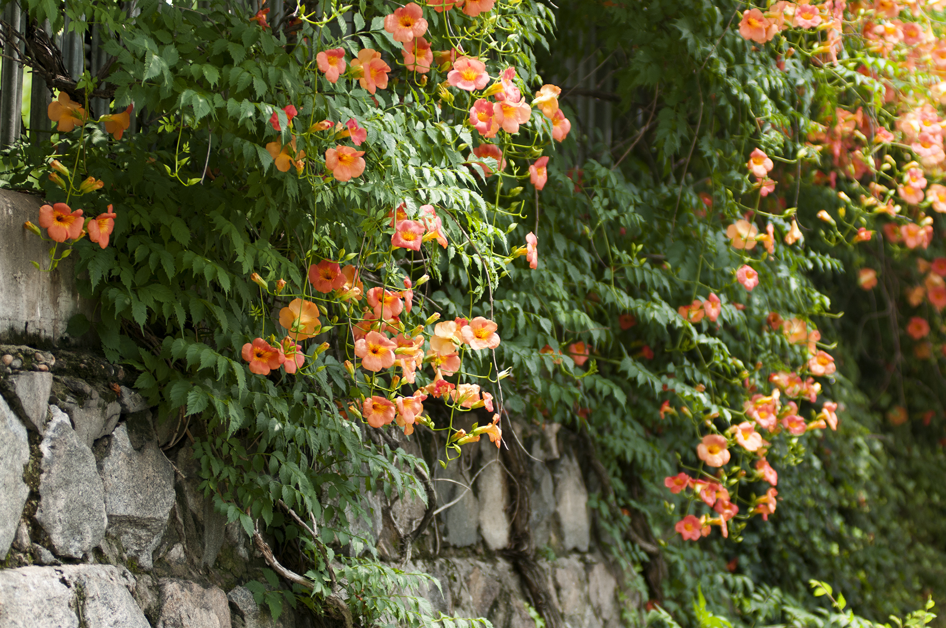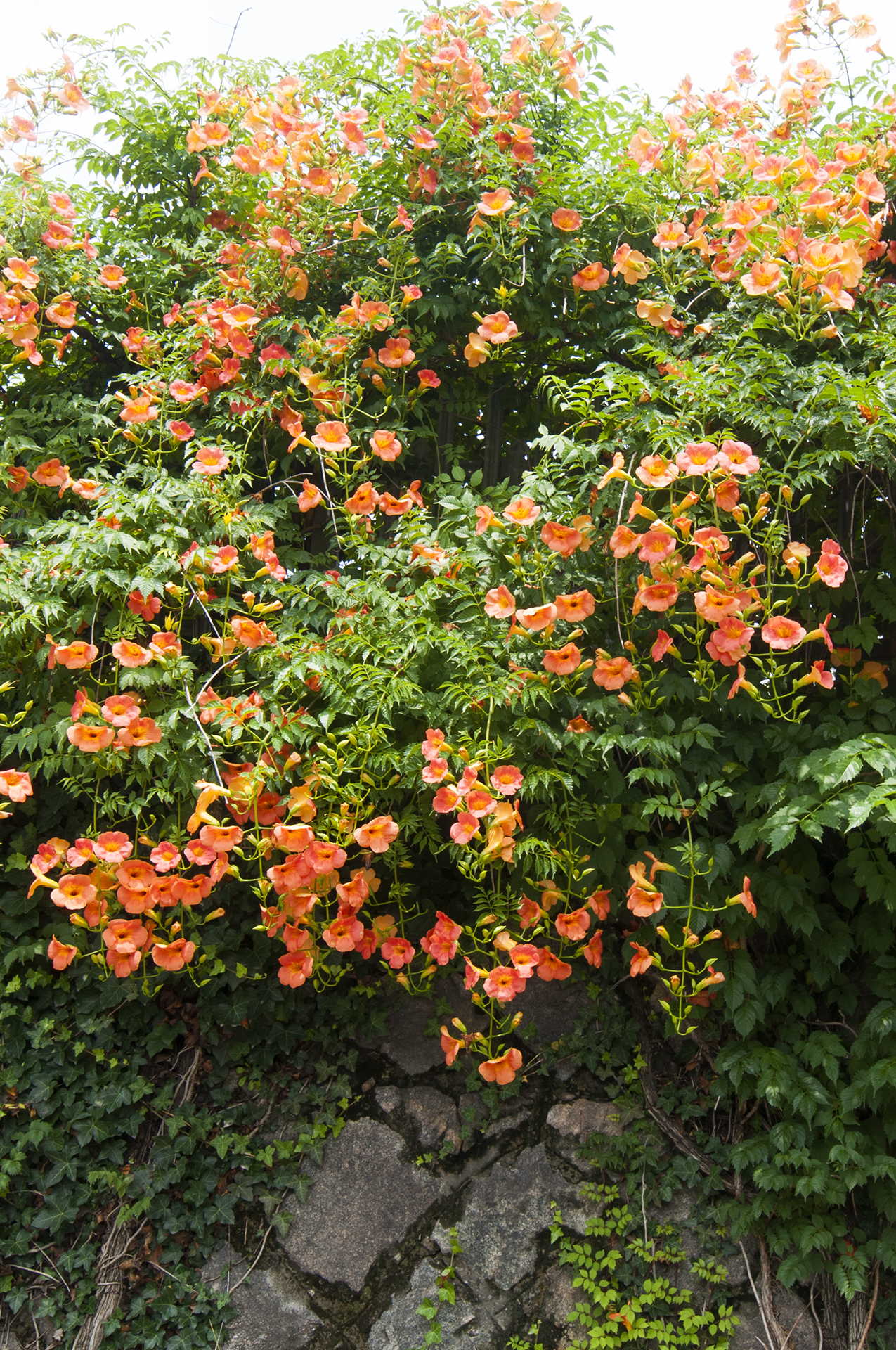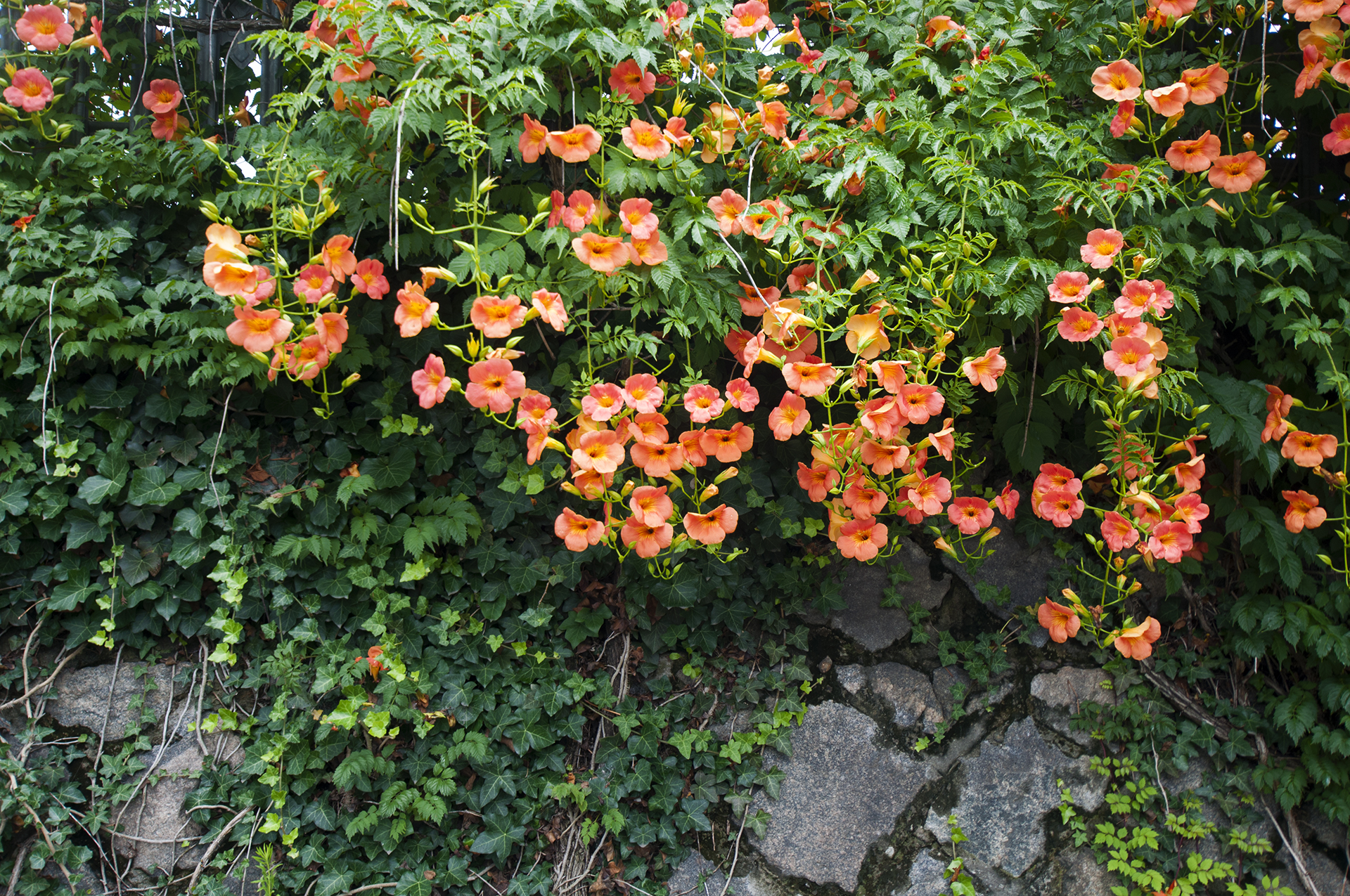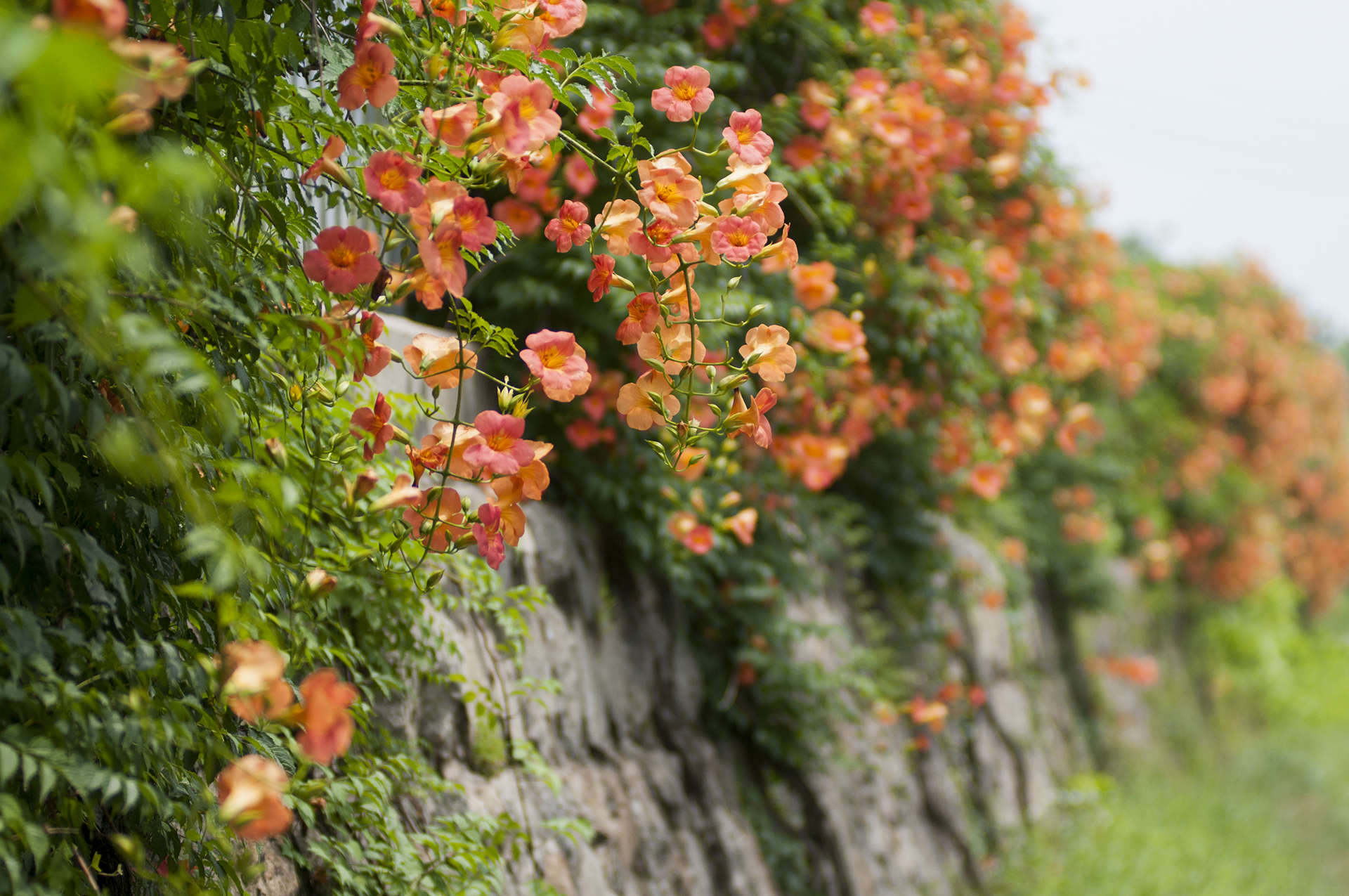 능소화는 벽을 타고 올라가는 덩굴식물이다.