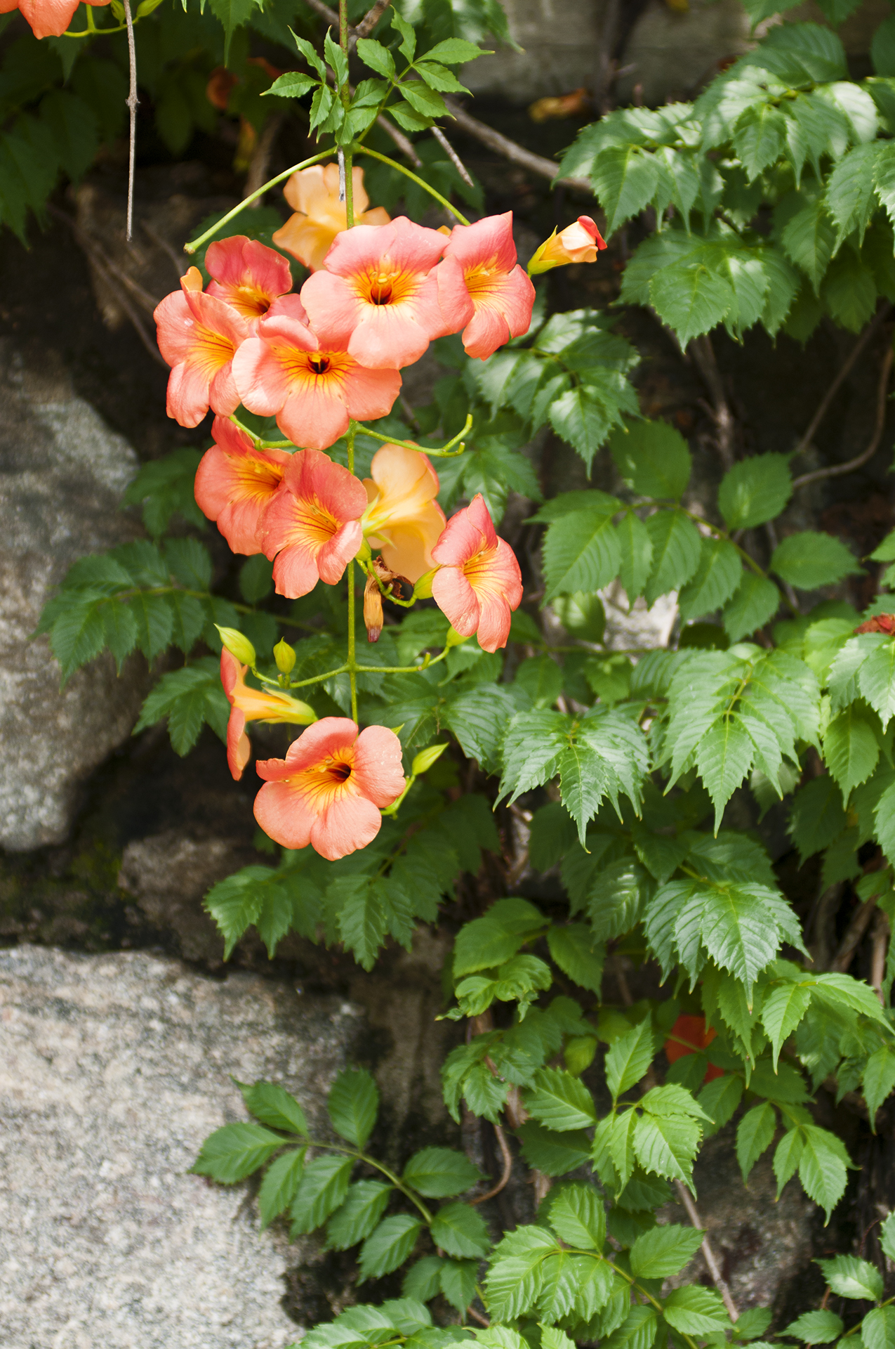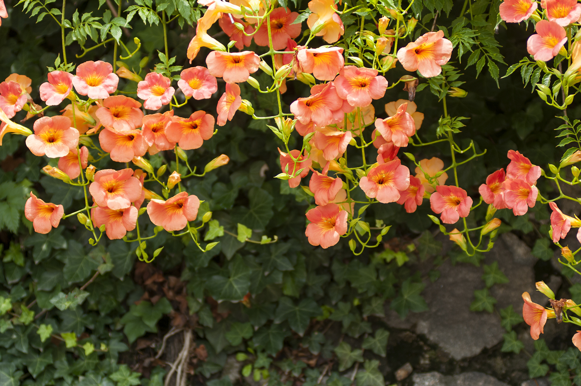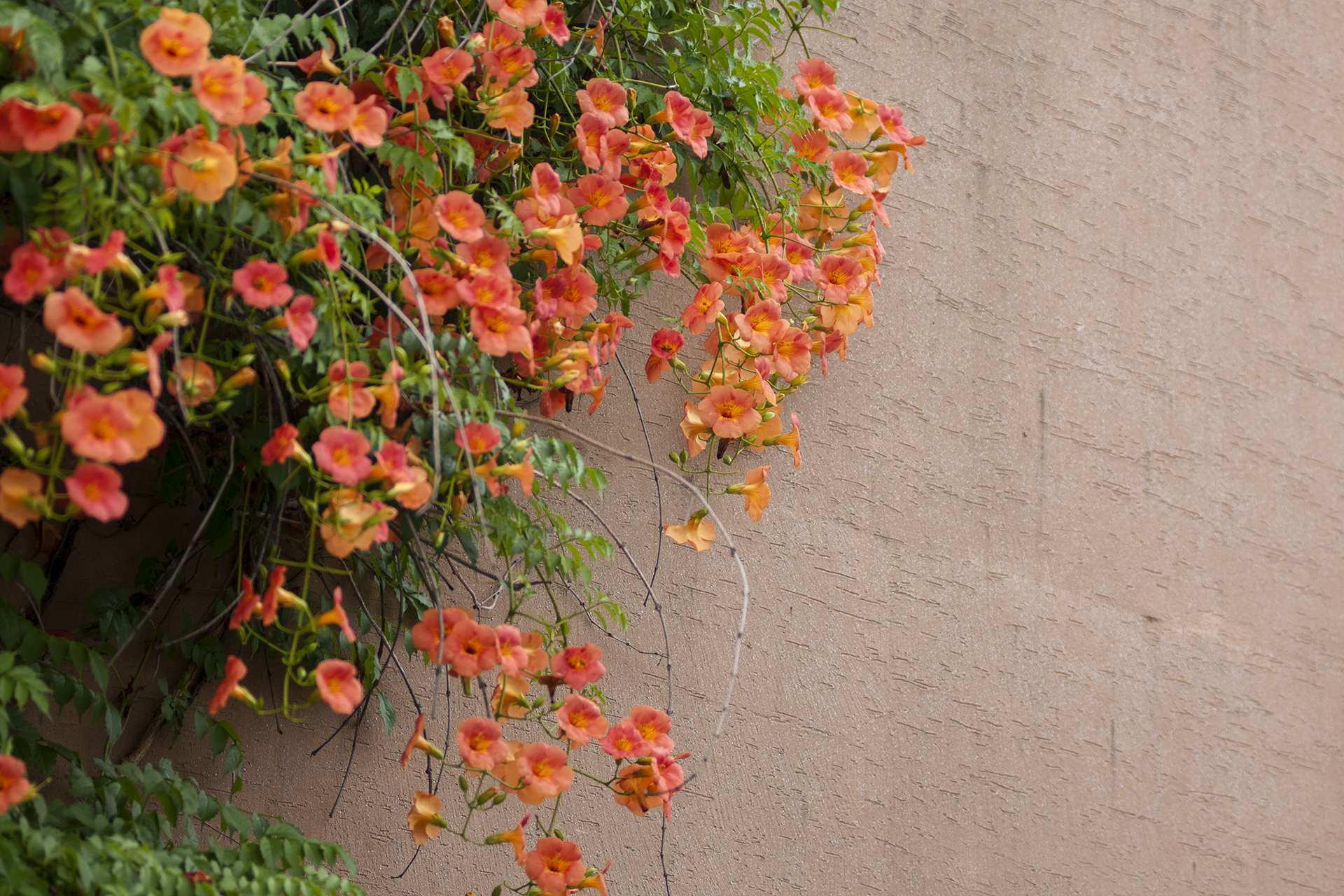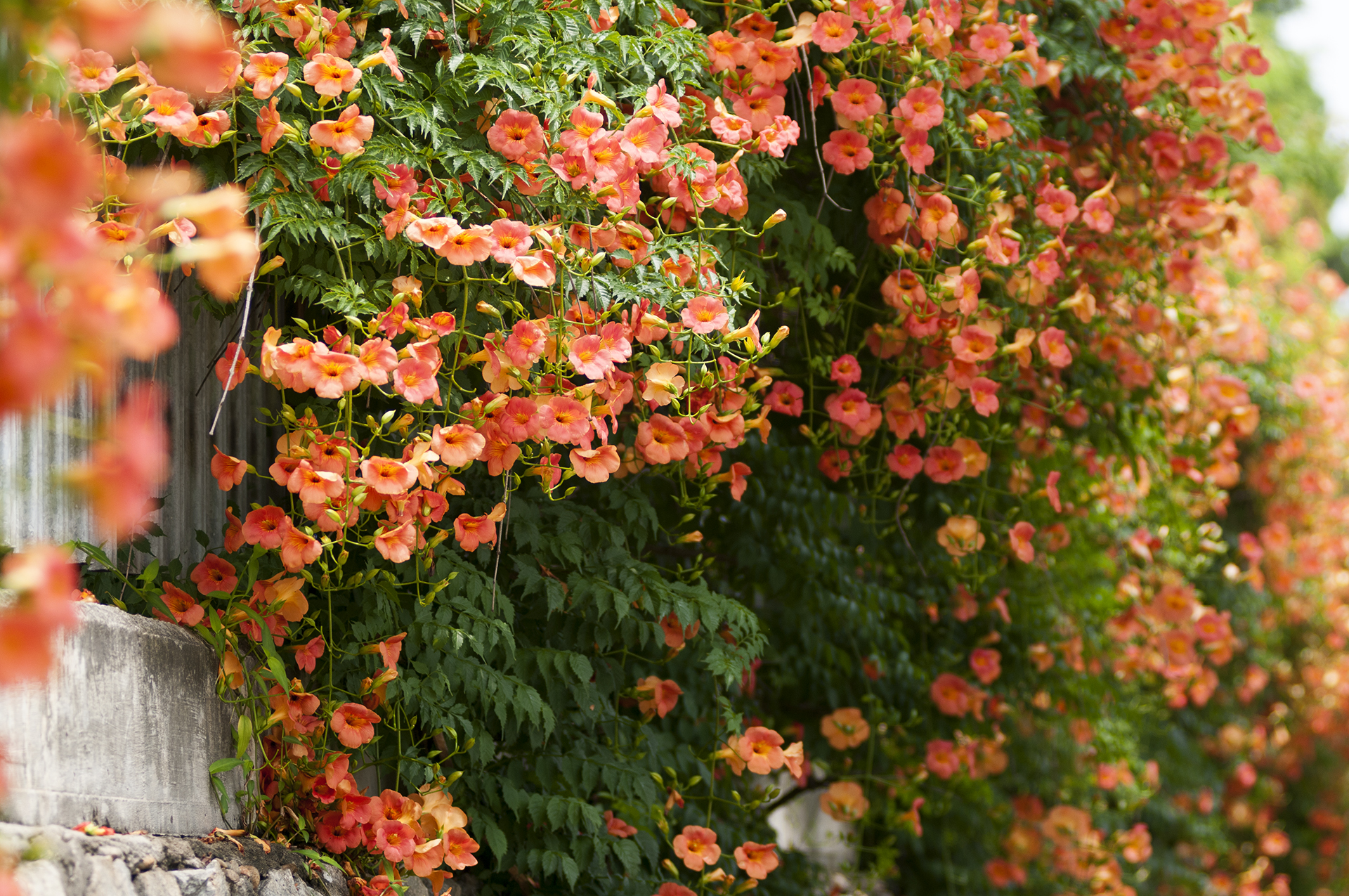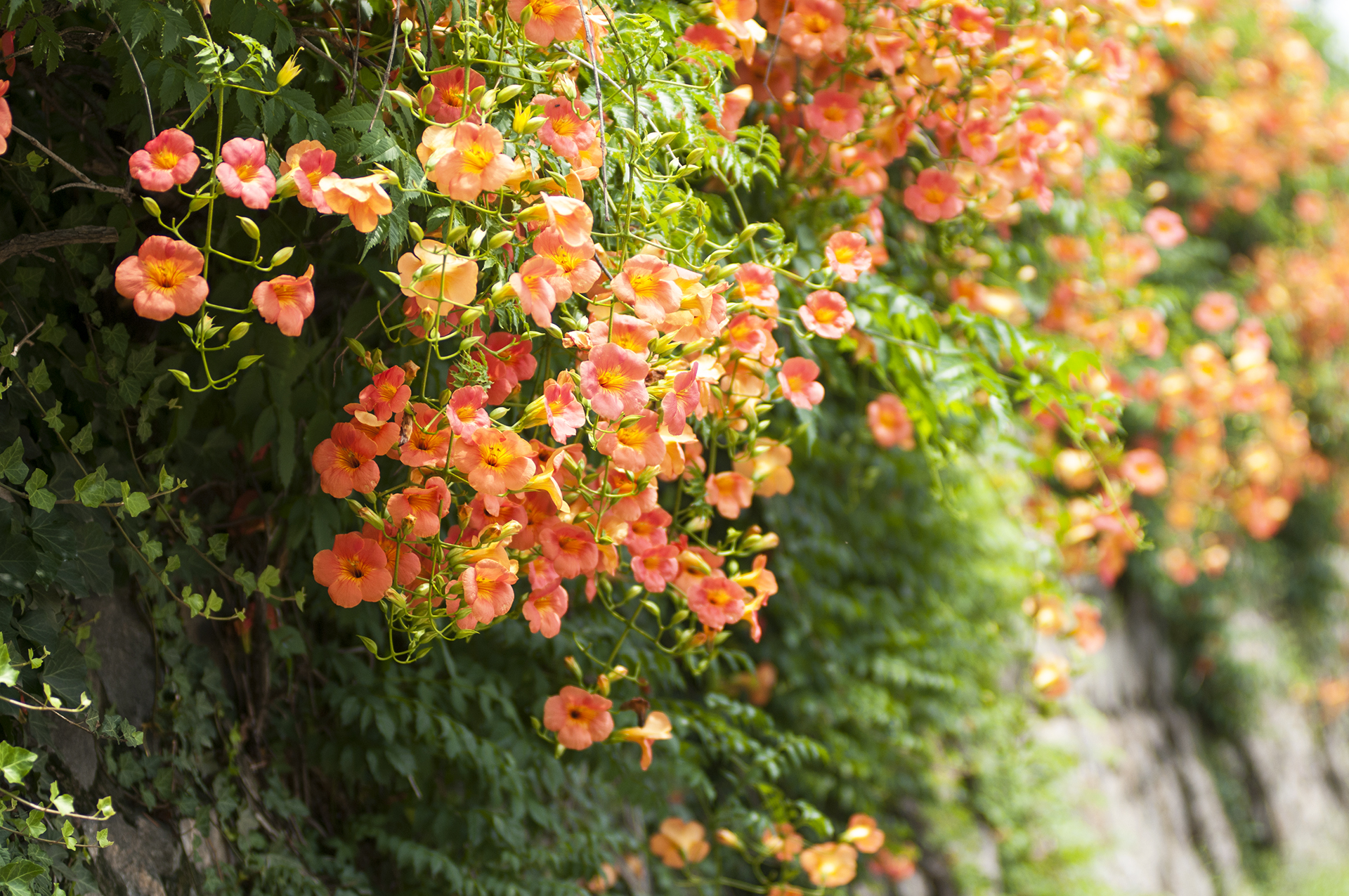 능소화는 벽을 타고 올라가는 덩굴식물이다.