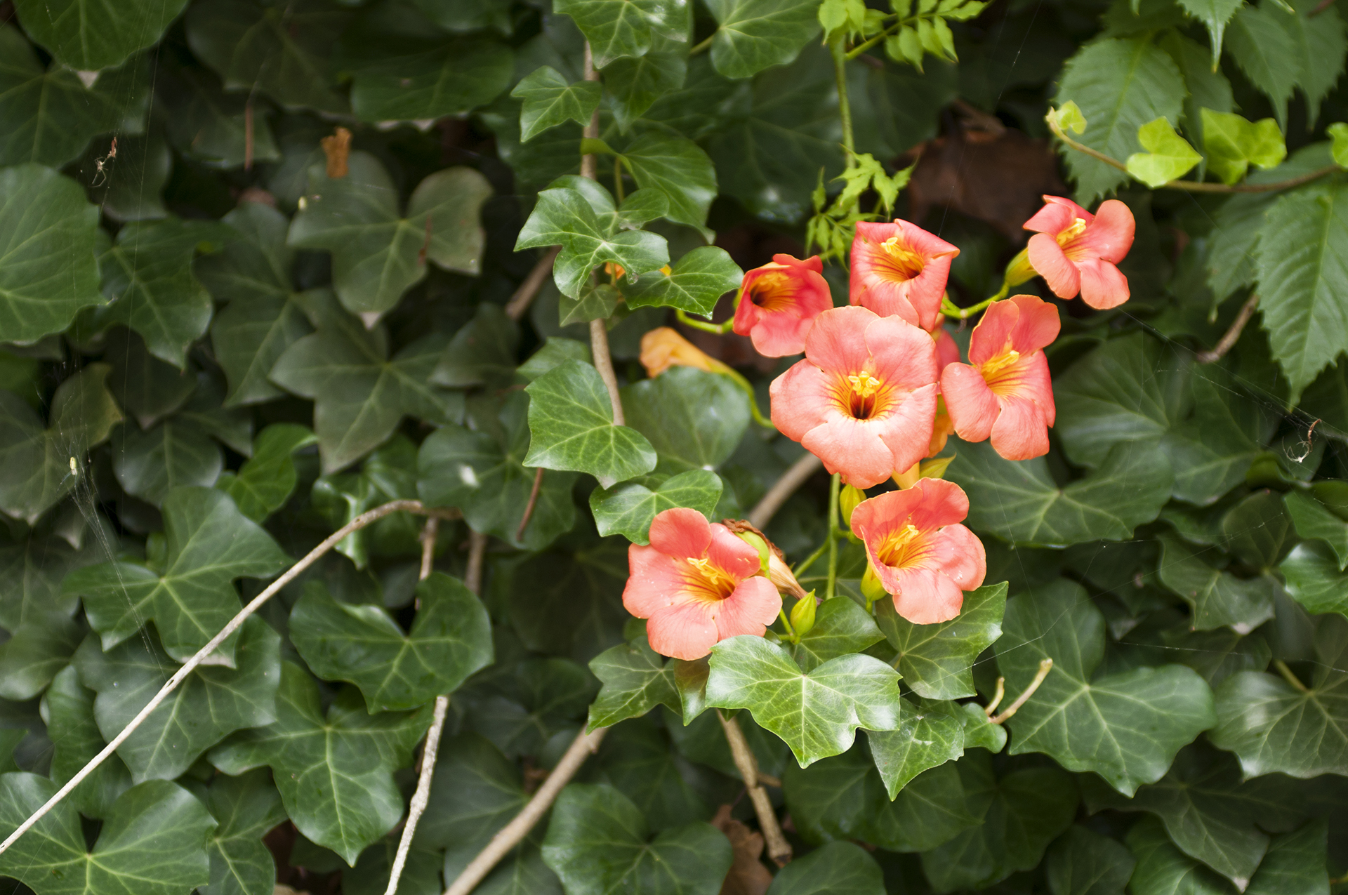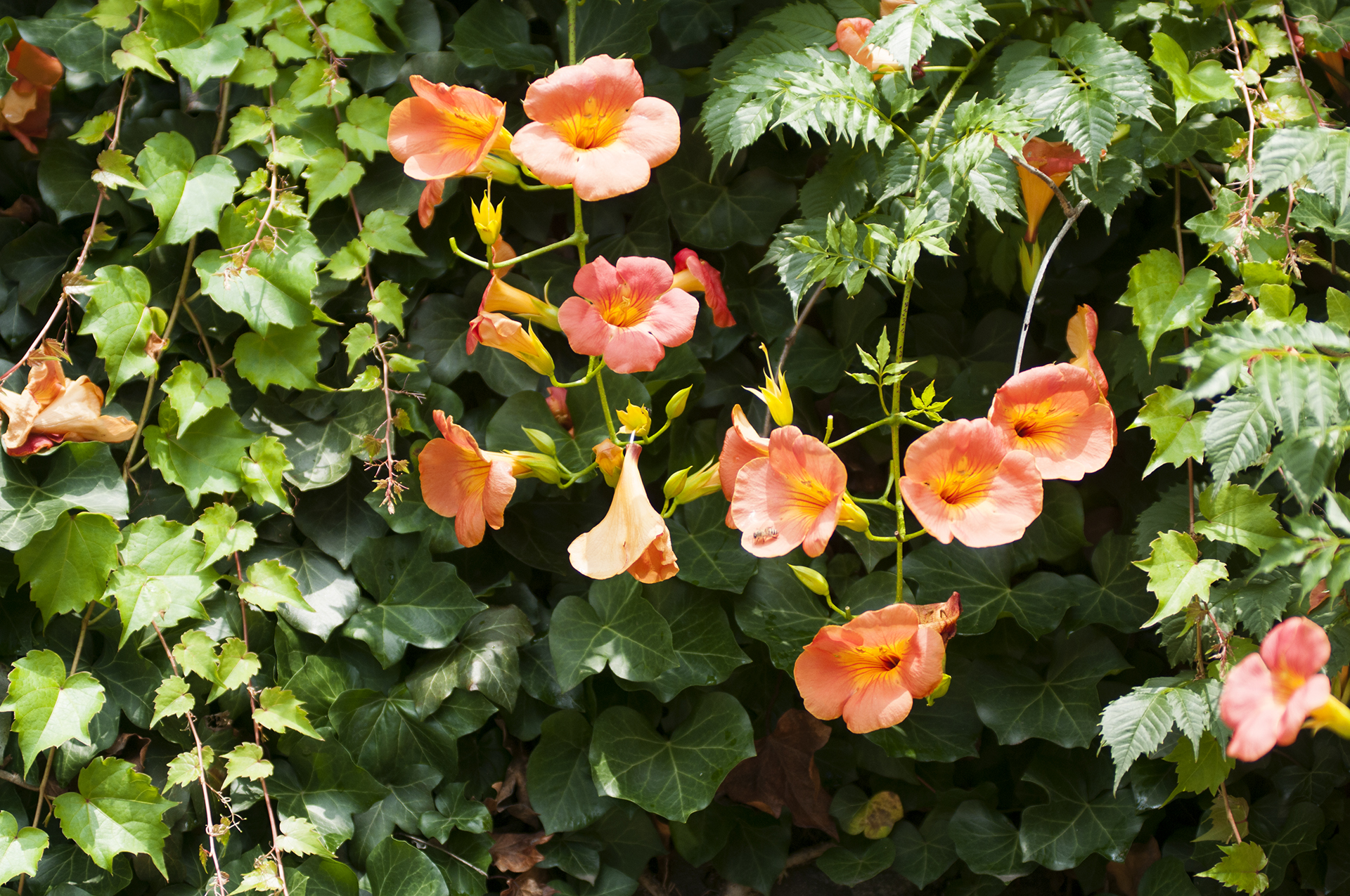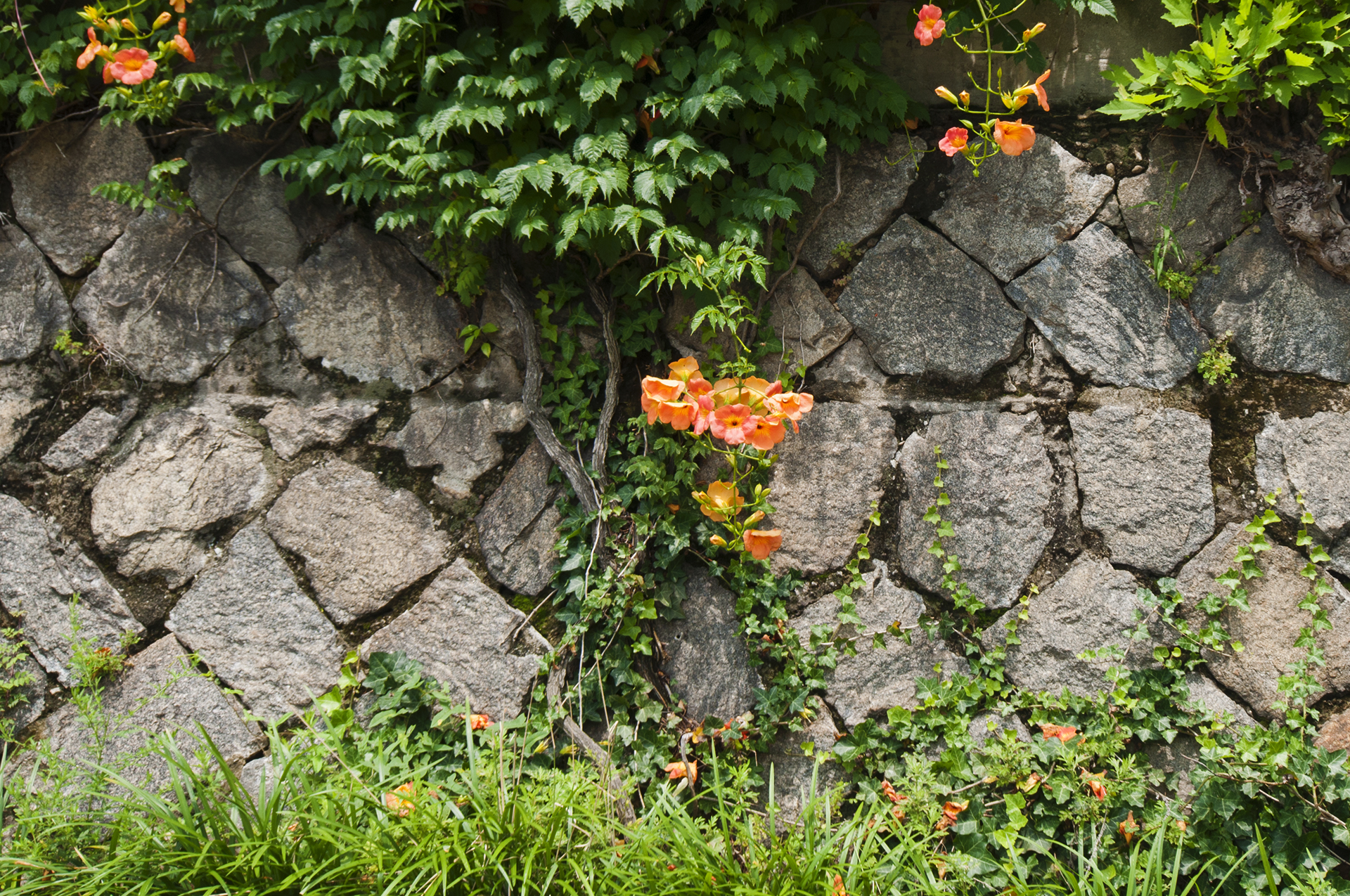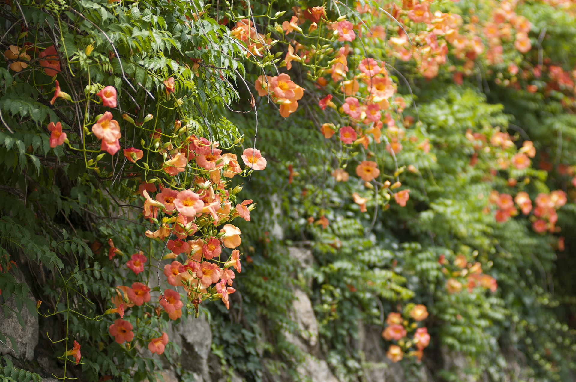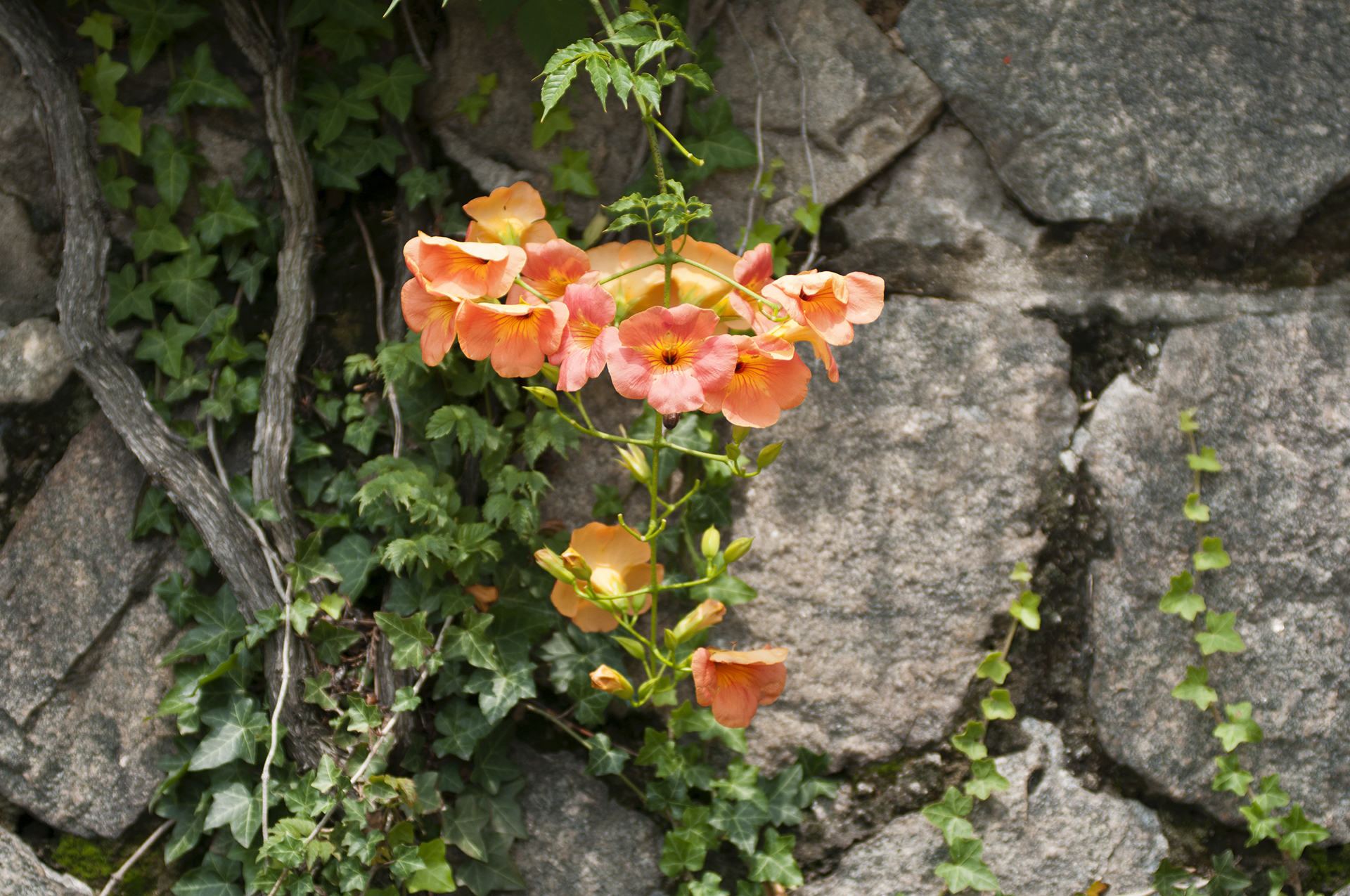 능소화는 벽을 타고 올라가는 덩굴식물이다.