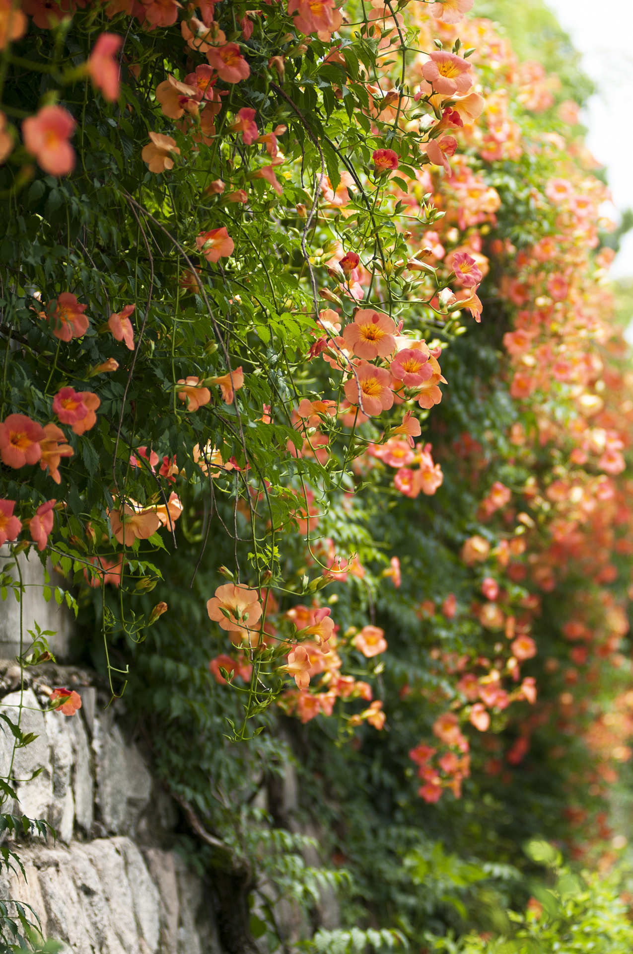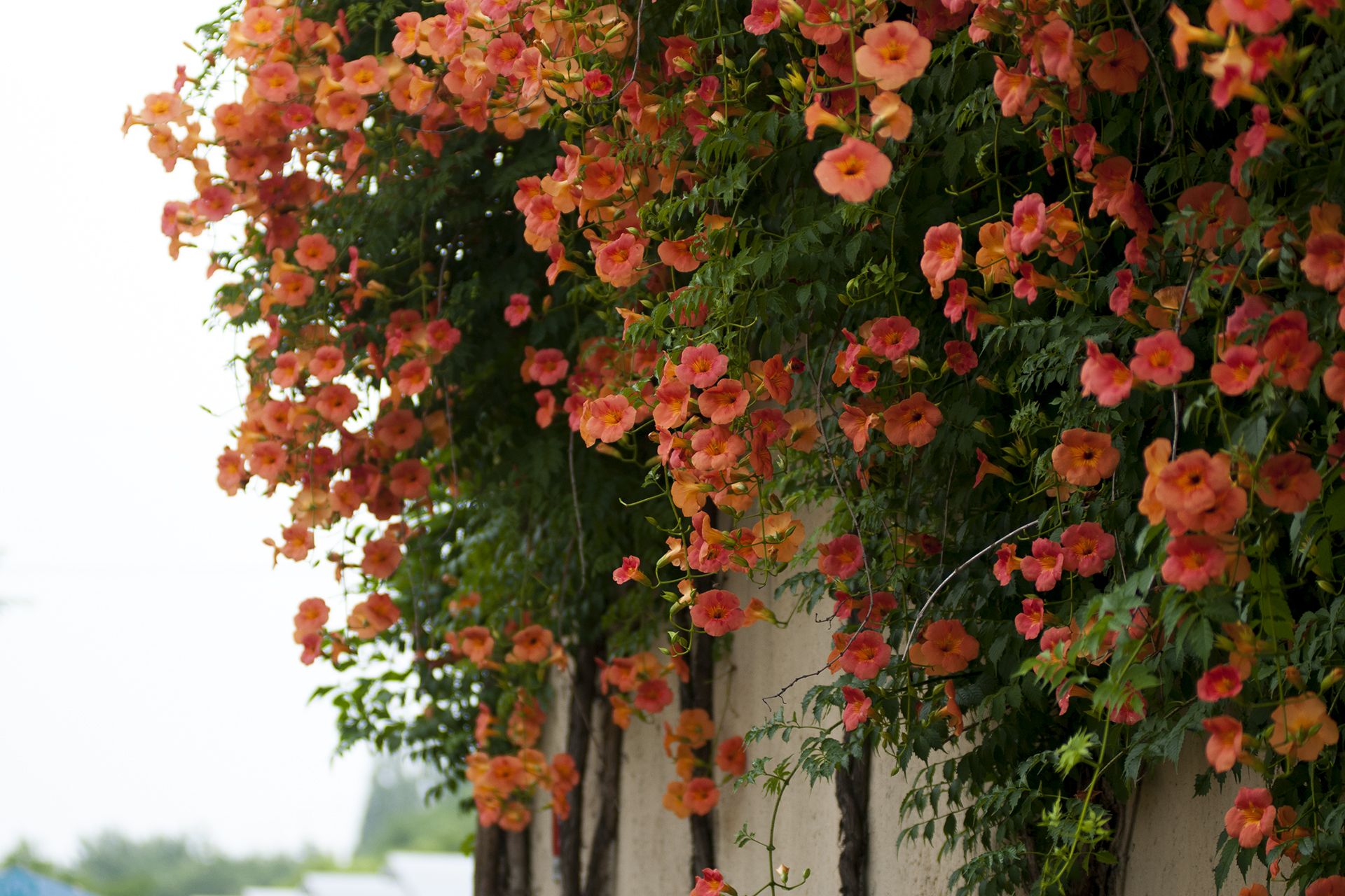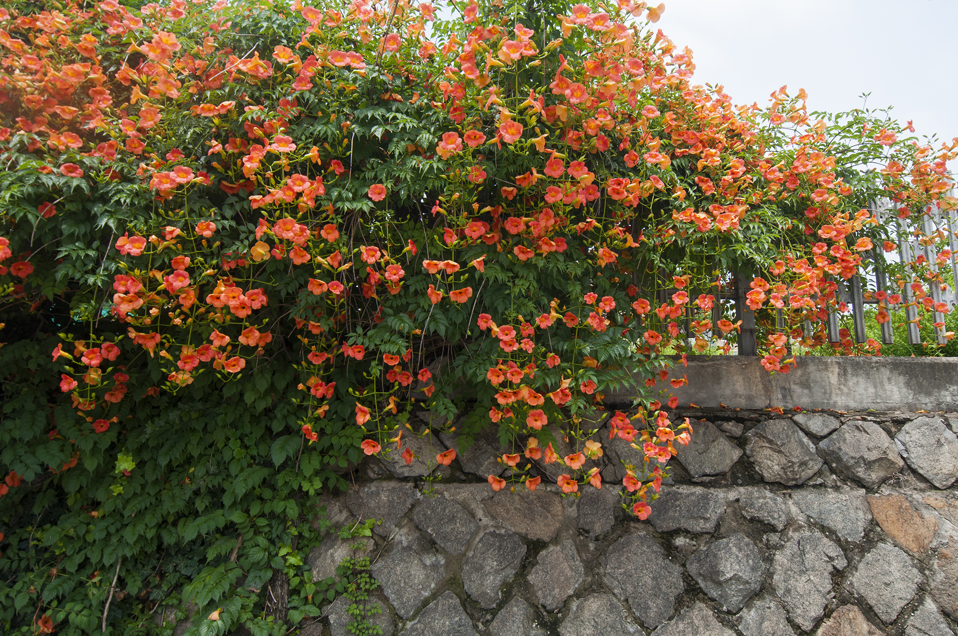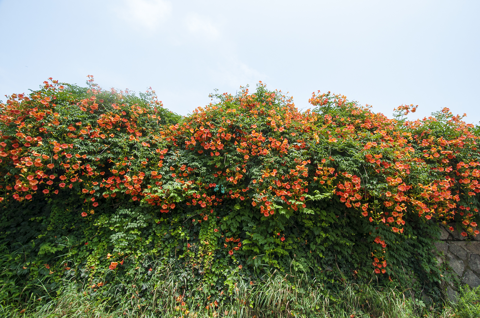 담장을 타고 올라가는 가지에서 수많은 꽃들이 올 여름을 즐겁게 해준다.