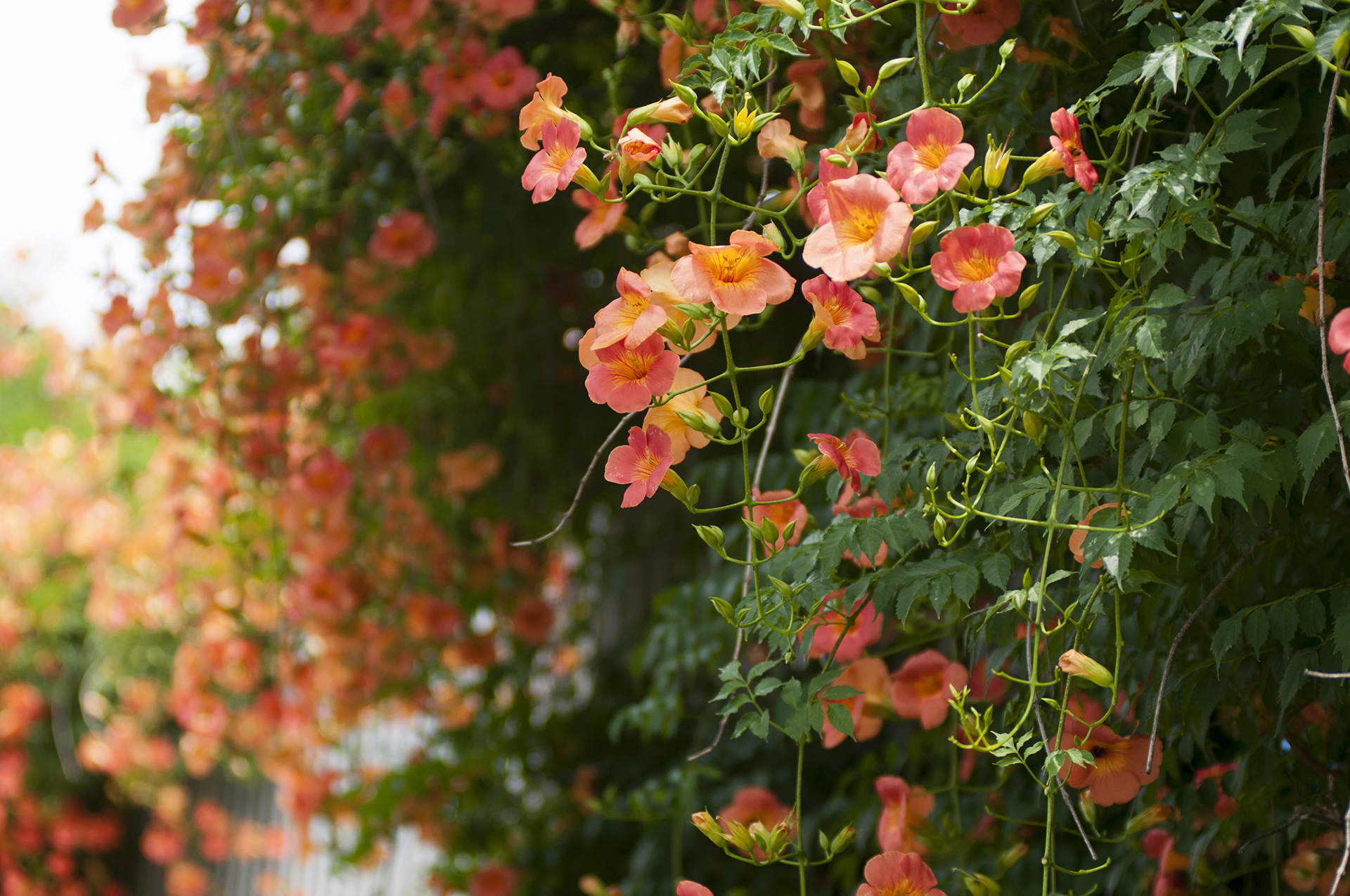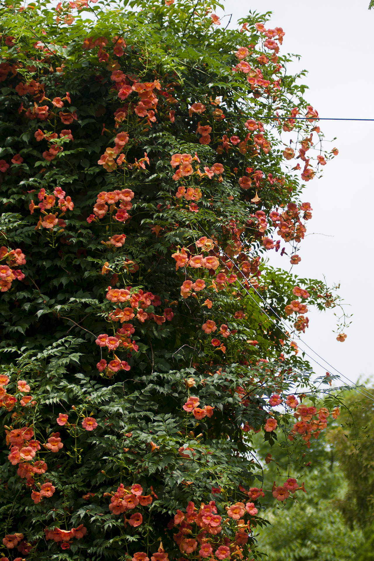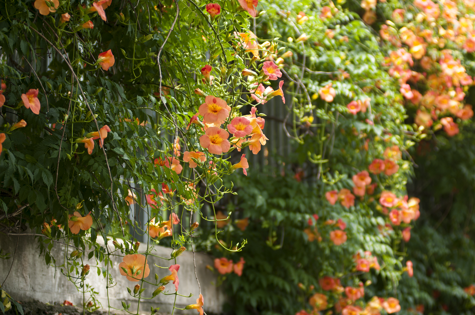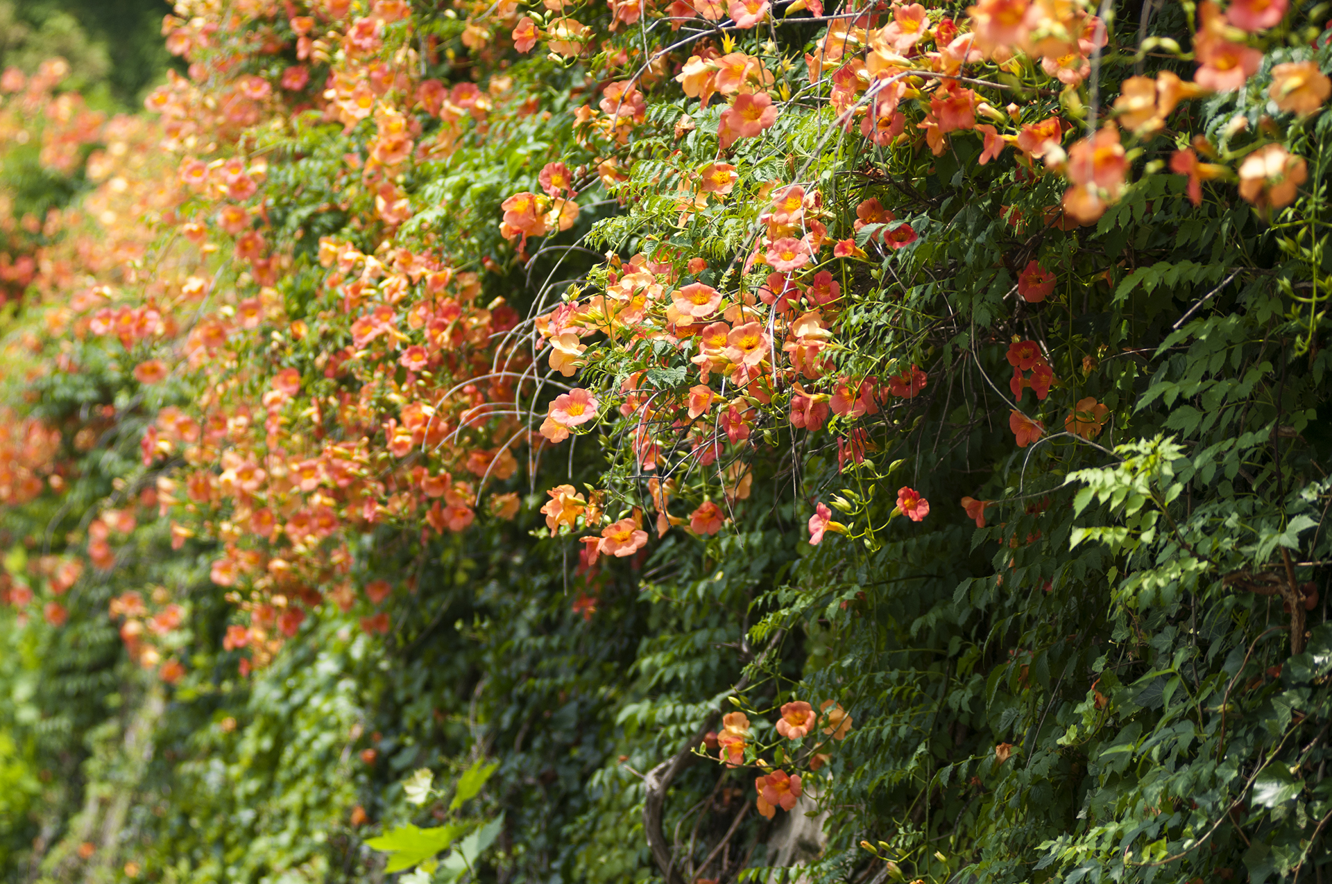 담장을 타고 올라가는 가지에서 수많은 꽃들이 올 여름을 즐겁게 해준다.