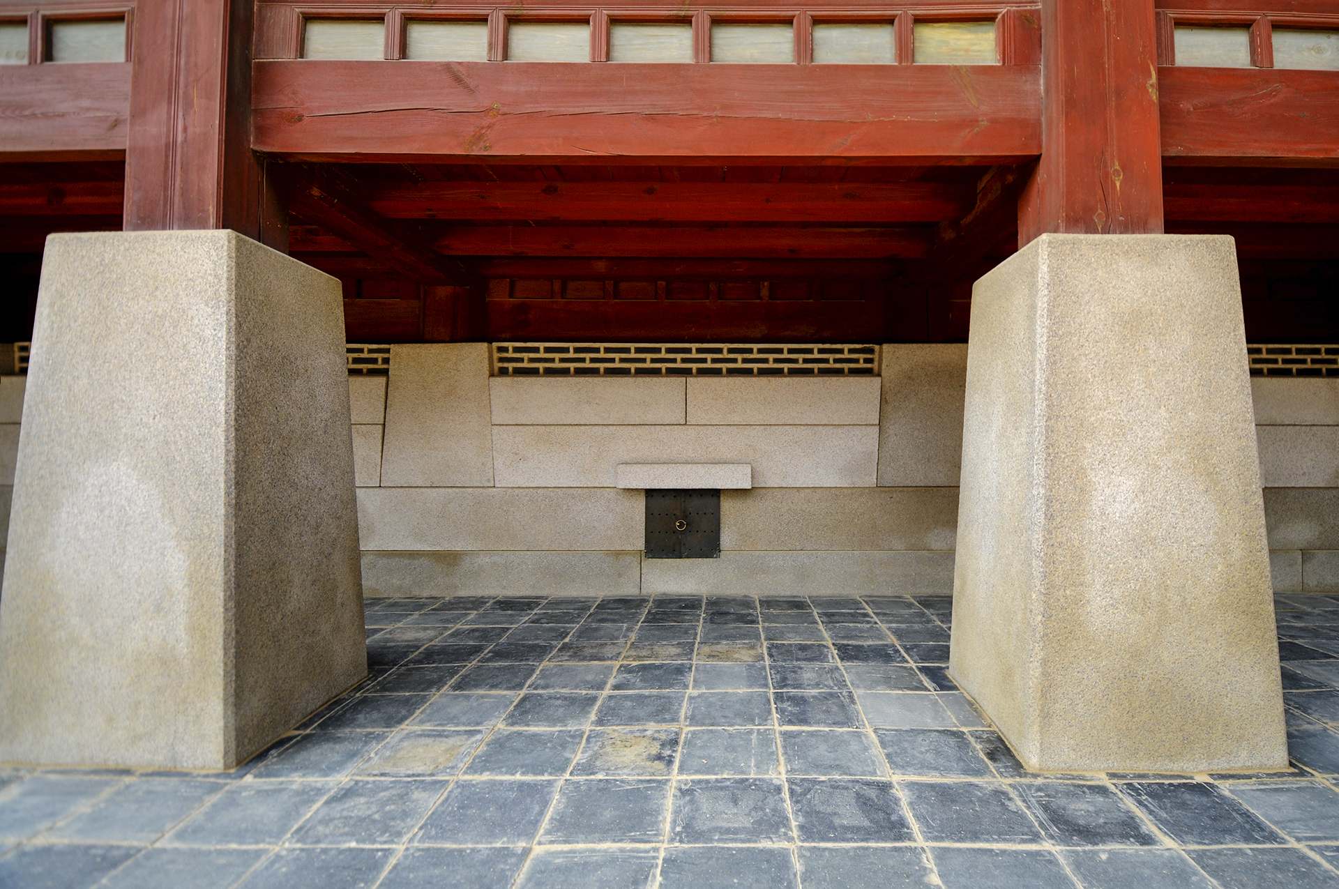 4단의 기단을 쌓은후 전면에는 넓직한 월대를 꾸민것이 특징이다. '이 건물에 중요한 분이 살고 계신다'는 의미라 할 수 있다.