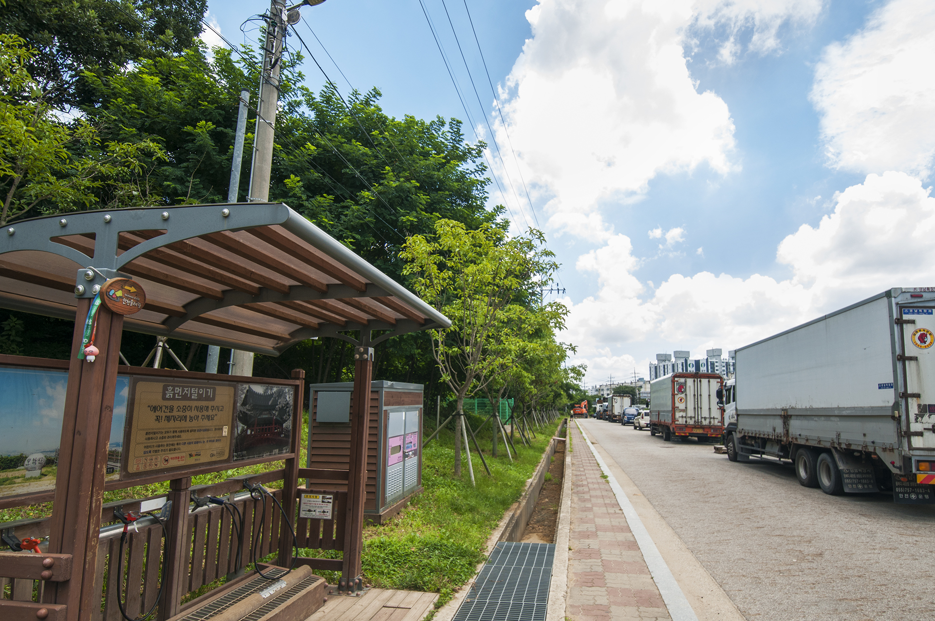 바로 옆에 흙먼지 털이기 에어건이 설치되어 있고, 둘레길 로고도 매달려 있다.
