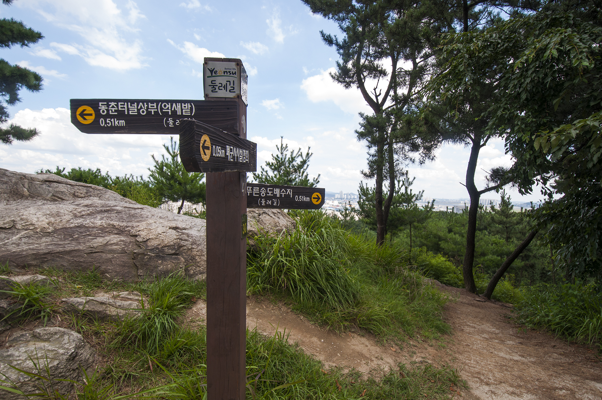 정상에 세워진 이정표, 푸른송도배수지까지 0.51km 남았다.