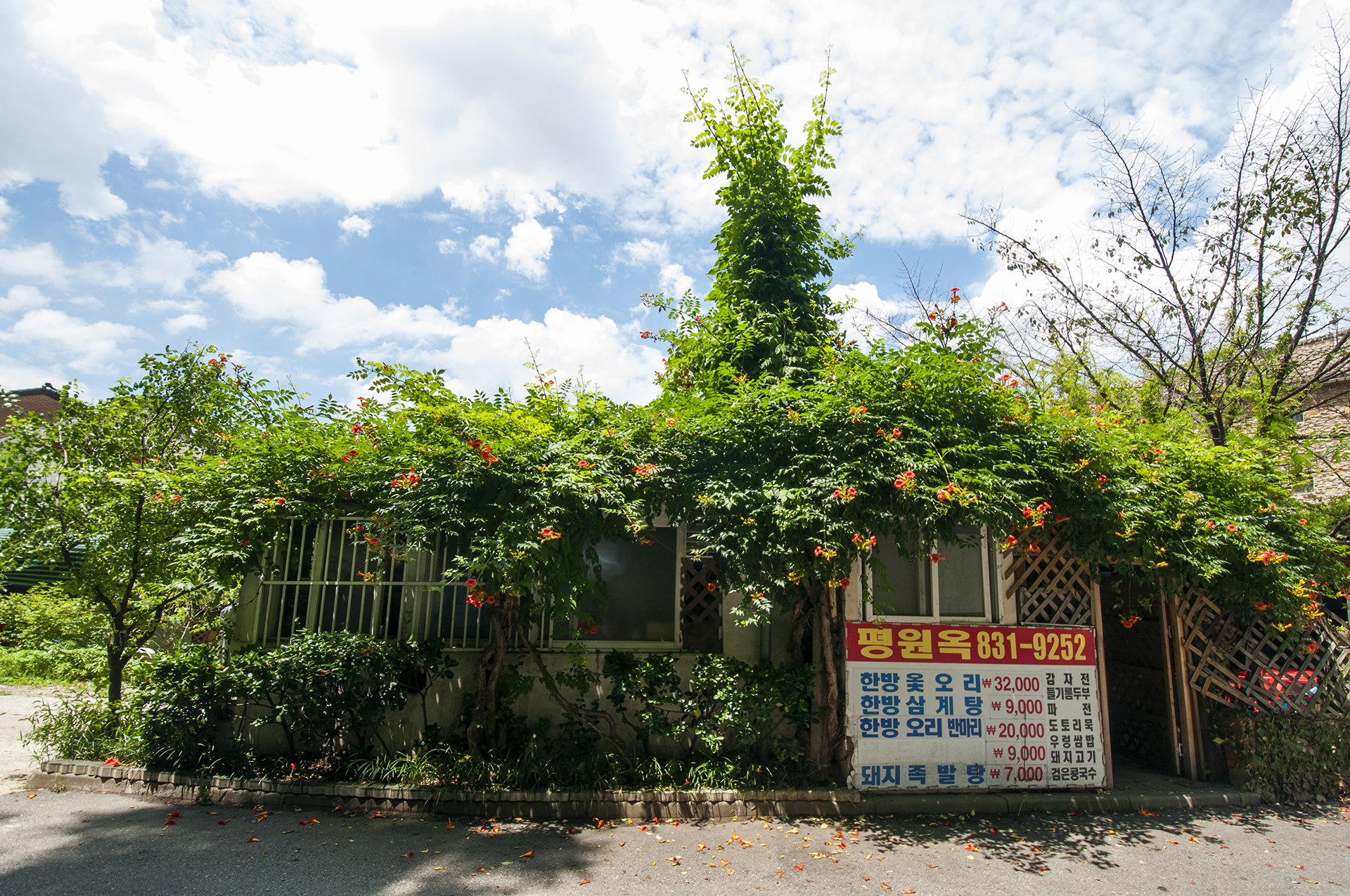 지붕 전체를 덮은 능소화가 인상적이었던 식당 앞을 지나고