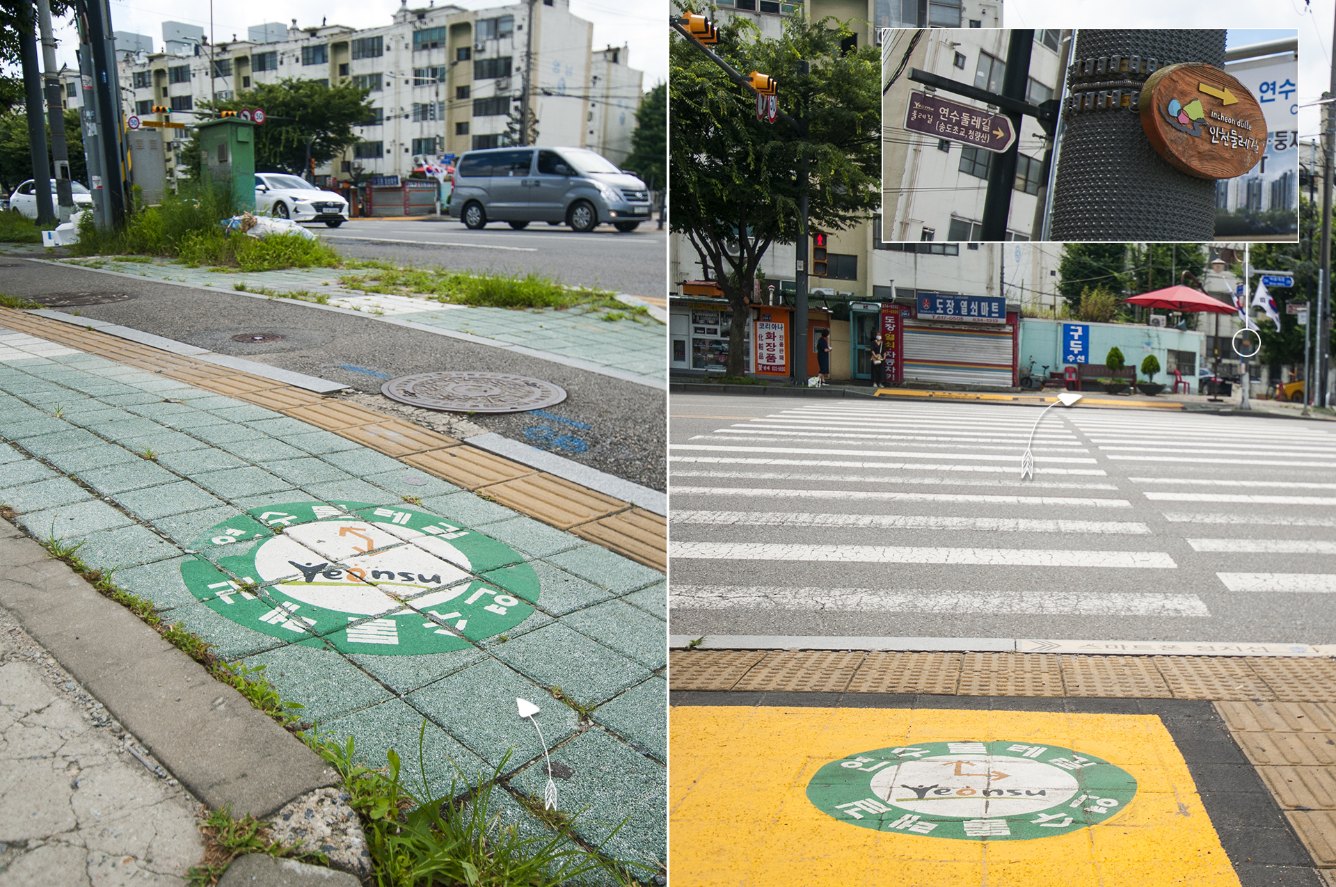 길을 따라 걷다가 큰 도로에 나오면 연수둘레길 안내표식이 바닥에 그려져 있다.