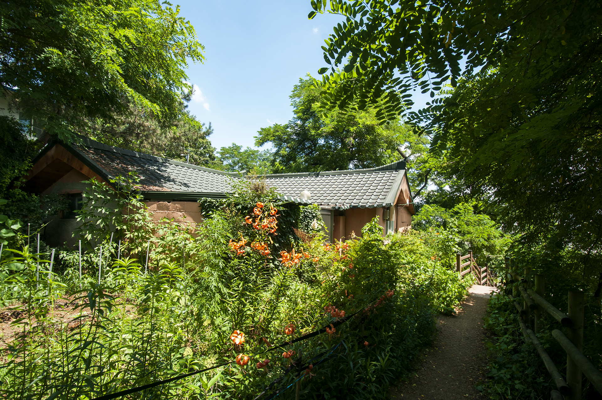 꽃밭에 둘러싸인 황토집 앞을 지나 데크계단을 내려가면