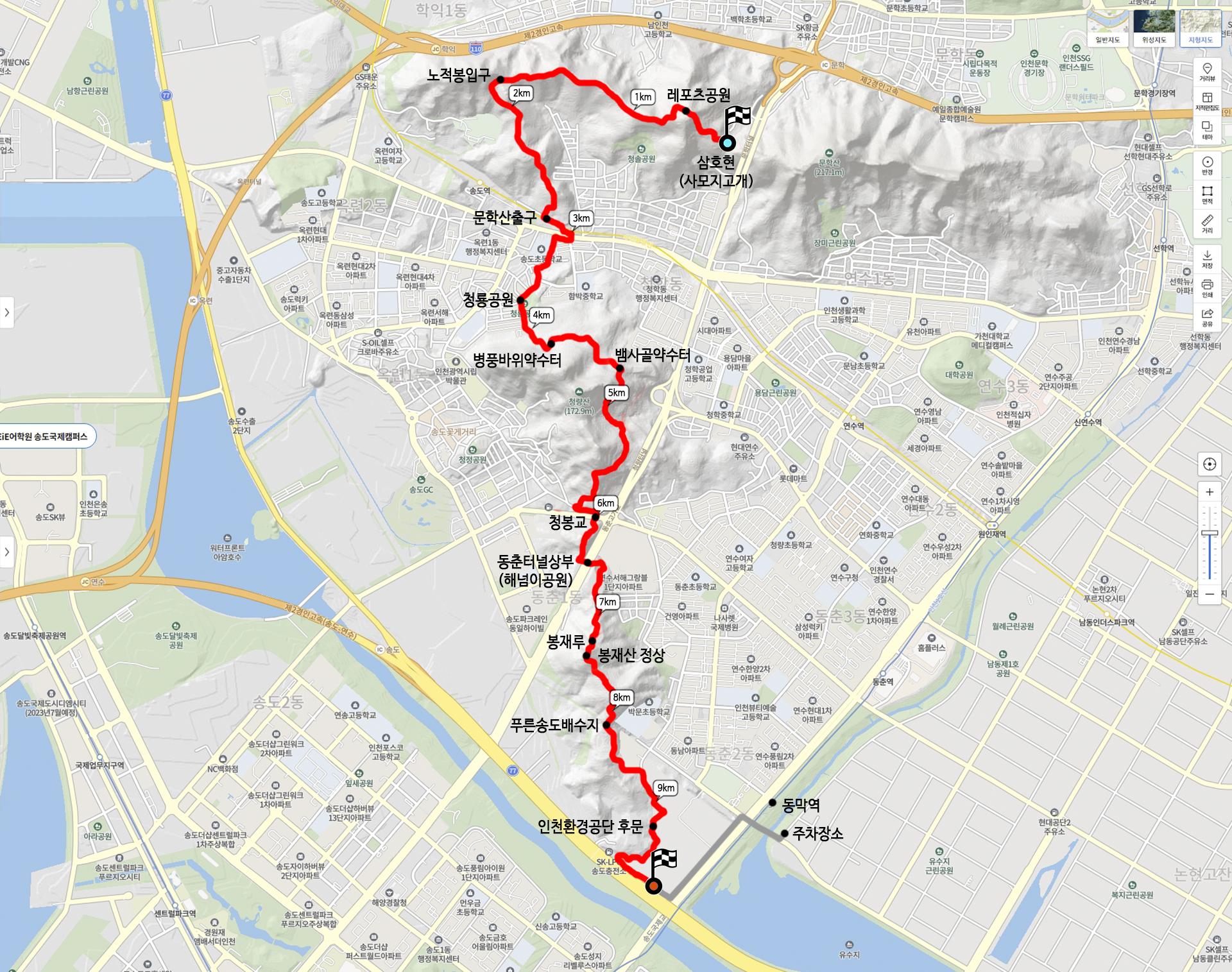 삼호현 (사모지고개) - 노적봉 입구 - 문학산출구(옥련동) - 청룡공원 - 뱀사골약수터 - 청봉교 - 동춘터널 상부 (해넘이공원) - 봉재산 정상 - 푸른송도배수지 - 인천환경공단 - 동막역