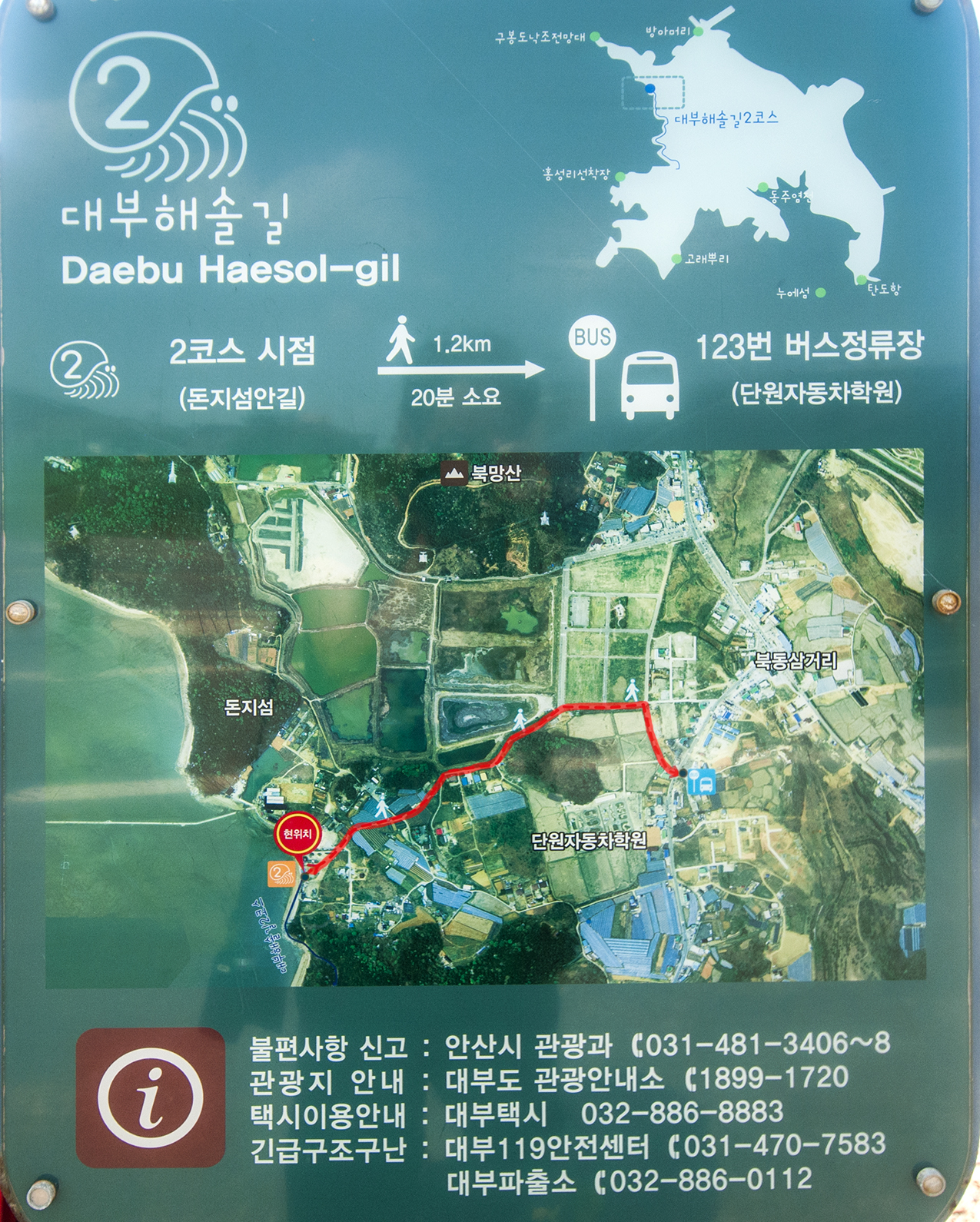 * 복귀방법 (도보) : 도착지점 - 대부해안로 - 북동삼거리 - 대부바다향기테마파크 주차장 (3.62km, 휴식시간 포함 도보 58분 소요됨)