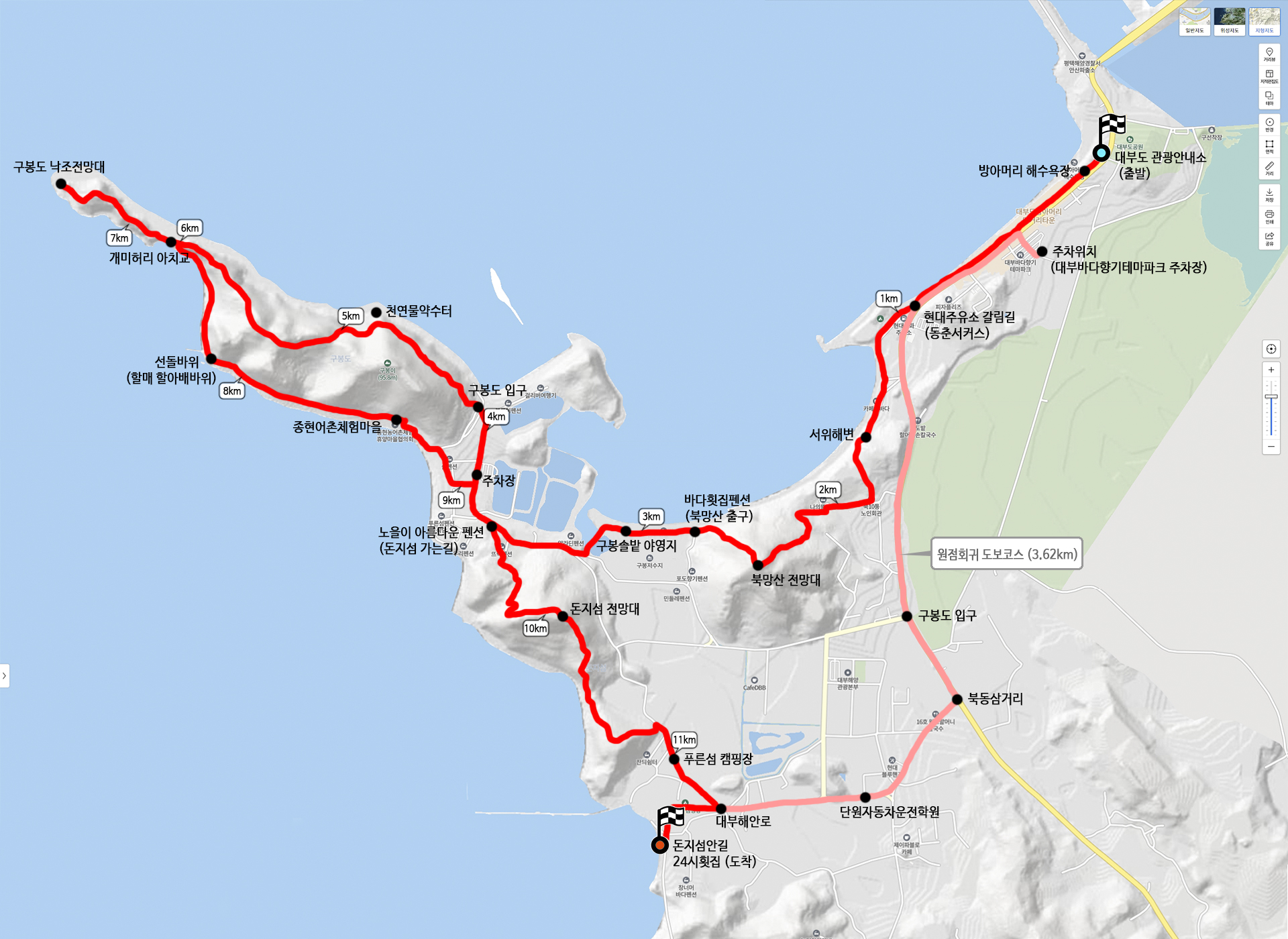 대부도 관광안내소 - 방아머리 해수욕장 - 북망산 전망대 - 구봉솔밭 야영지 - 구봉도 입구 - 천연물약수터 - 개미허리 아치교 - 낙조전망대 - 선돌바위 - 종현어촌체험마을 - 돈지섬 전망대 - 돈지섬안길 (24시횟집)