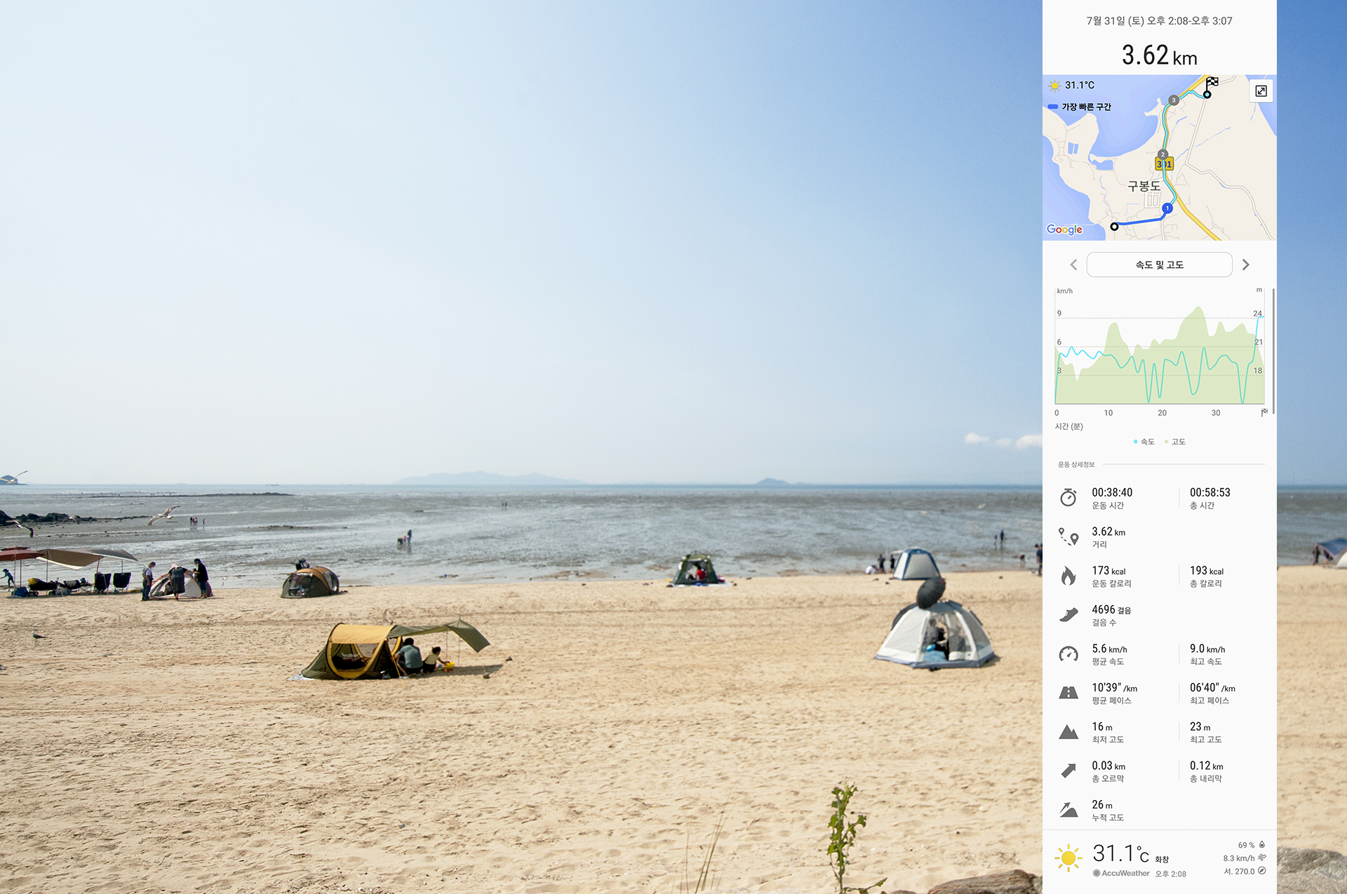 정식거리보다 2km나 늘어났다. 초반에 주유소 부근에서, 카페 루헤 부근 백사장회센터에서 헤맸던 거리가 대부분이며, 짧지만 구봉도약수터까지 갔다온 거리가 포함되어 있다.