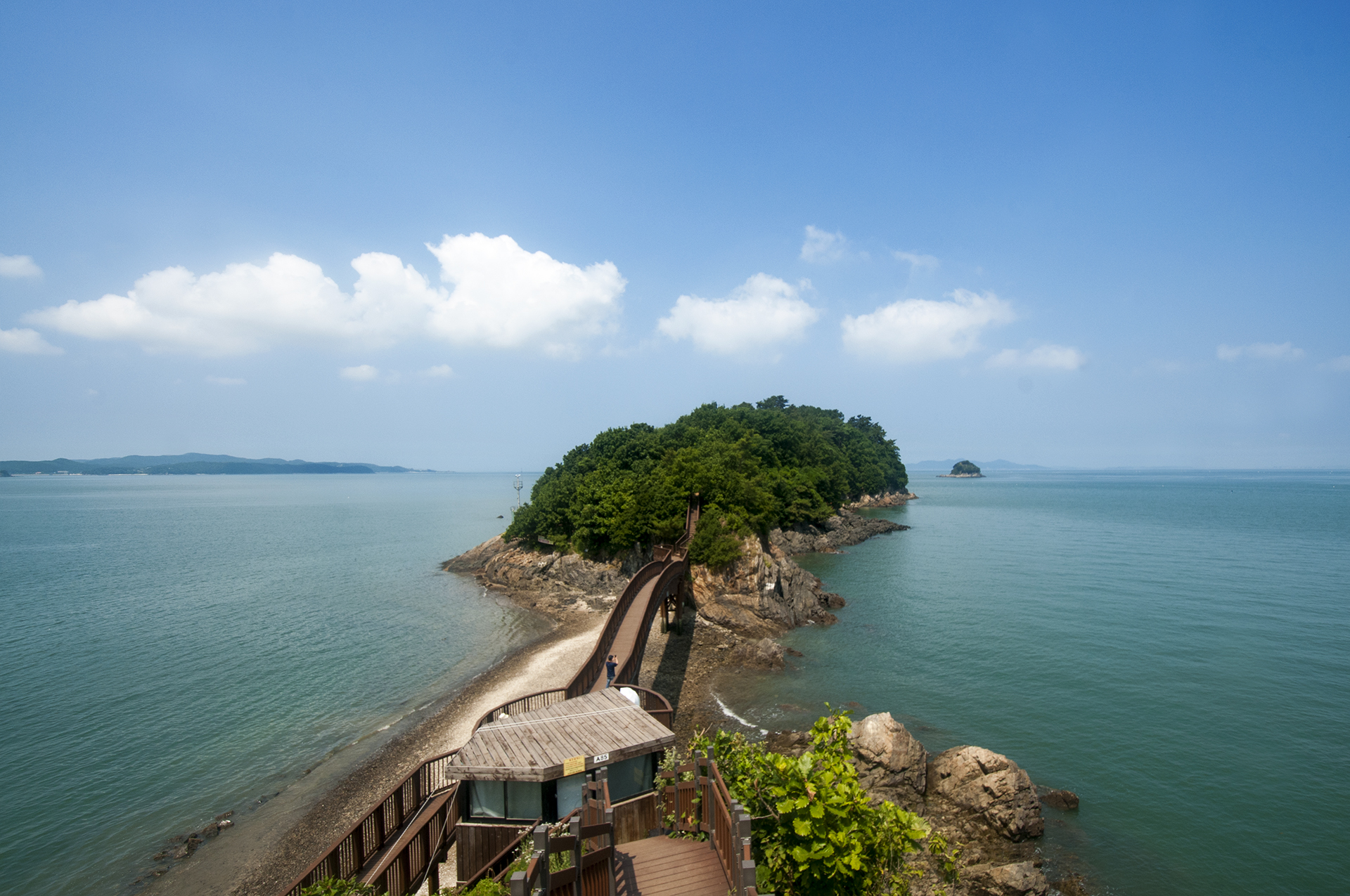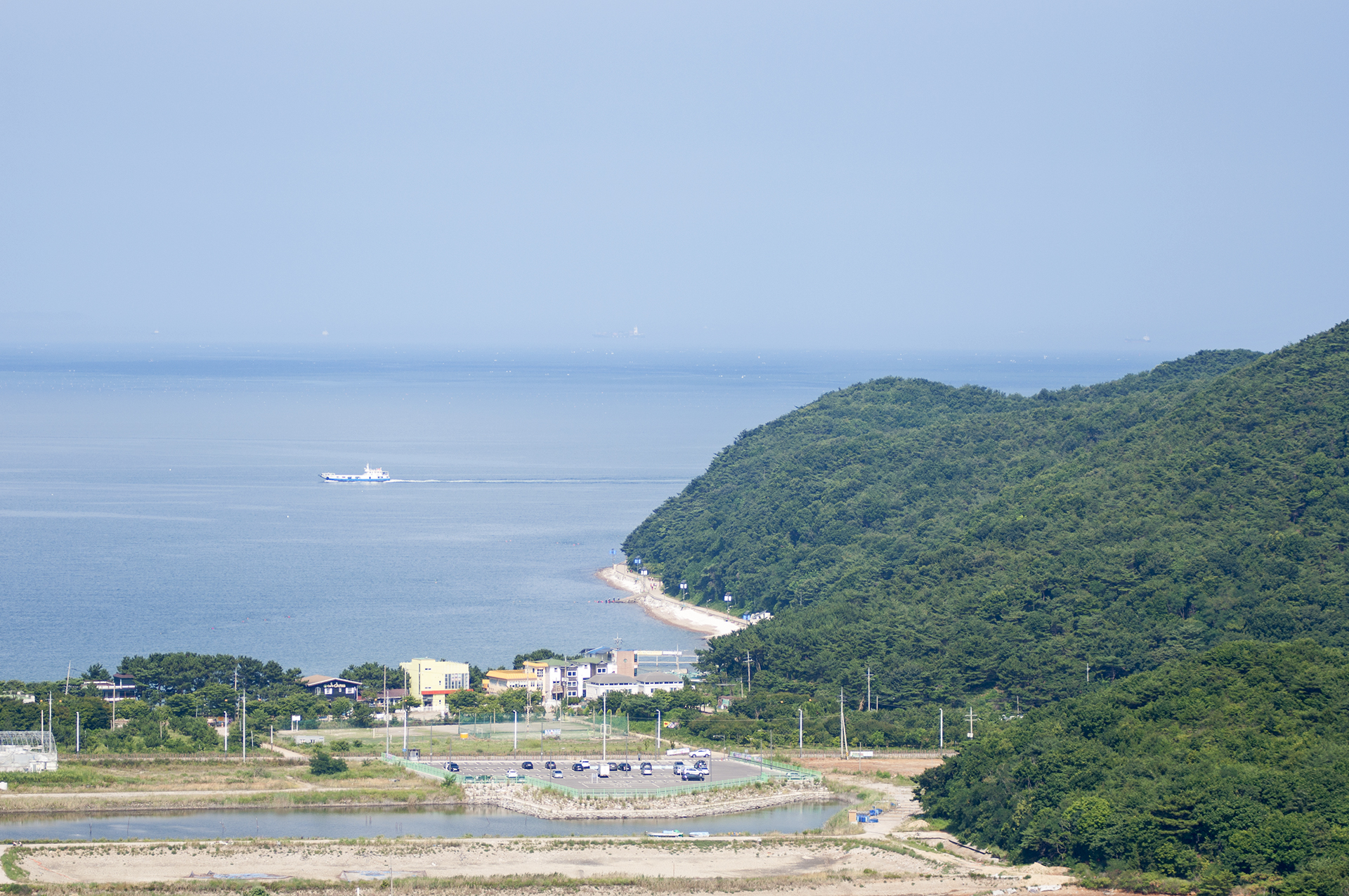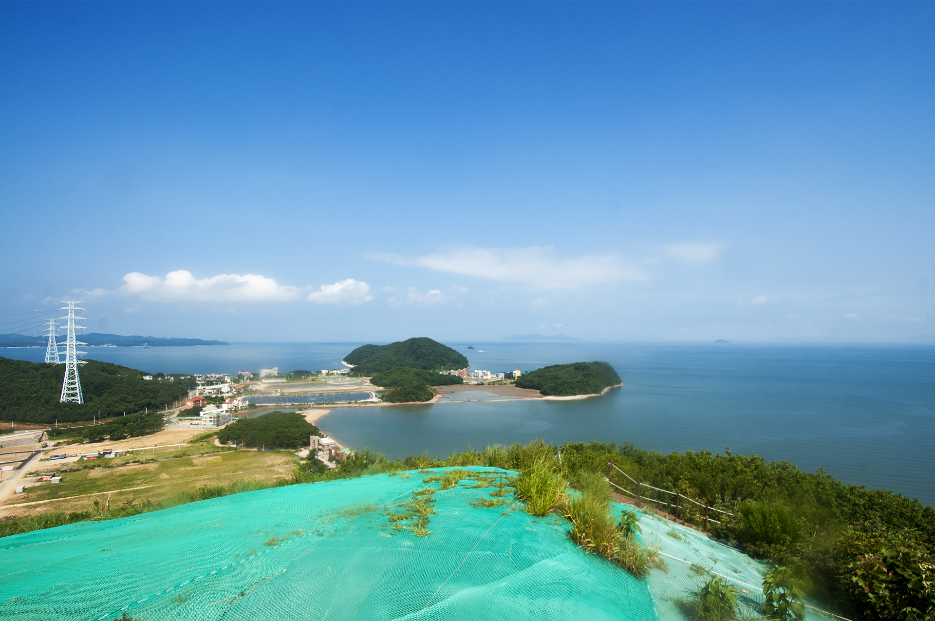 해안선 끝에 선재대교가 보이고 그 앞에 조그만 광도와 주도가 바다 한가운데 떠있다.