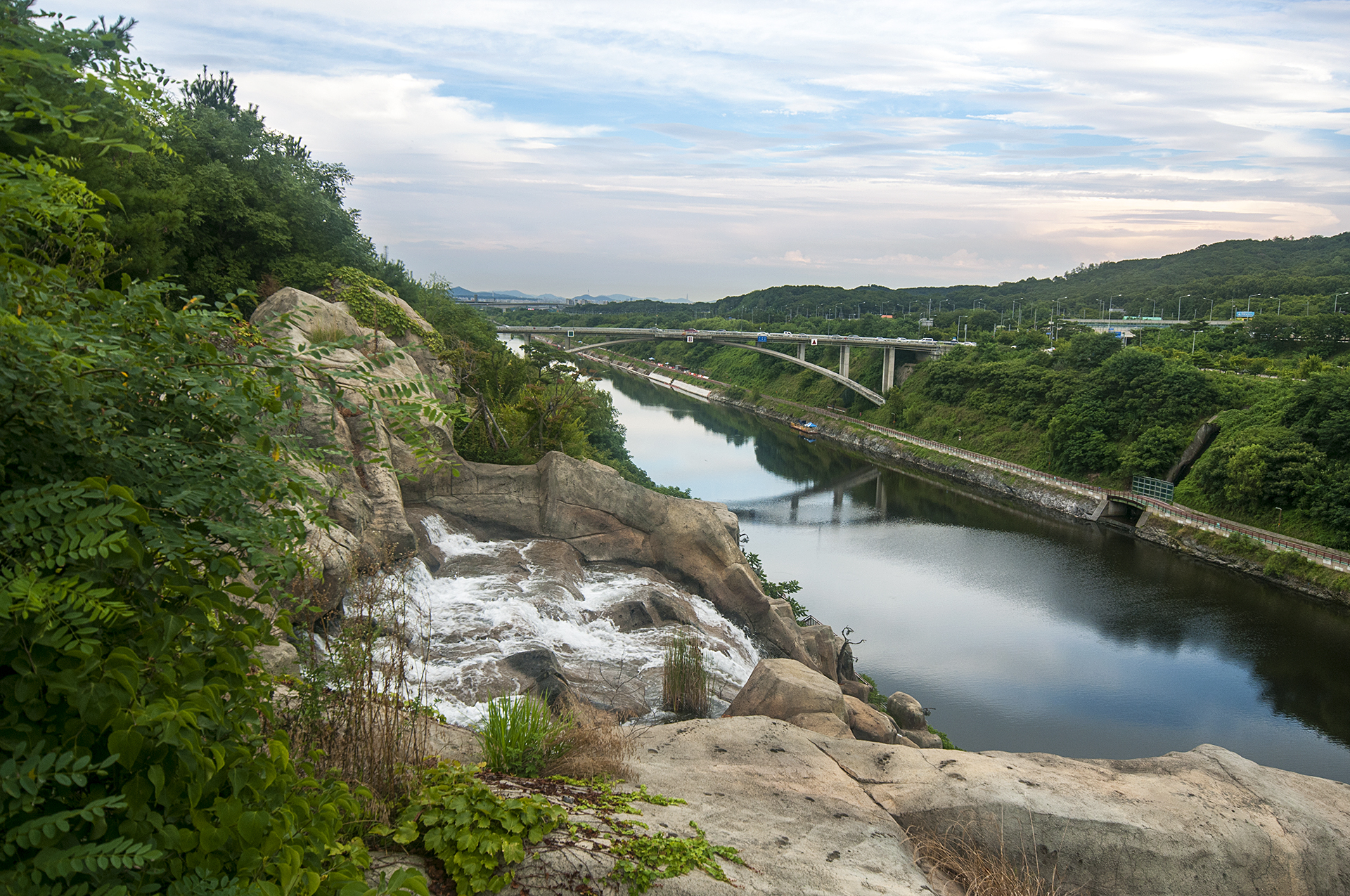아라폭포 하단부를 보려면 저 길까지 내려가야 한다. 전방에 보이는 다리는 목상교이고, 건너편에는 안개협곡공원이 있다.