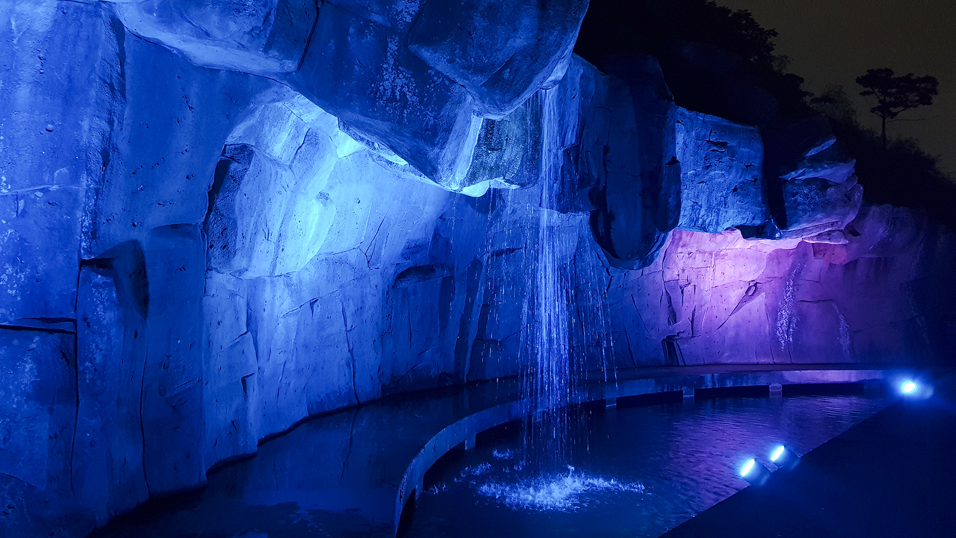 인적도 없는 곳에서 만난 폭포의 암벽, 조명때문에 이 기분을 뭐라 표현해야할지 모르겠다.