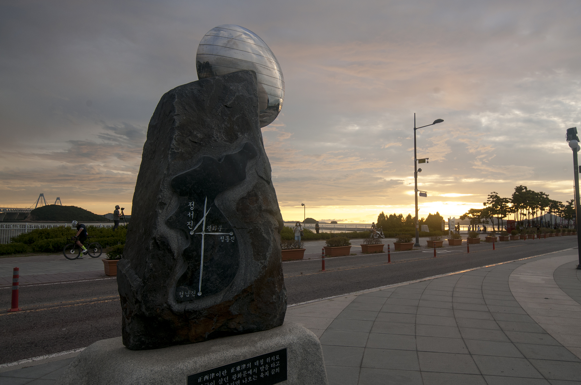 표지석 위에 동그란 거울같은 것은 스테인레스 스틸로 정서진의 아름다운 석양을 나타내고자 상단부에 해를 형상화한 구조물이라고 한다.