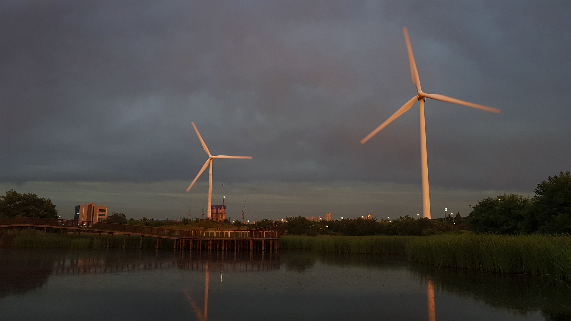 풍차에도 노을빛이 물들고, 이쪽은 여전히 잔뜩 흐린 하늘이다.