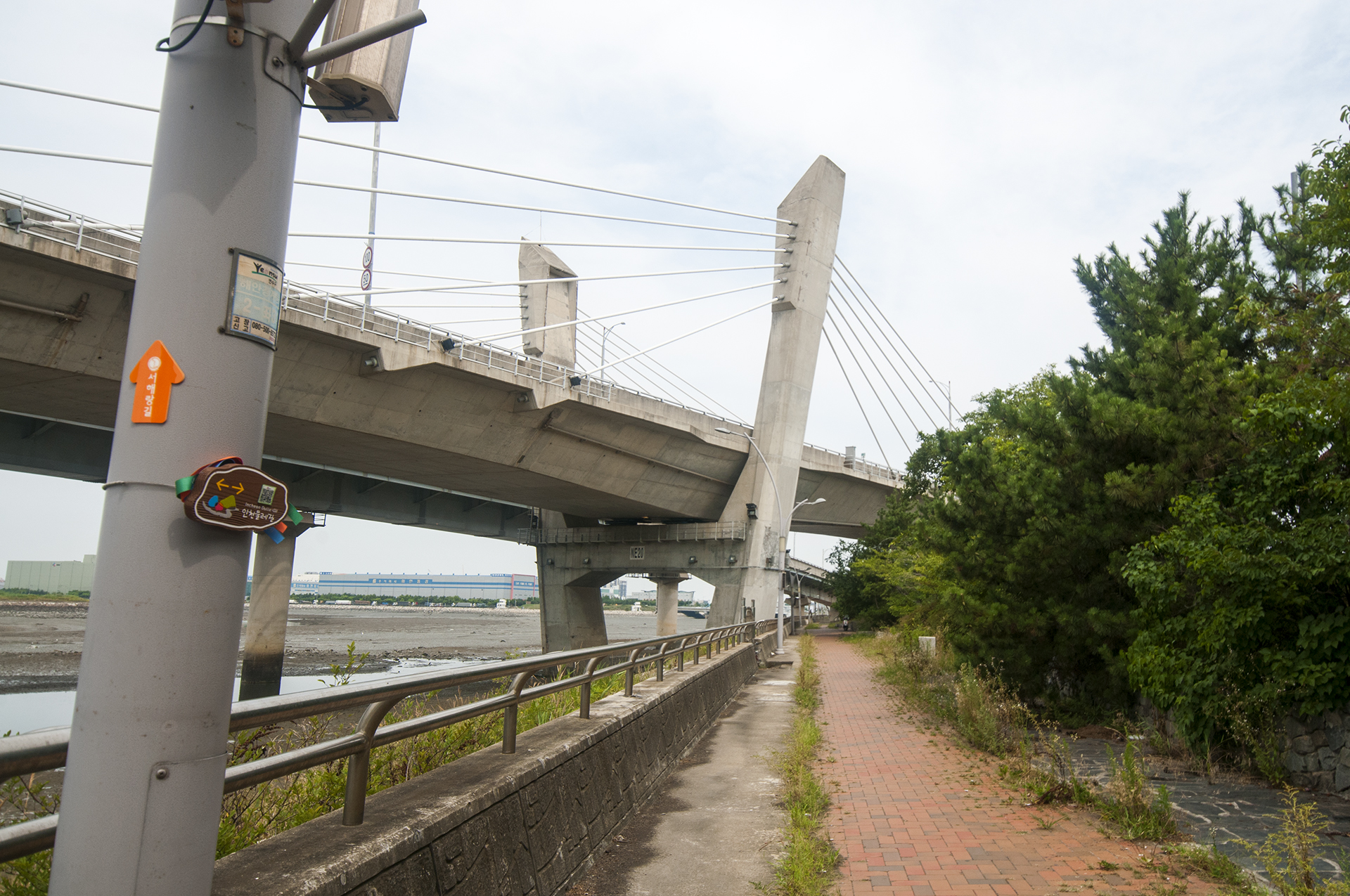 빛바랜 둘레길 이정표가 교각 기둥에 붙어 있다.