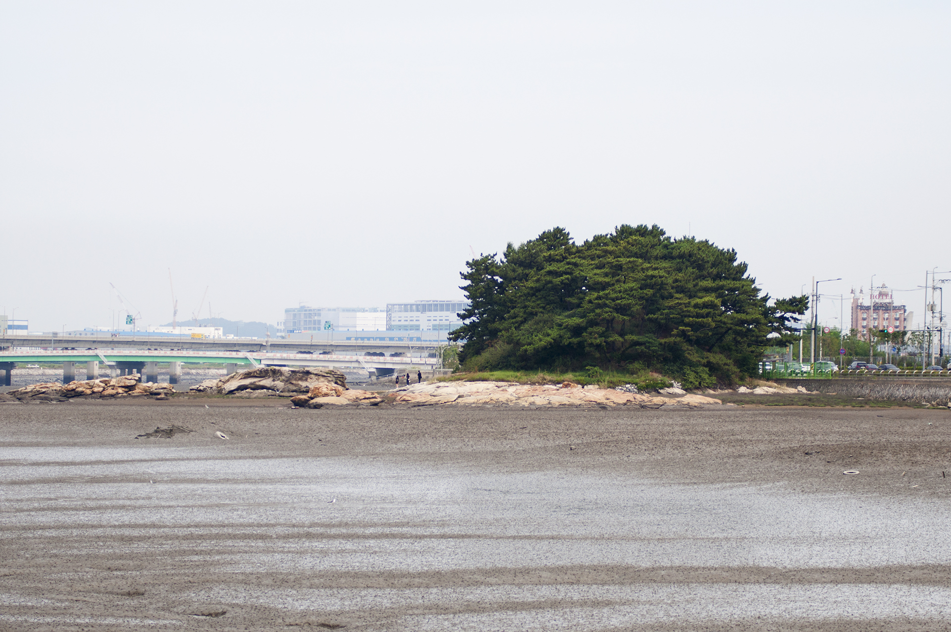 바위섬과 갯벌, 그 너머로 보이는 송도의 건물들~