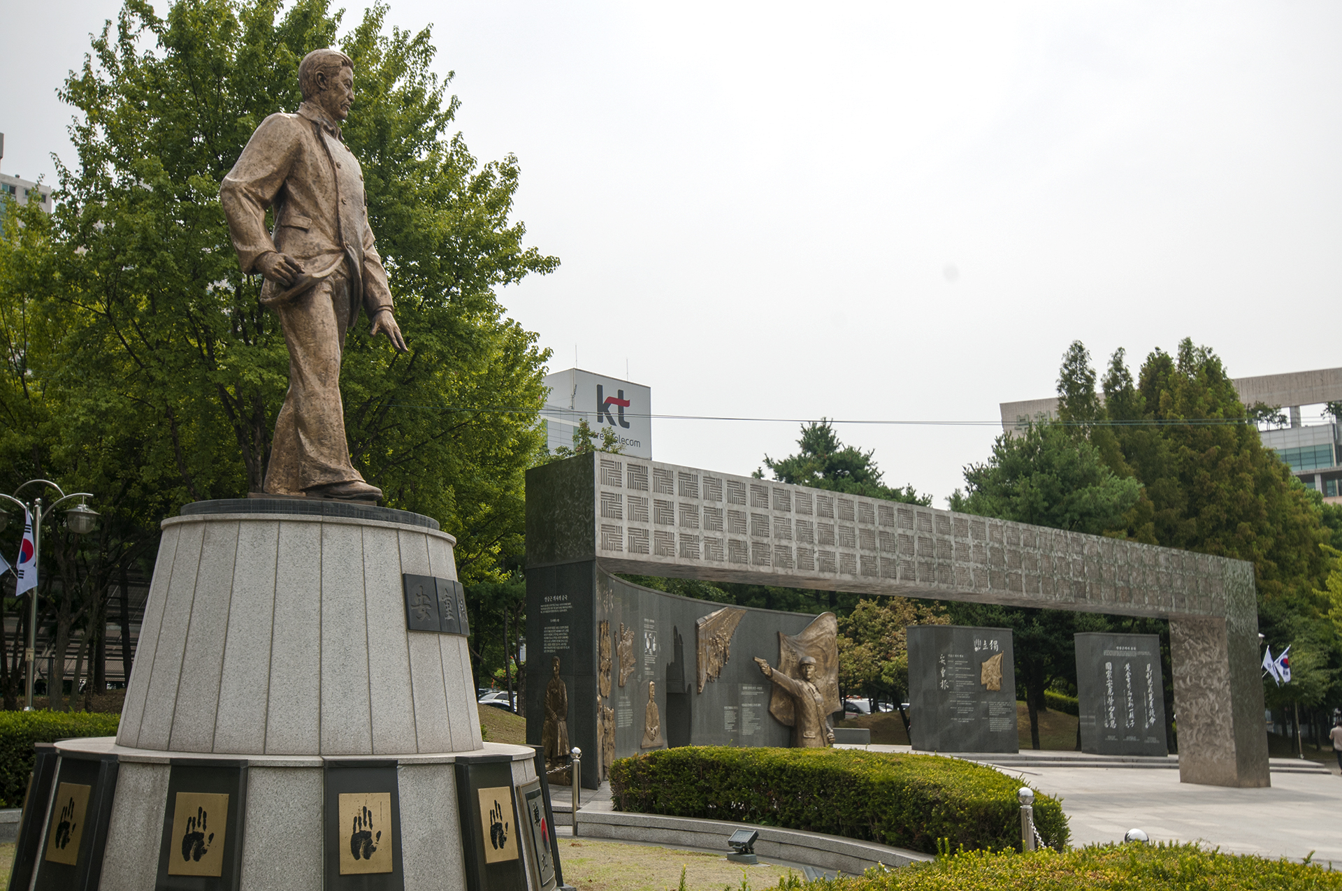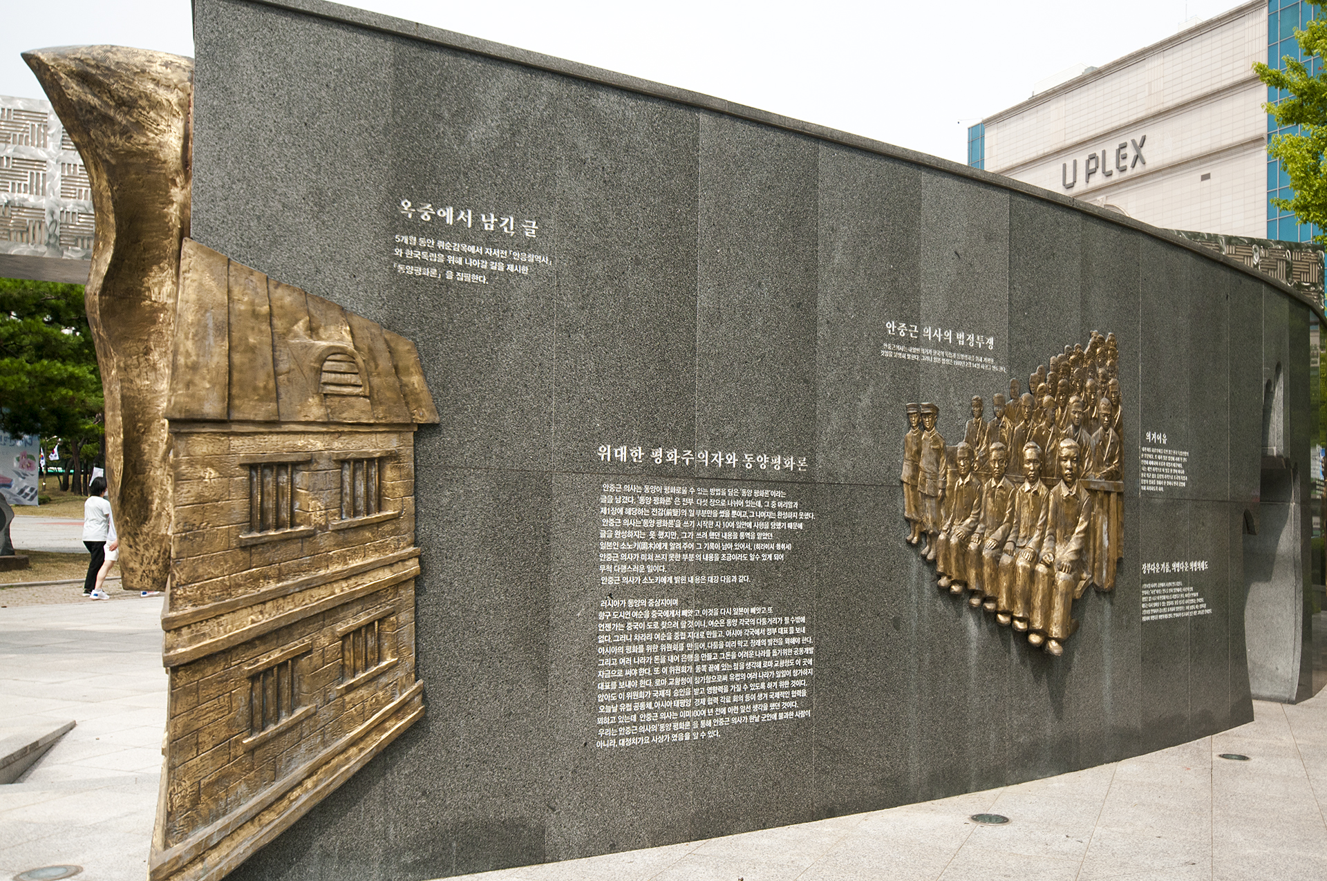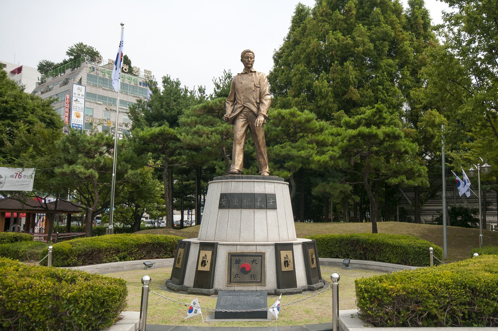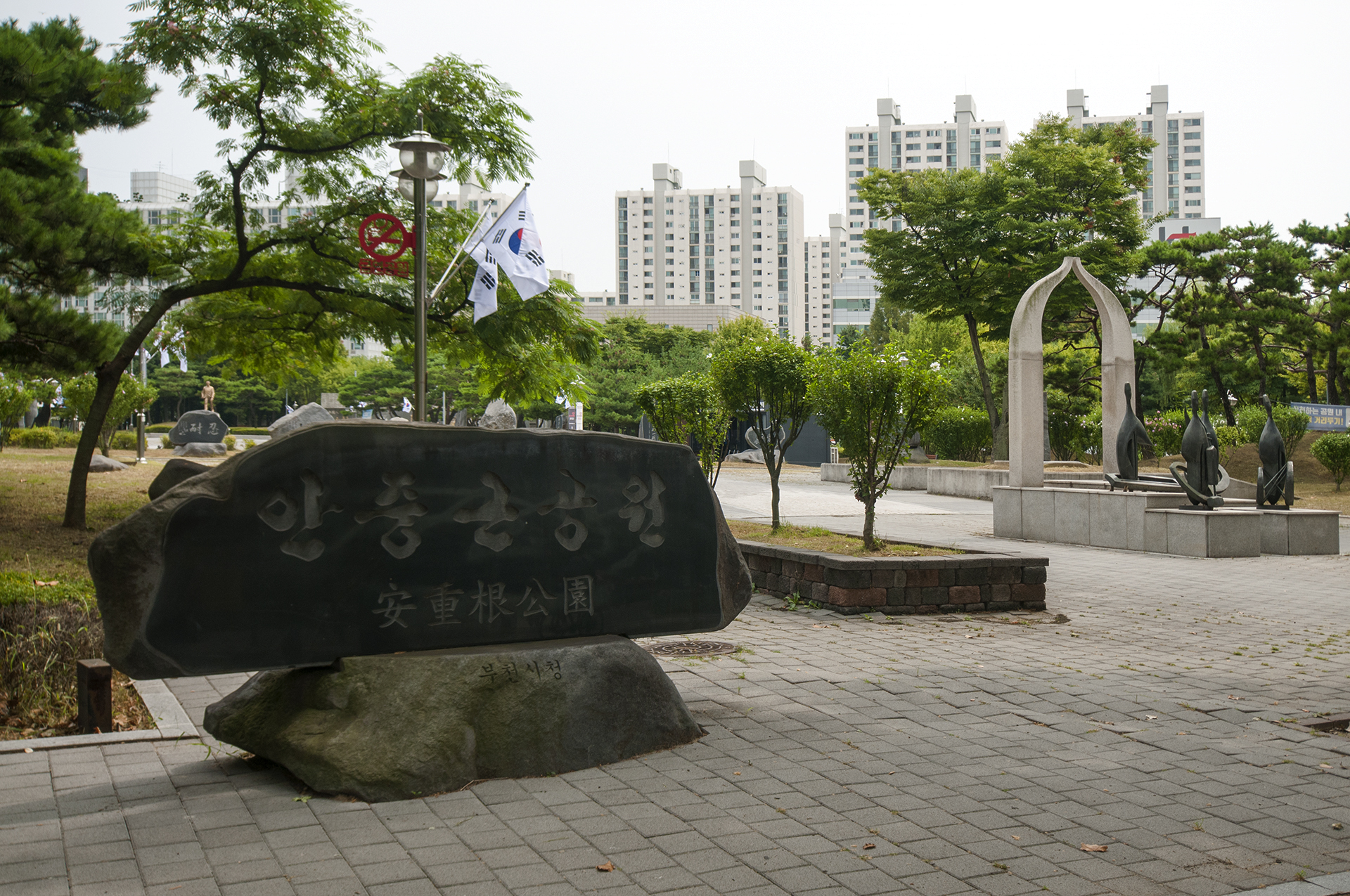 입구에서 바라본 조형물과 뒤로 보이는 안중근 의사 동상.