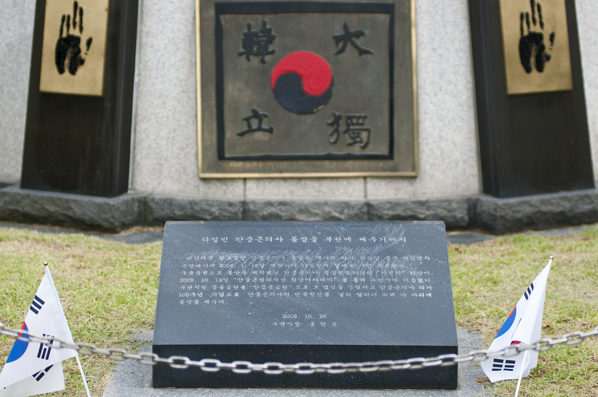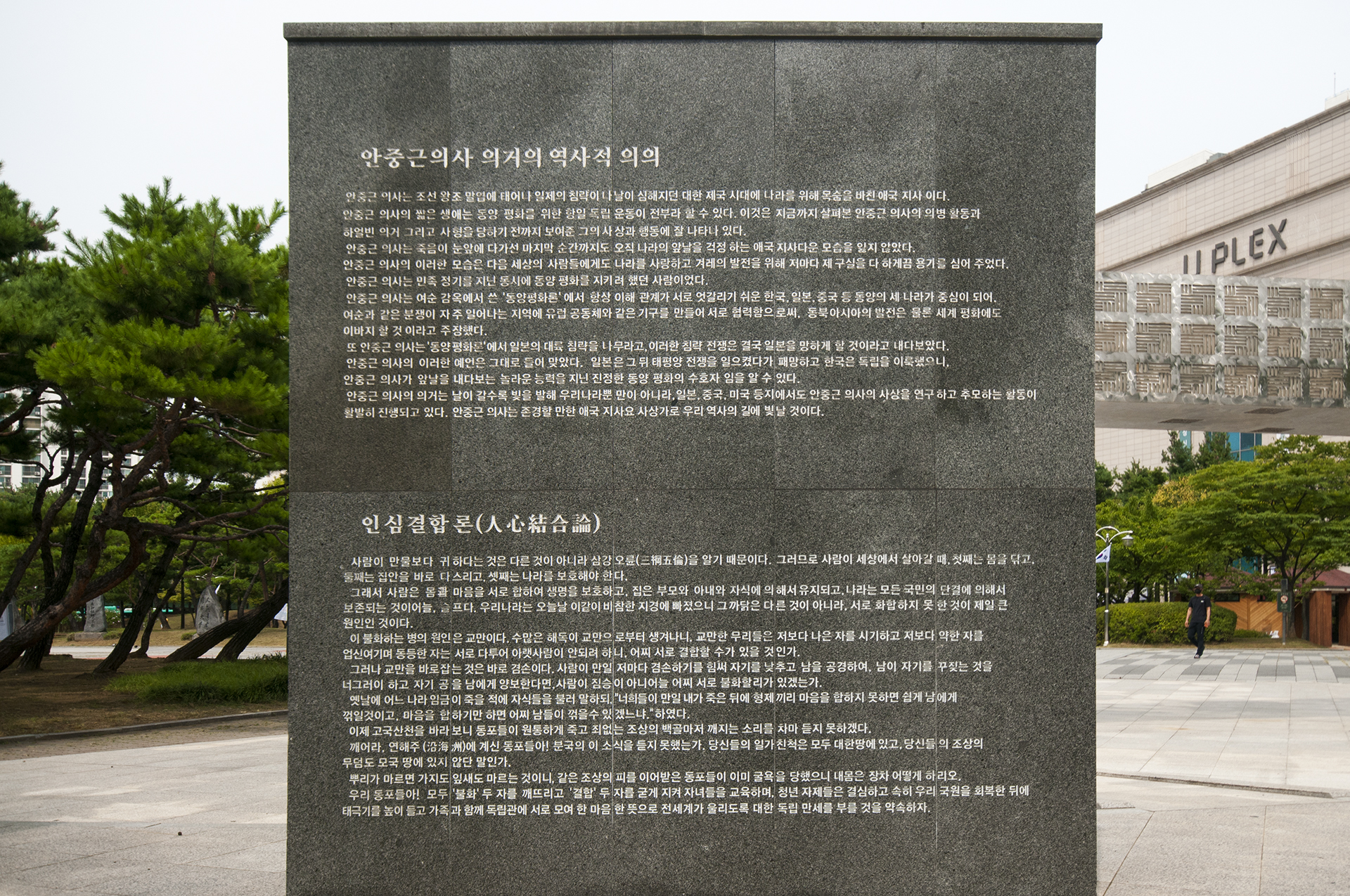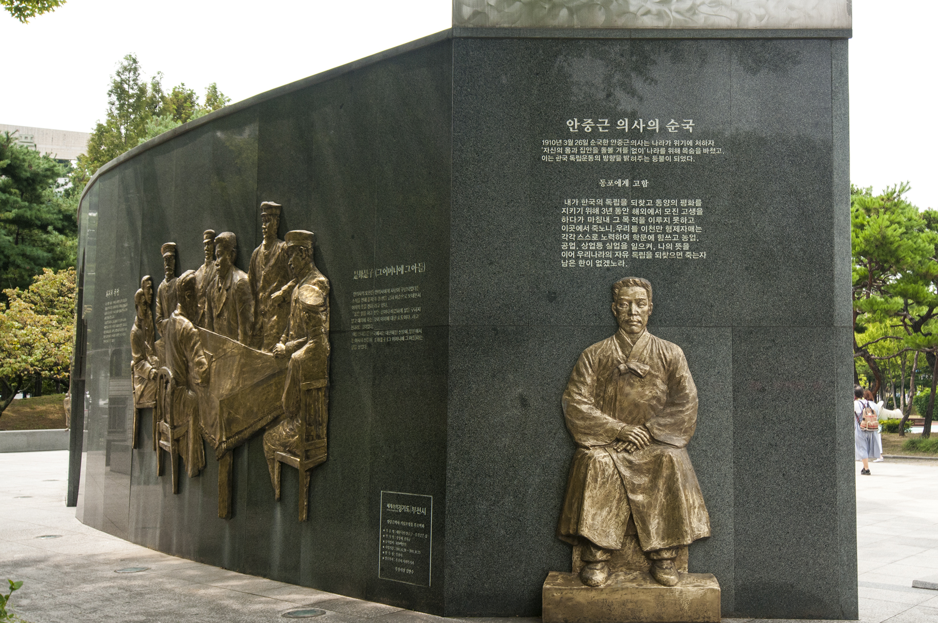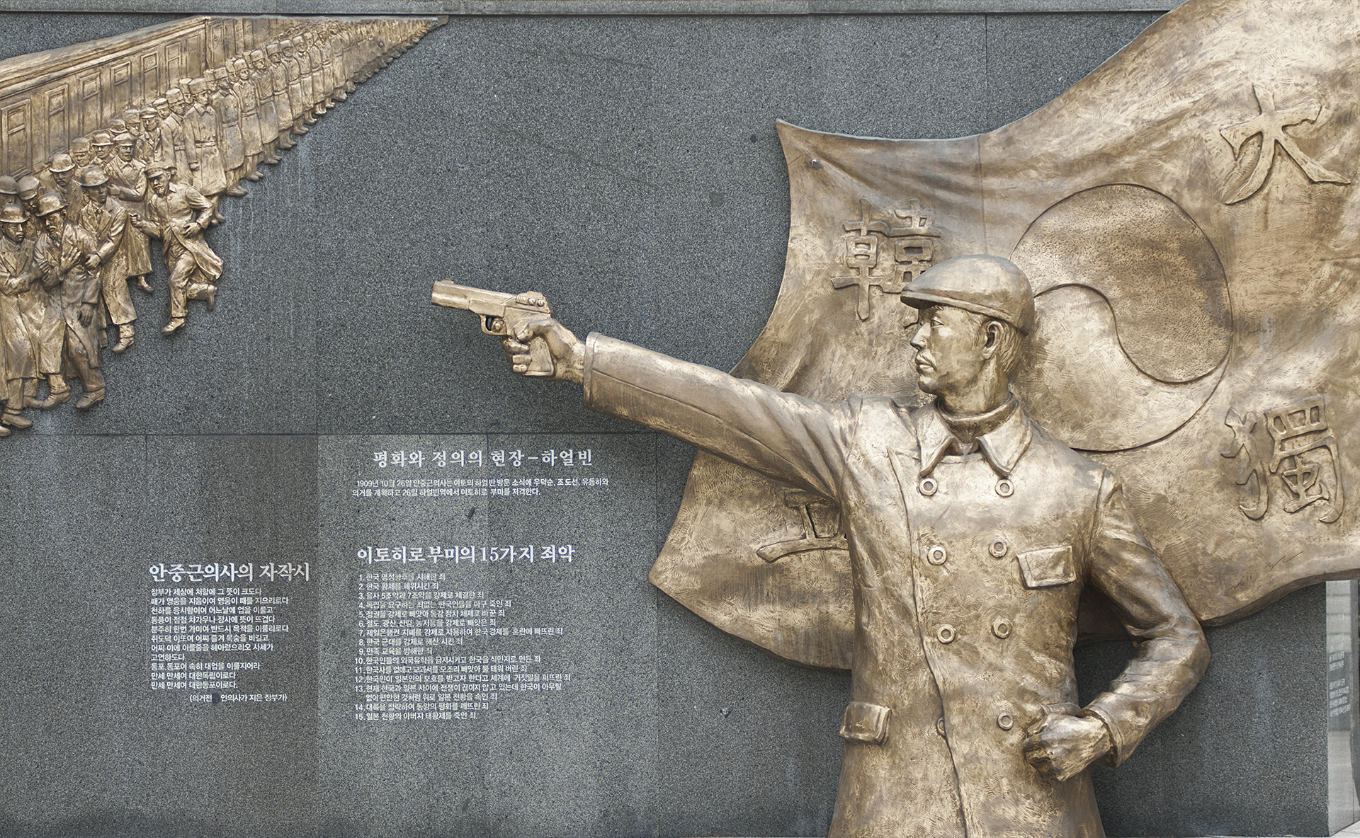 입구에서 바라본 조형물과 뒤로 보이는 안중근 의사 동상.