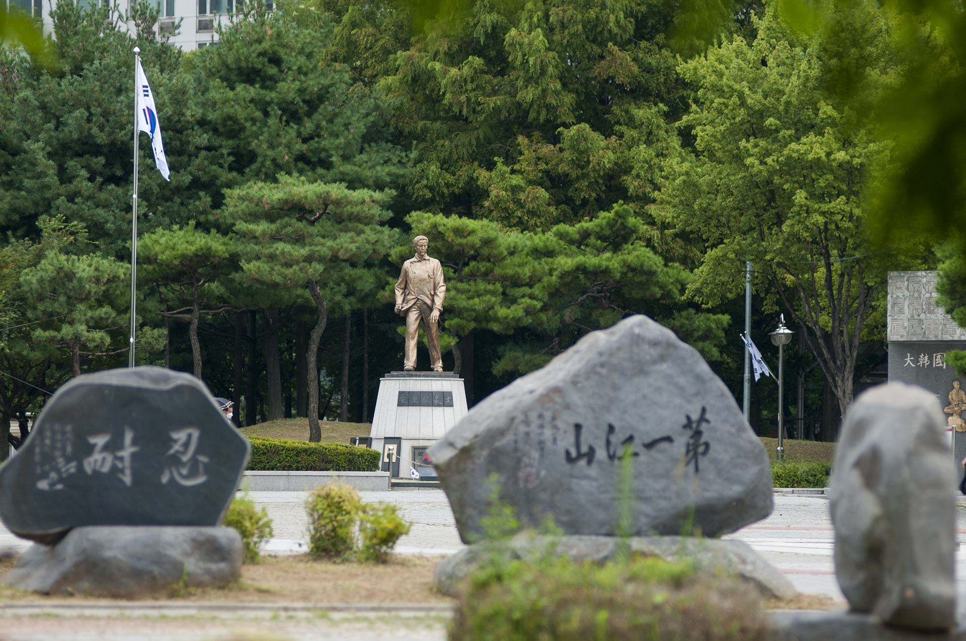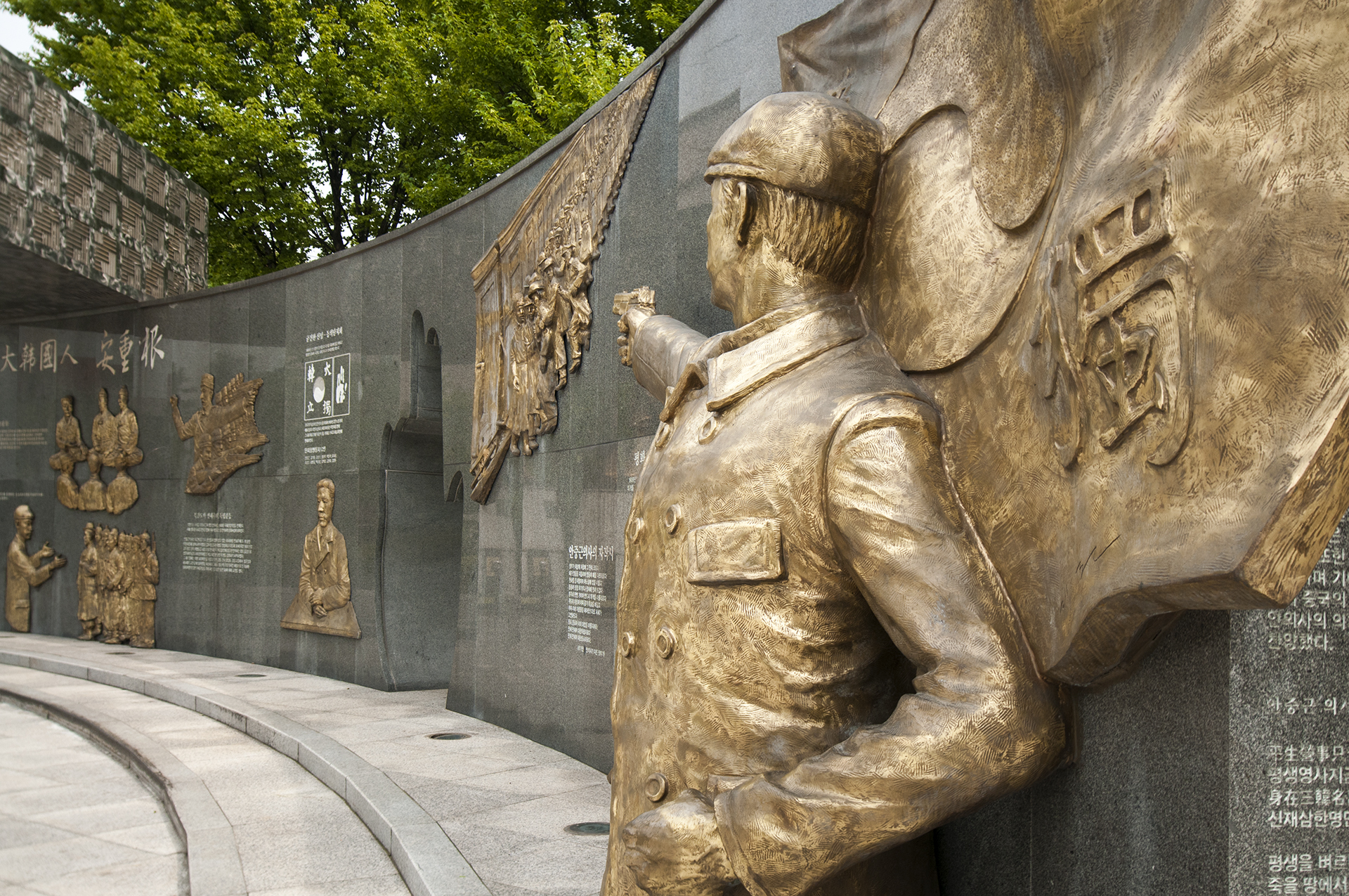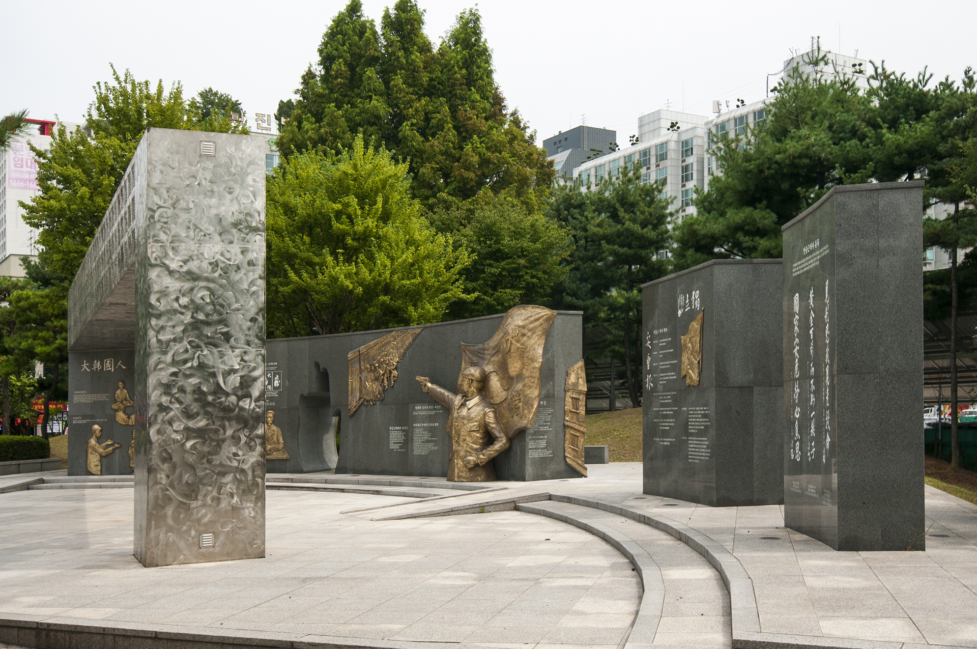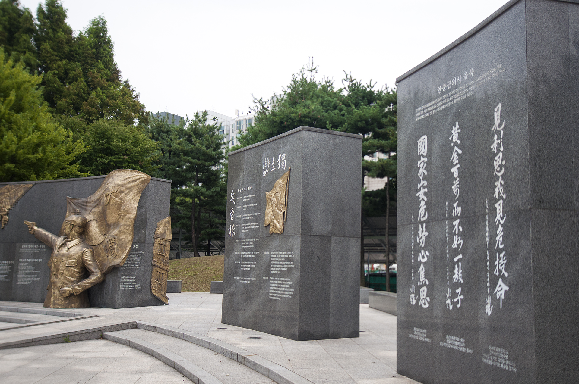 입구에서 바라본 조형물과 뒤로 보이는 안중근 의사 동상.