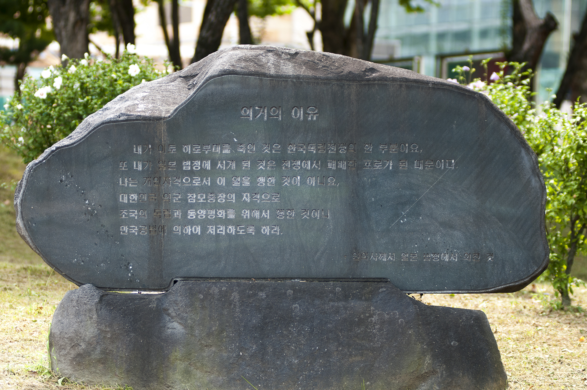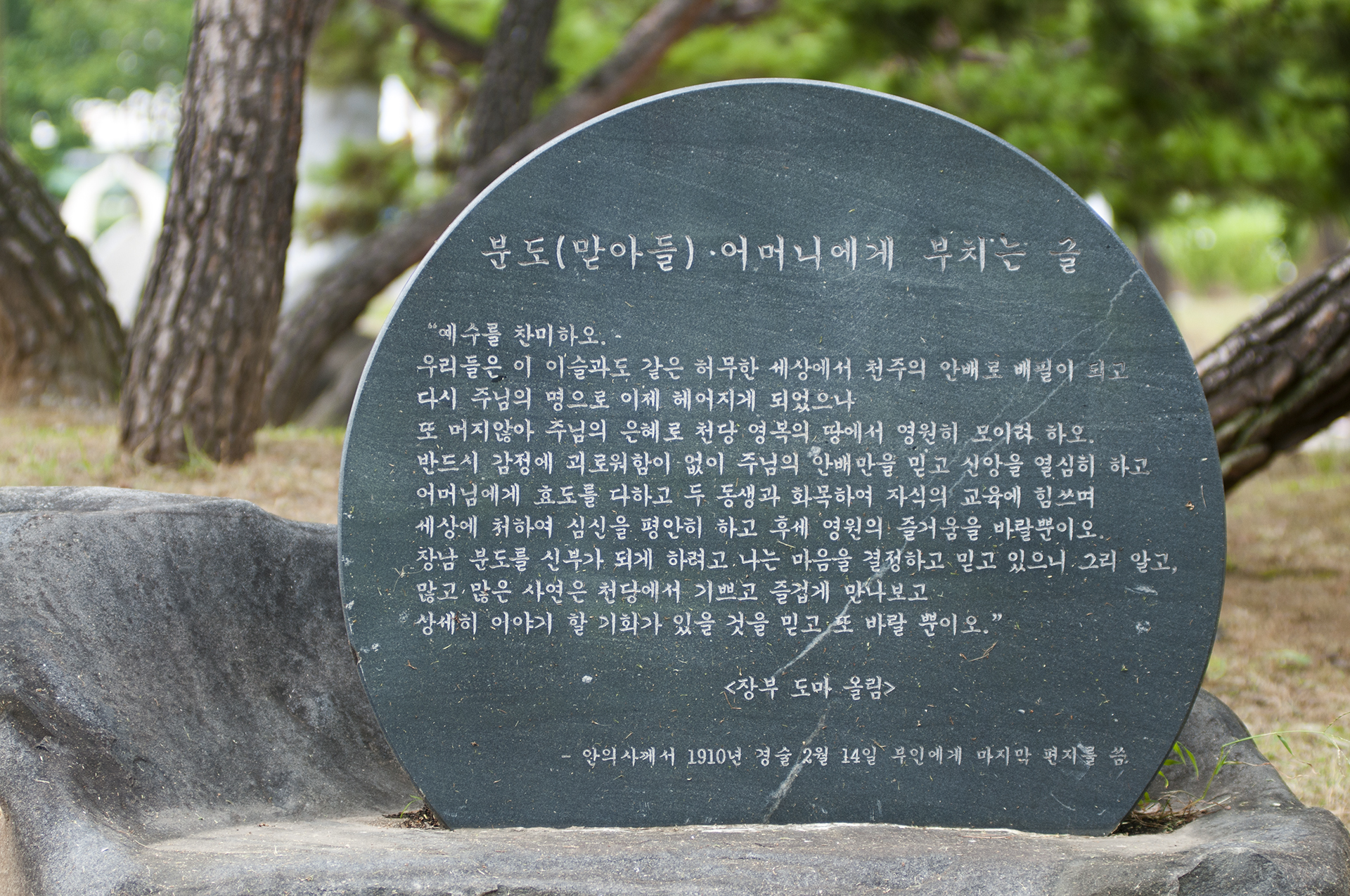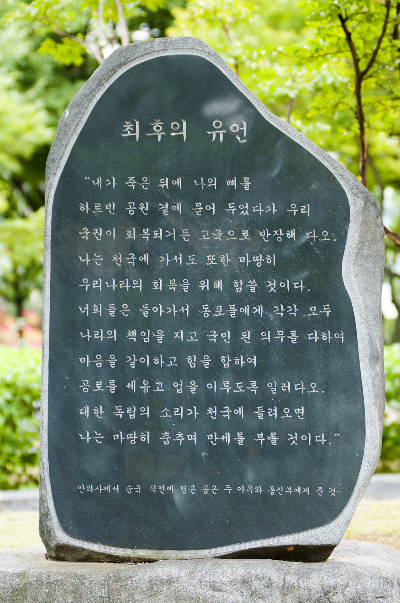 "내가 죽은 뒤에 나의 뼈를 하르빈 공원 곁에 묻어 두었다가 우리 국권이 회복되거든 고국으로 반장해 다오."