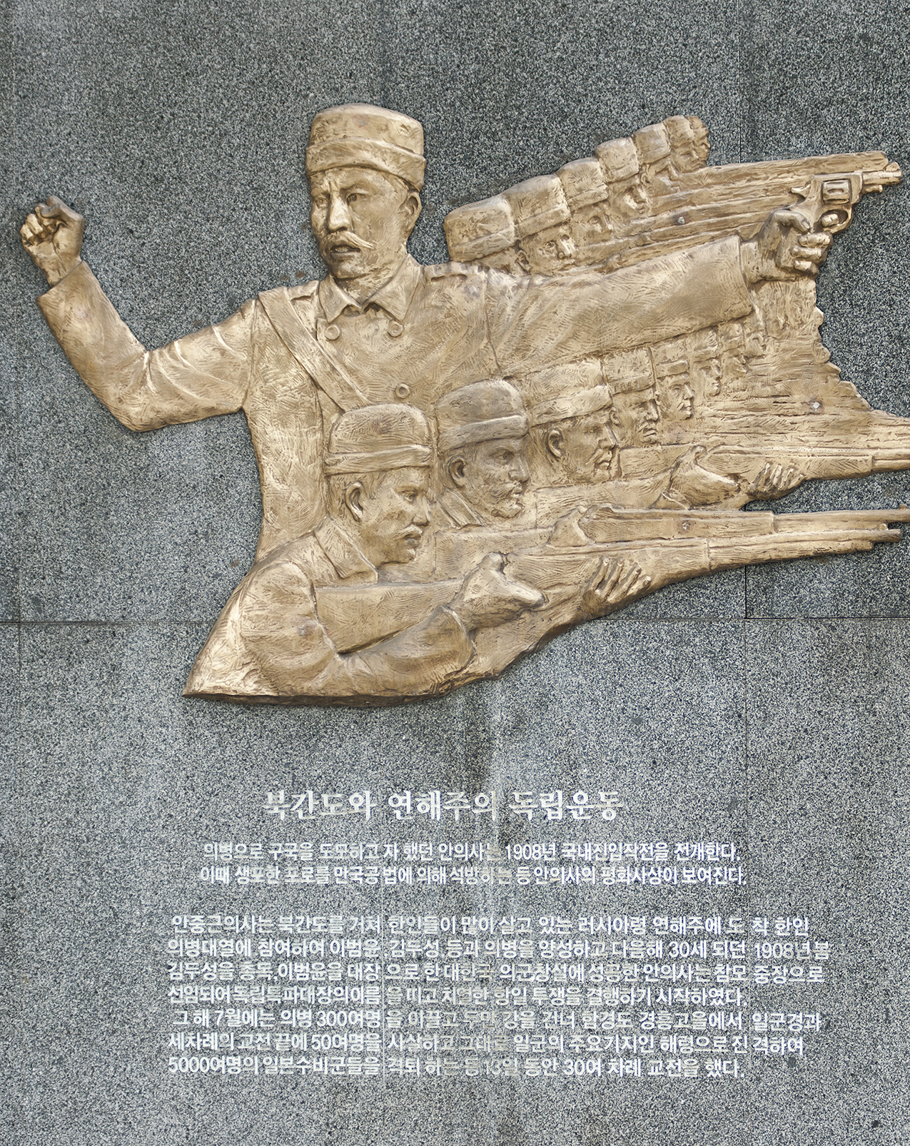 안중근의사는 북간도를 거쳐 한인들이 많이 살고 있는 러시아령 연해주에 도착, 한인 의병대열에 참여하여 이범윤, 김두성 등과 의병을 양성하고, 다음해 30세 되던 1908년 봄 김두성을 총독, 이범윤을 대장으로 한 대한국 의군창설에 성공한 안의사는 참모 중장으로 선임되어 독립특파애장의 이름을 띠고 치열한 항일 투쟁을 결행하기 시작하였다.
