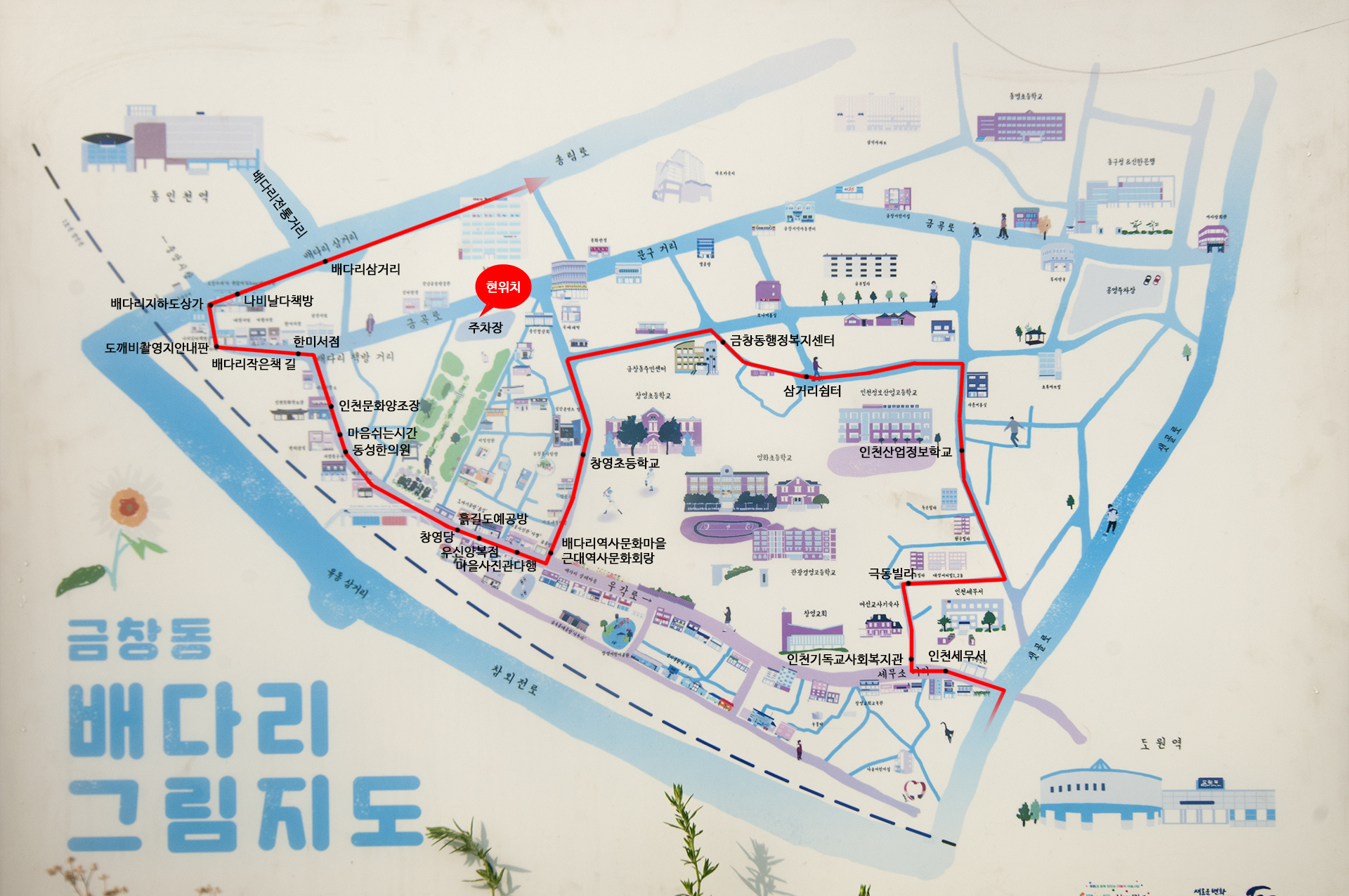* 배다리 헌책방거리 공공주차장까지는 동인천역에서 약630m 거리로 걸어서 10분정도 소요된다.