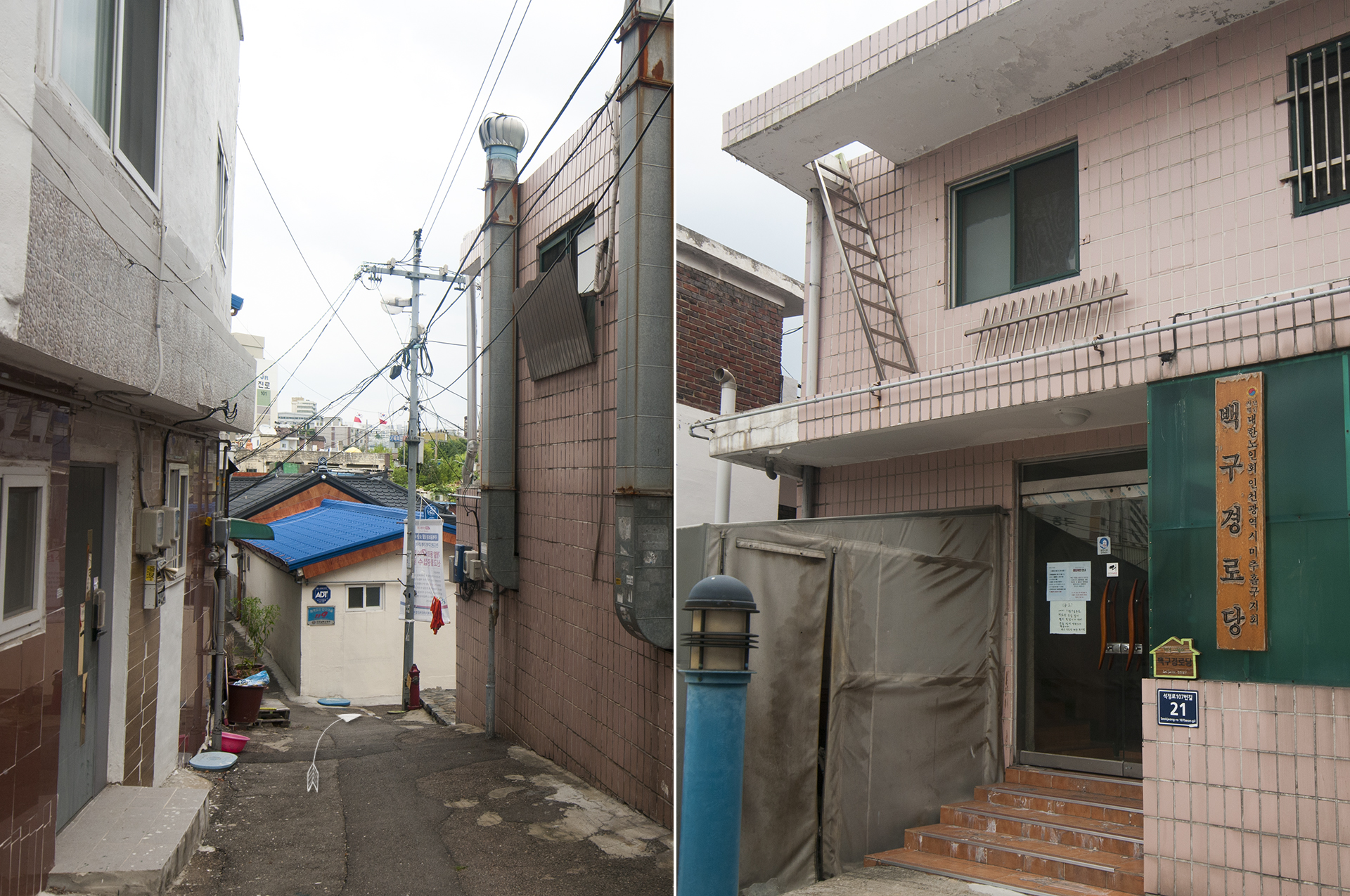 좌측 사진에 보이는 건물벽이 바로 백구경로당이다. 이곳에서 우측길로 들어서면 경로당 앞에 도착,