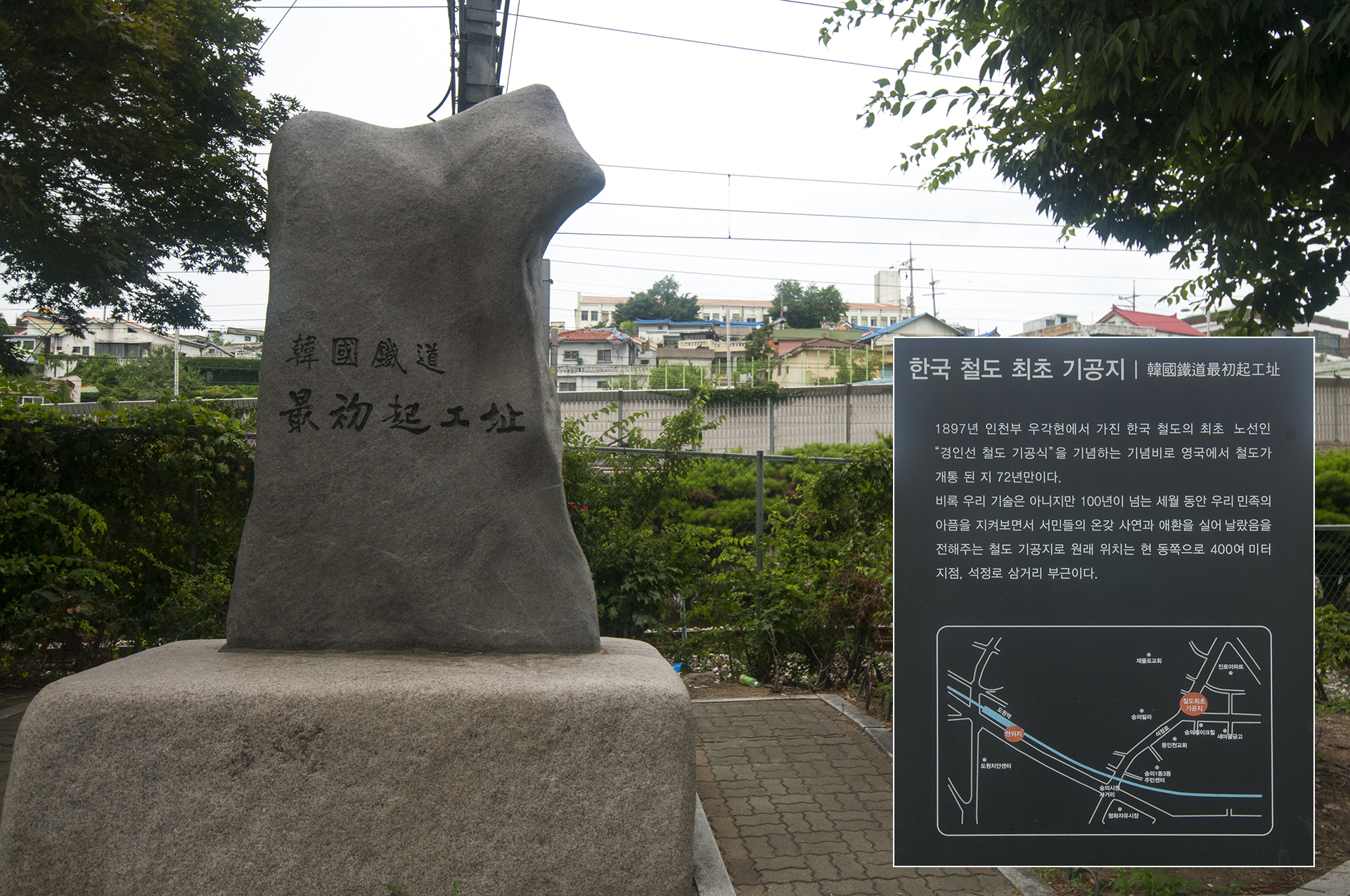 이곳은 우리나라 첫 철도인 경인철도를 기공한 터로, 우리나라 철도는 고종 황제로부터 부설권을 받은 미국인 모스가 1897년 건양2년 3월22일 이곳 인천부 우각현 지금의 도원역 일대에서 철도 공사를 시작한데서 비롯한다.