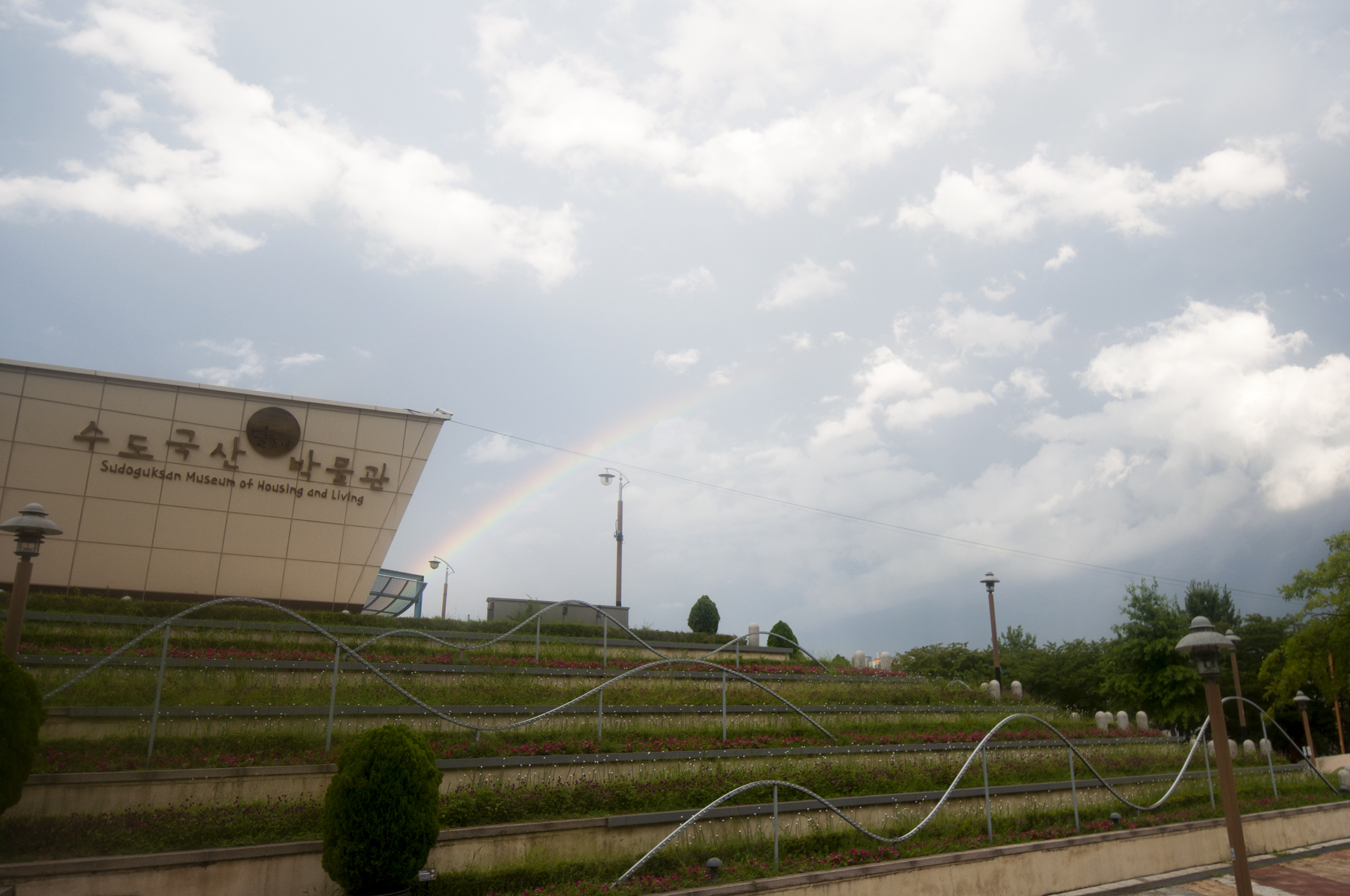 아직은 조금씩 빗방울이 떨어지는 상태지만 다시 해가 나오면서 반대쪽 하늘에 무지개가 그려졌다.