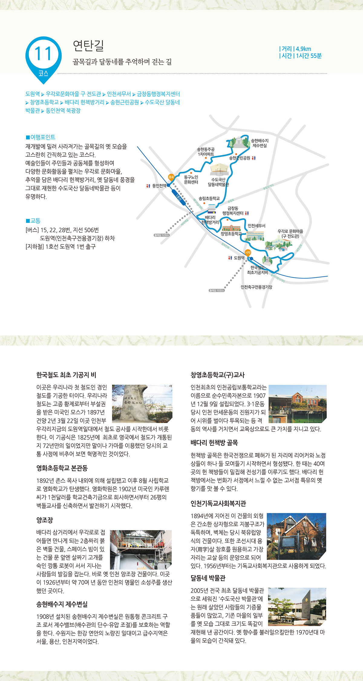 * 11코스만 걸을경우 주차지점 복귀방법 : 동인천역 - 전통혼수거리 - 배다리지하상가 - 헌책방거리 - 주차장 (약630m, 도보10분 소요)