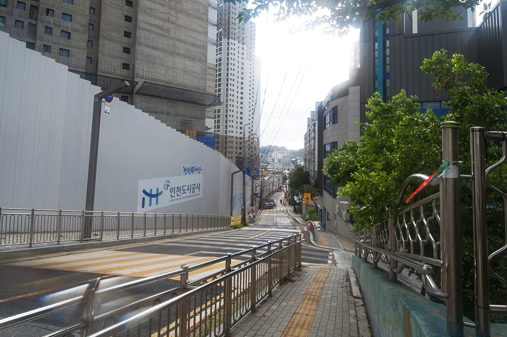왼편에 아파트 공사중인 내리막길을 따라 저 길 끝까지 가면 된다.