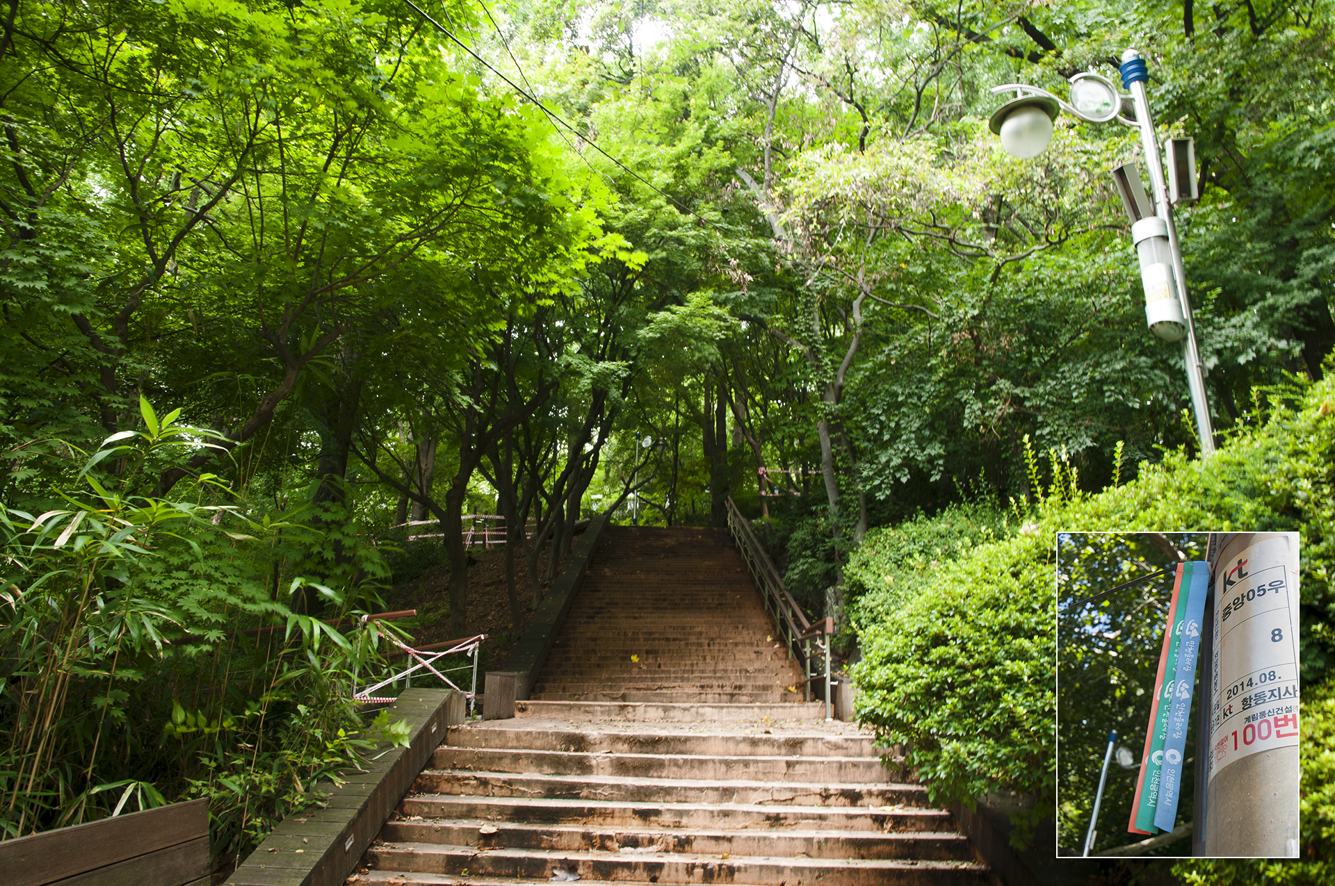 플라타너스 앞 길로 들어선후 계단을 올라가는 둘레길 코스가 이어진다.