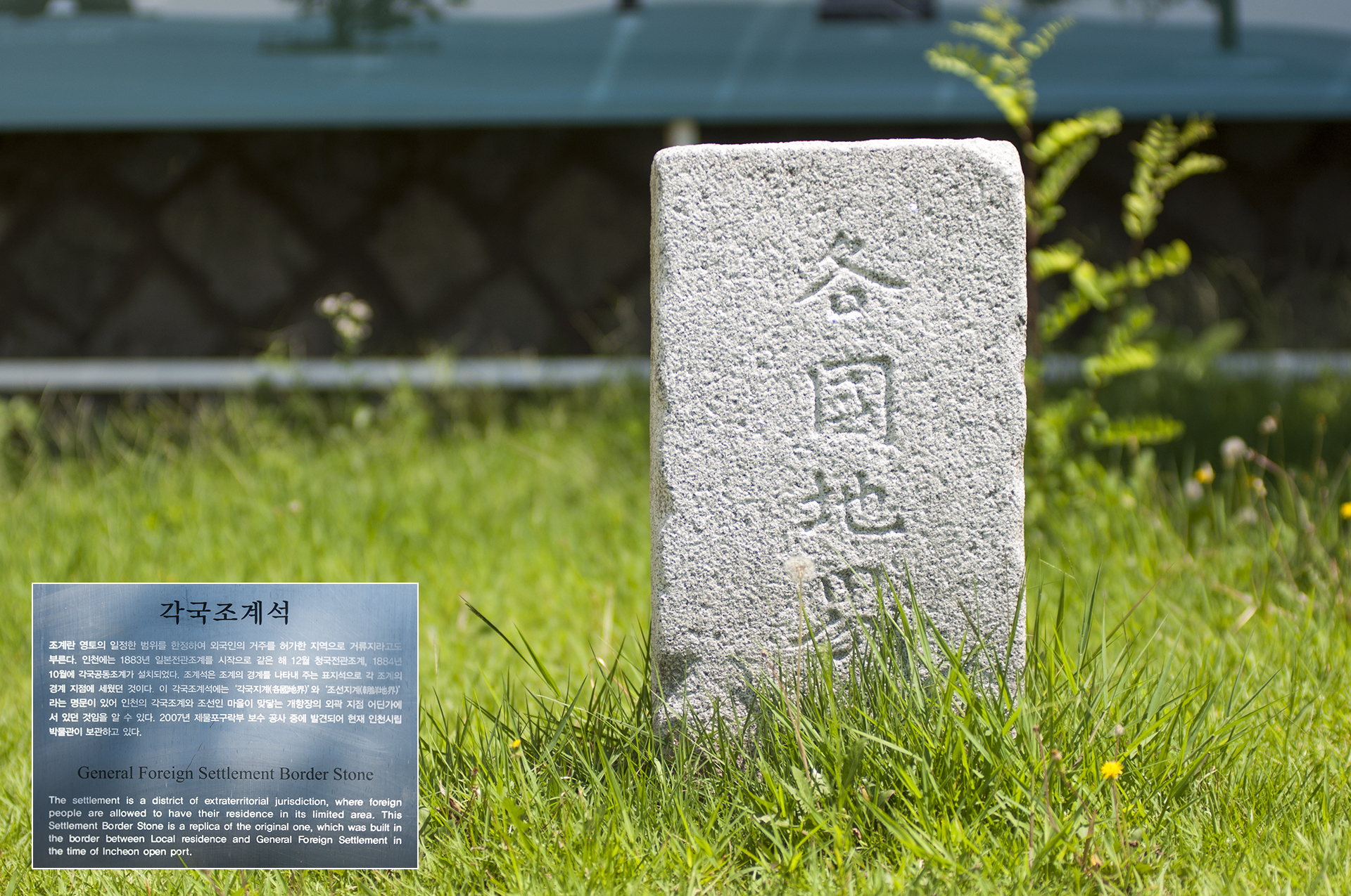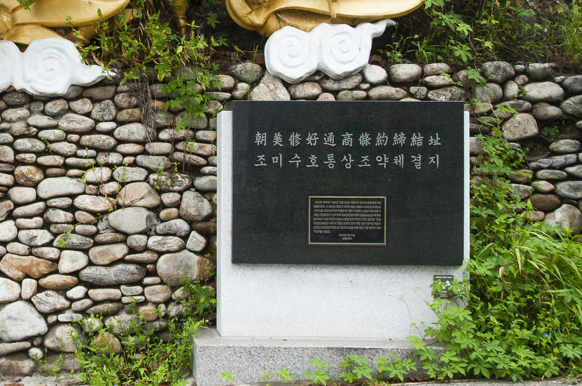1882년 5월22일 조선이 서구와 최초로 맺은 조미수호통상조약 체결지가 자유공원 입구인 이곳에서 실제로 체결되었음이 2013년에 밝혀지면서 인천시는 역사적 오류를 바로잡기 위해 여기에 비를 세우게 되었다.